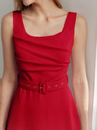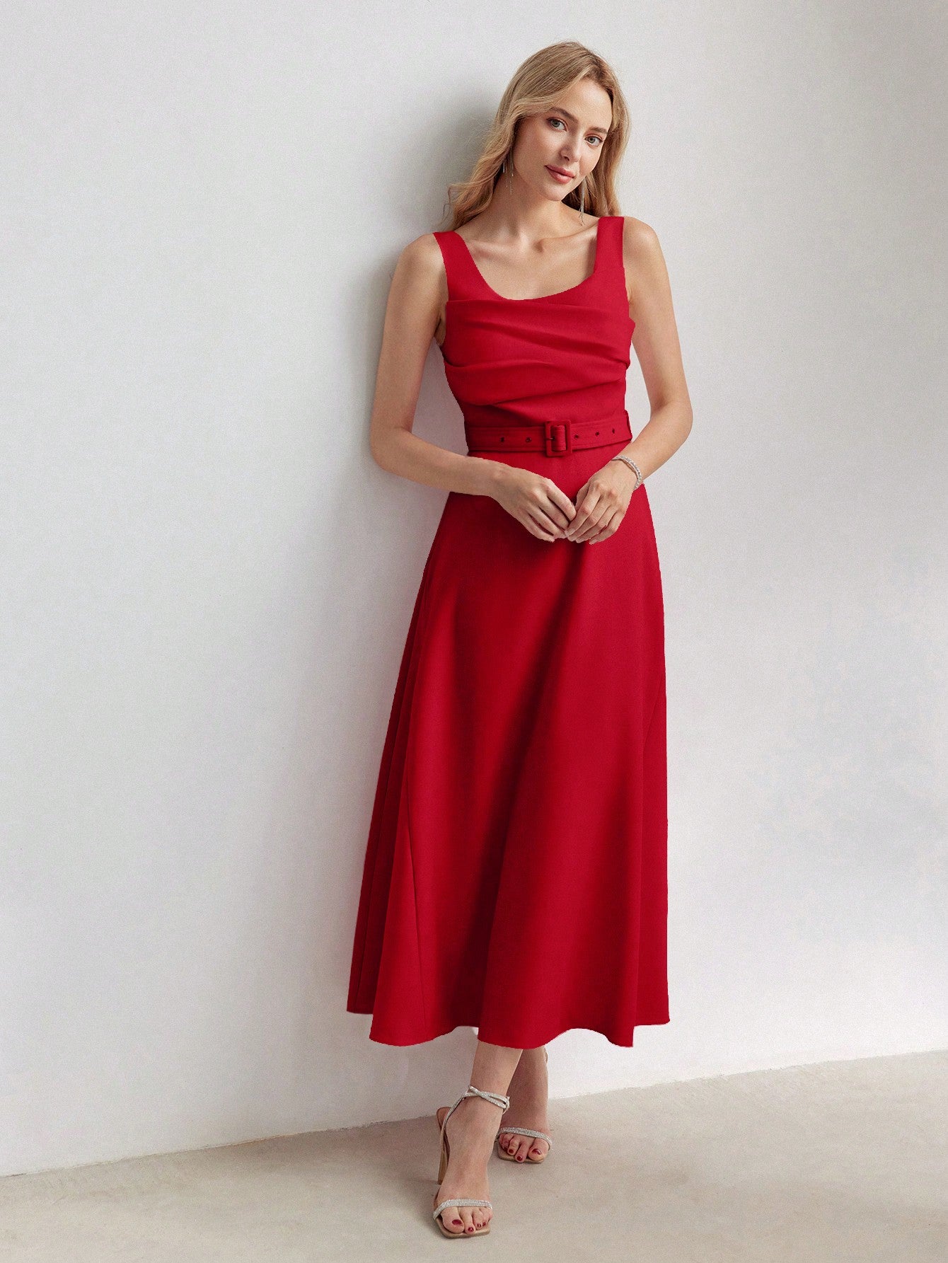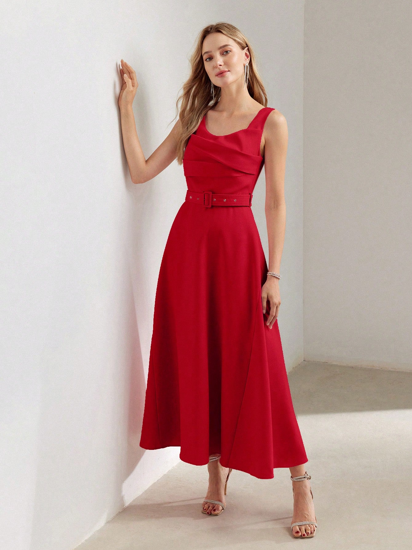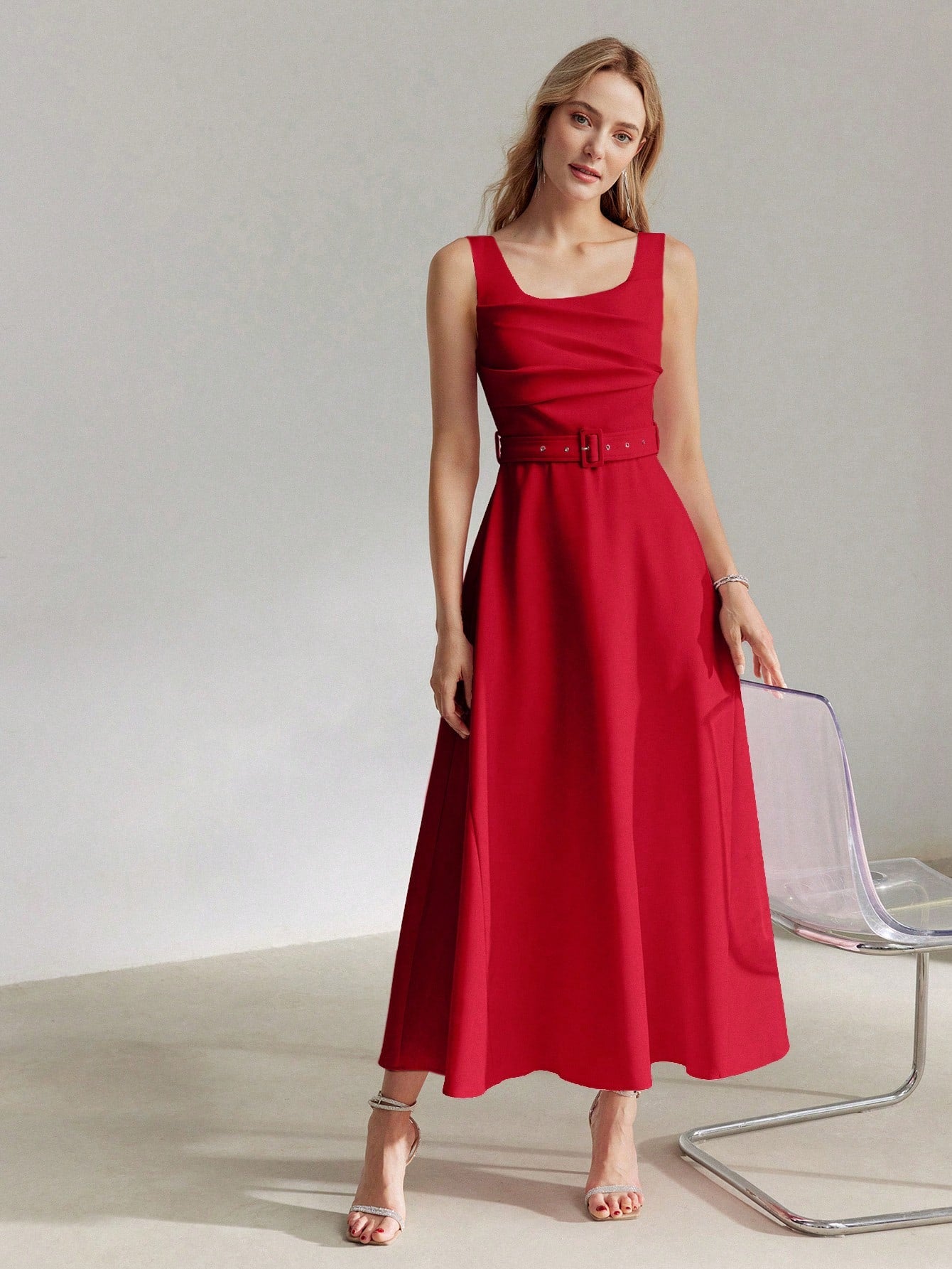 women MOTF PREMIUM SOLID RUCHED BODICE FLARE HEM BUCKLE BELTED LONG DRESS