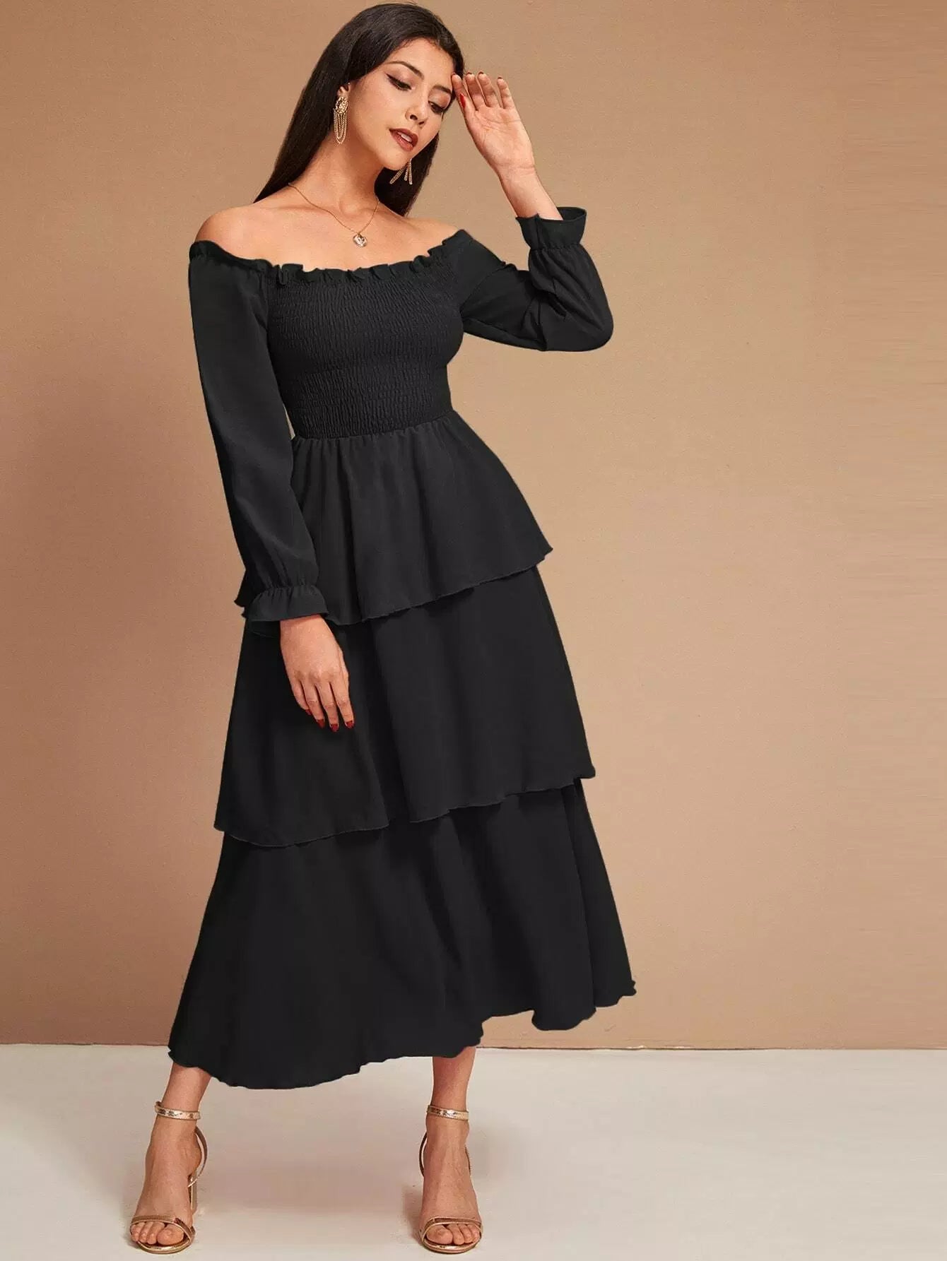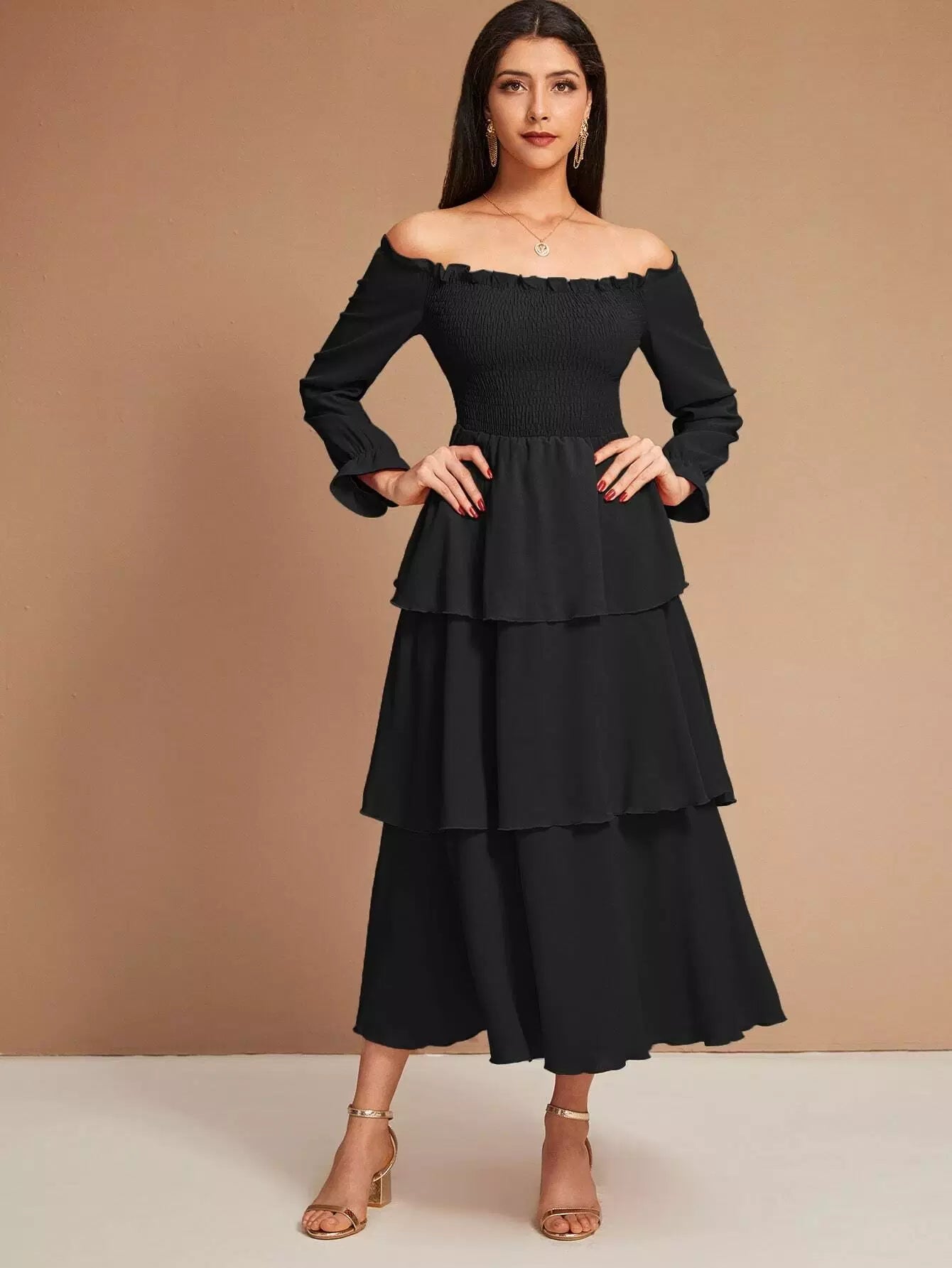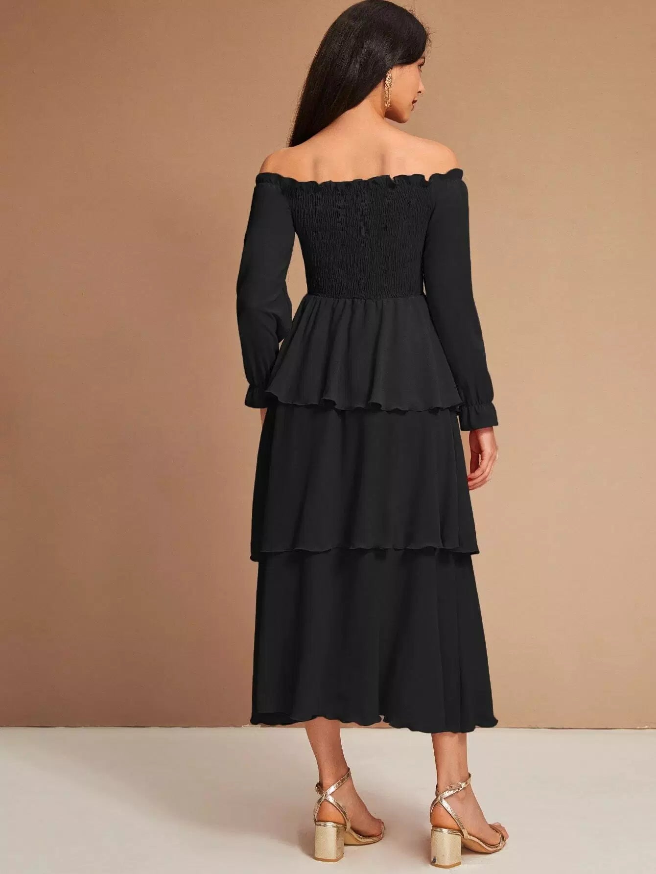 Women - Off Shoulder Frill Trim Shirred Layered Dress