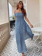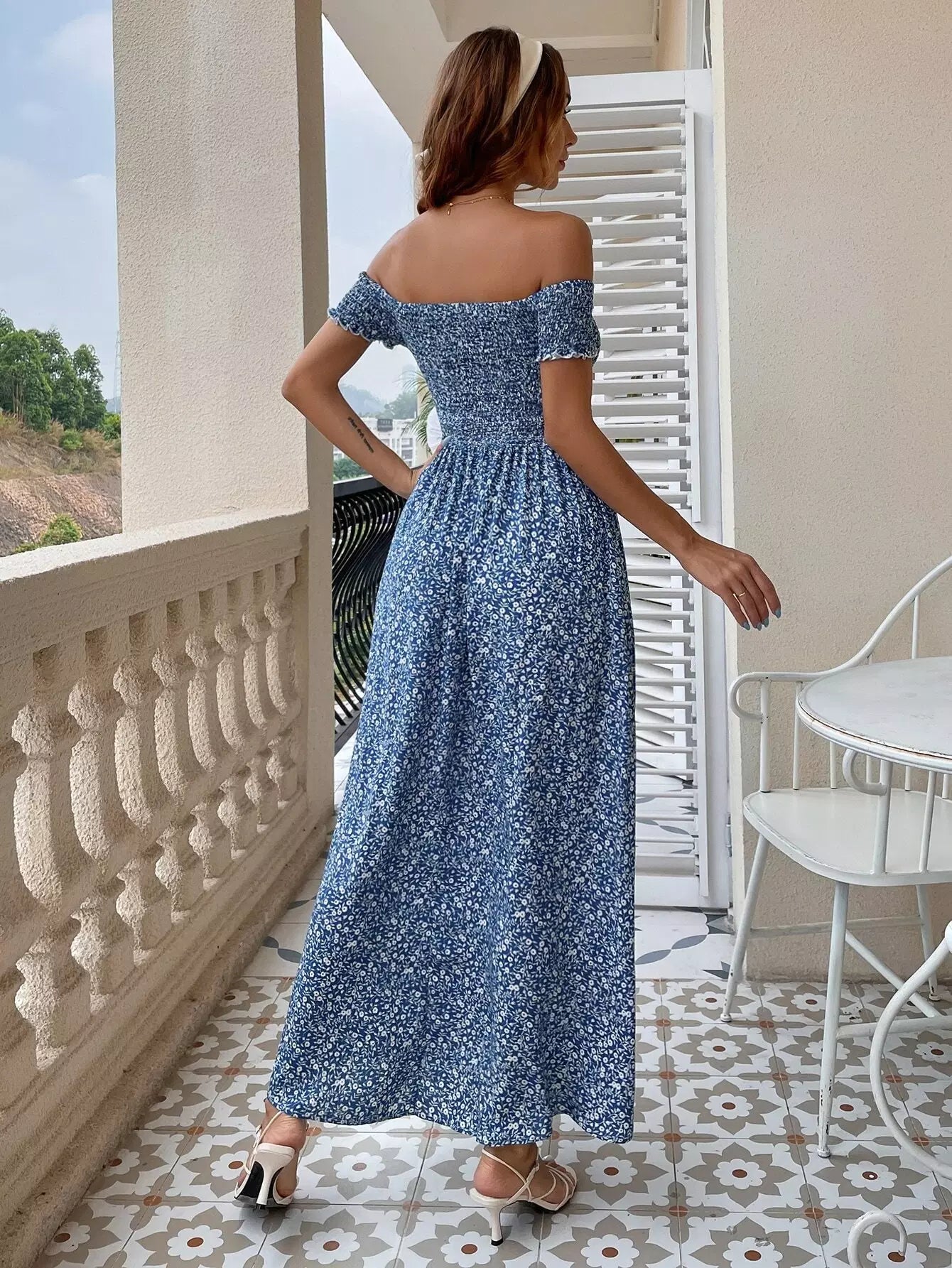 Off Shoulder Shirred Bodice M-slit Hem Ditsy Floral Dress