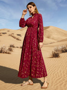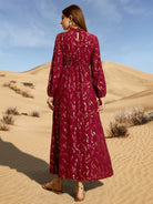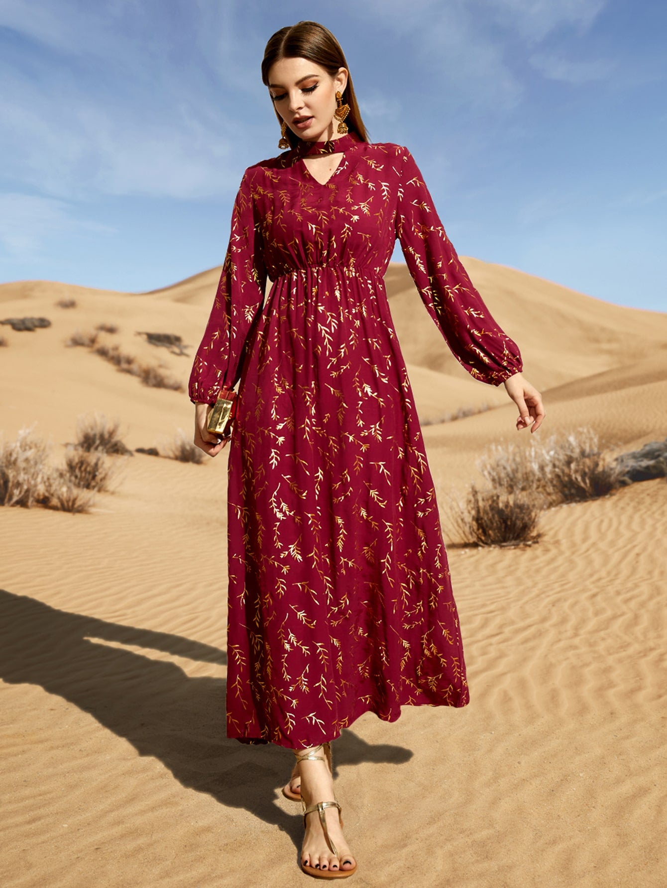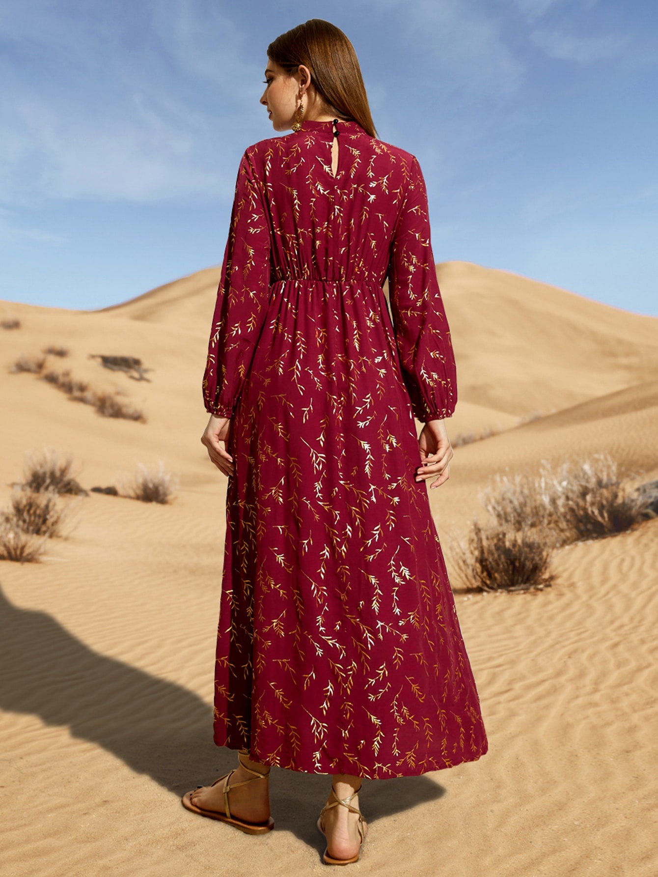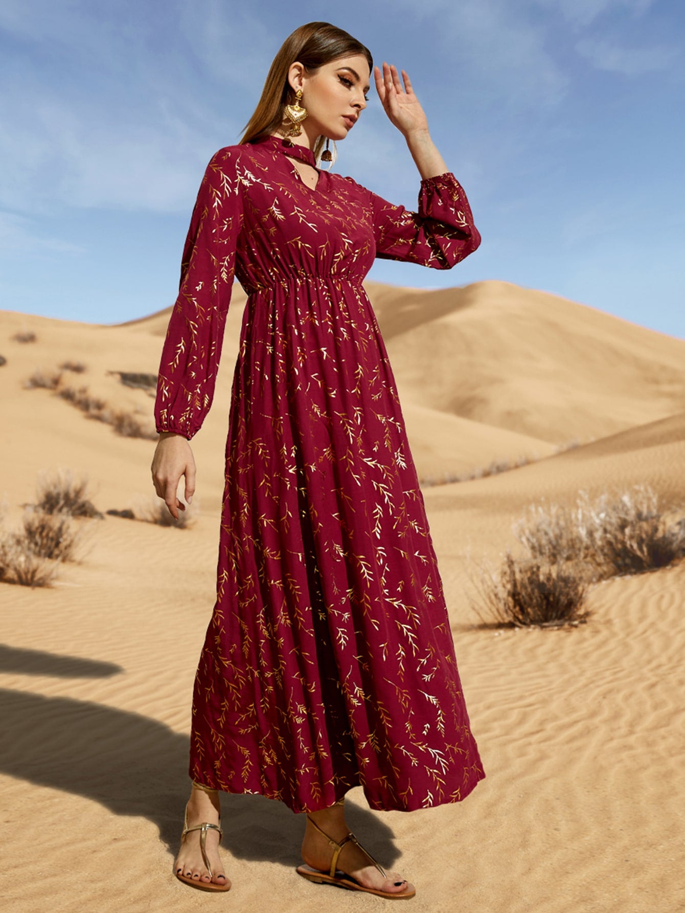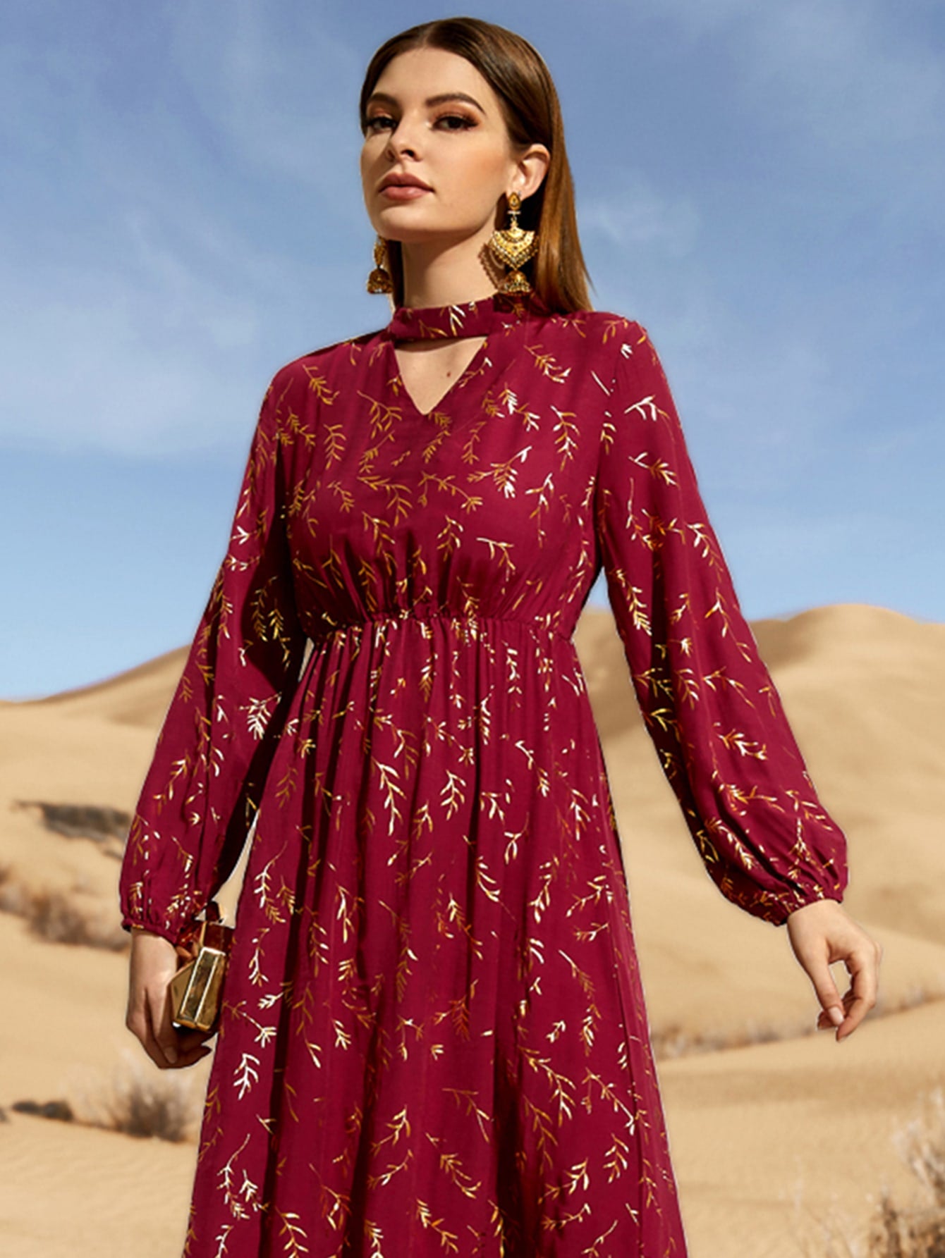 Keyhole Neck Bishop Sleeve Gold Plants Print Dress