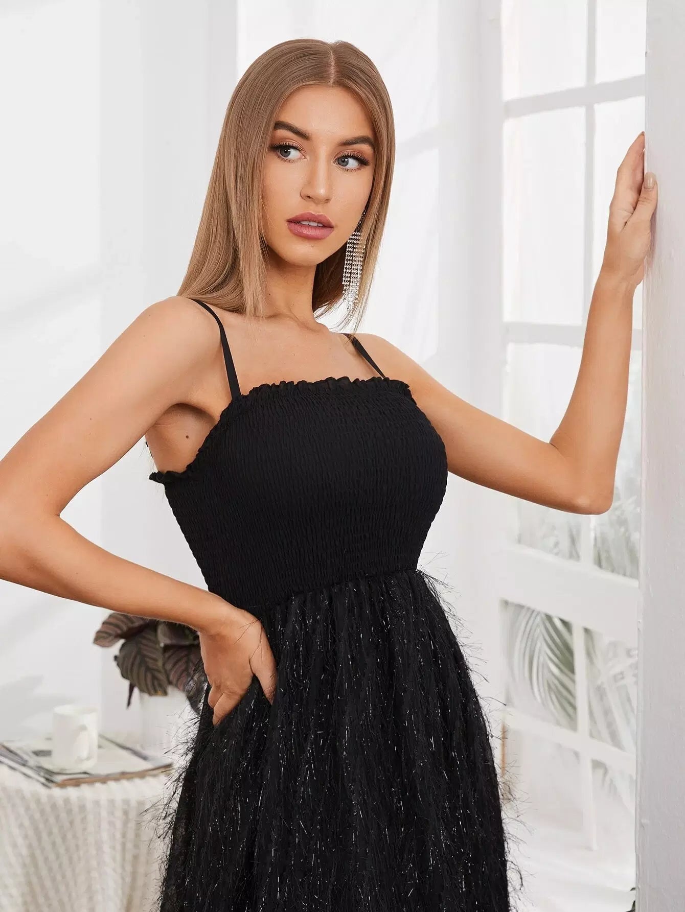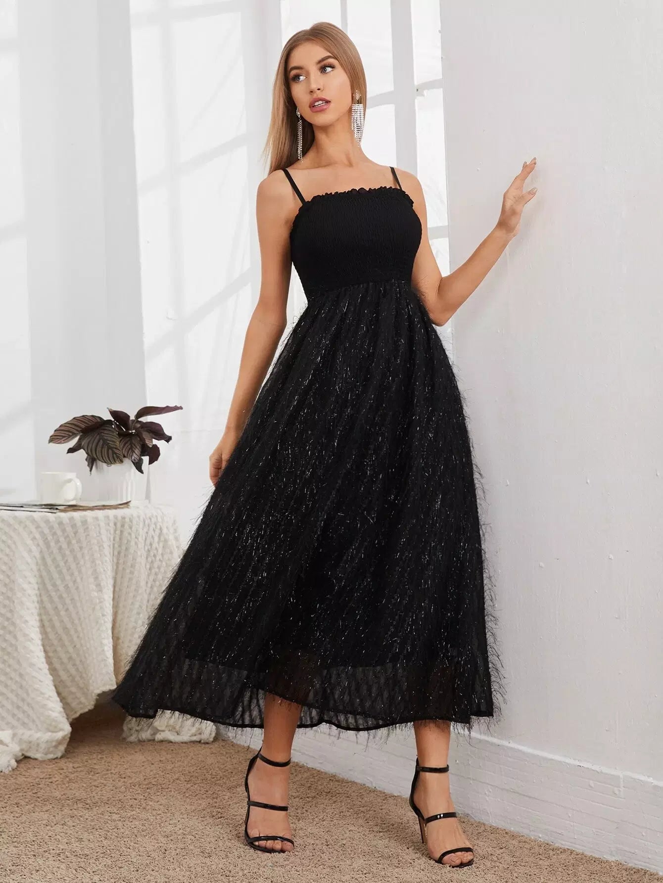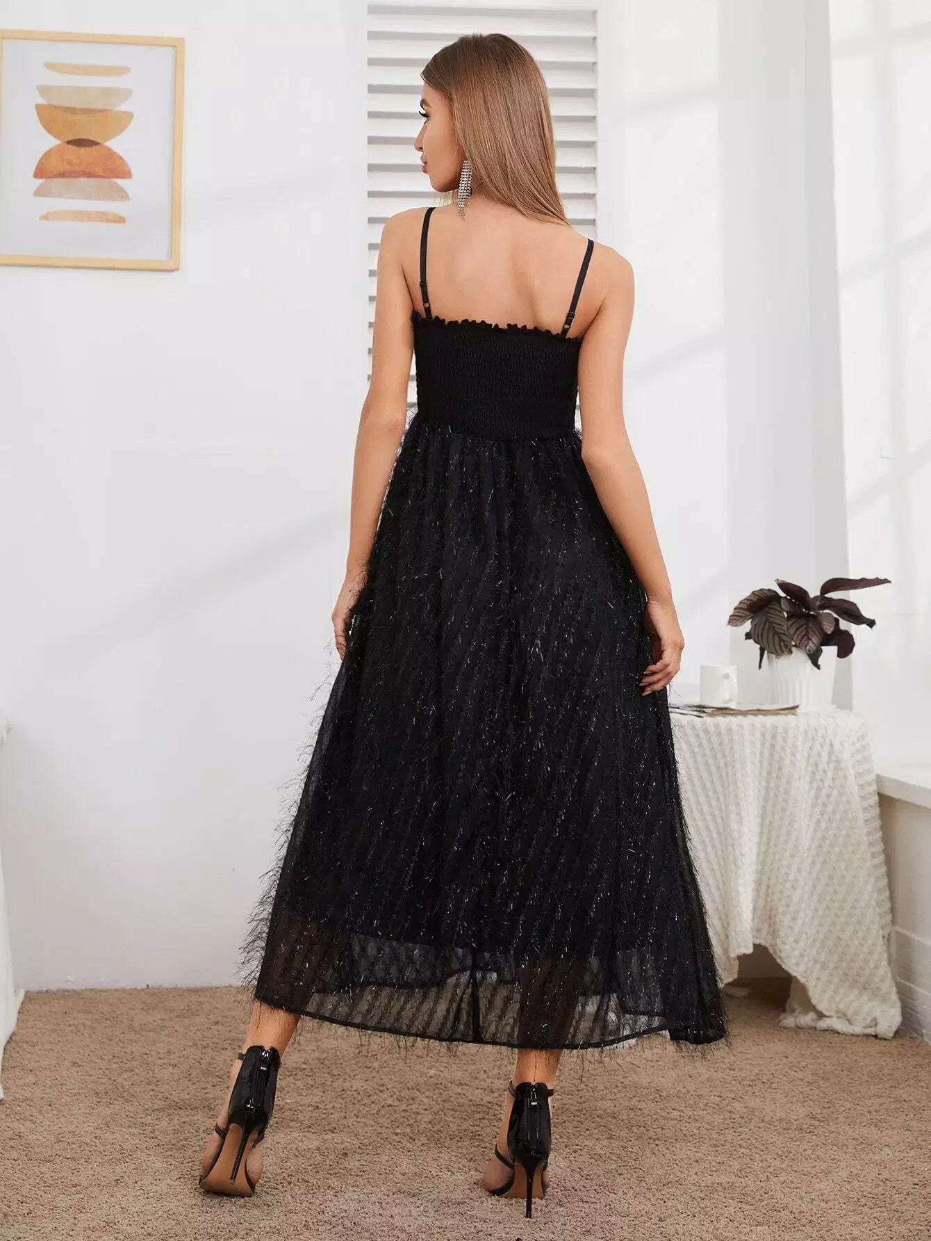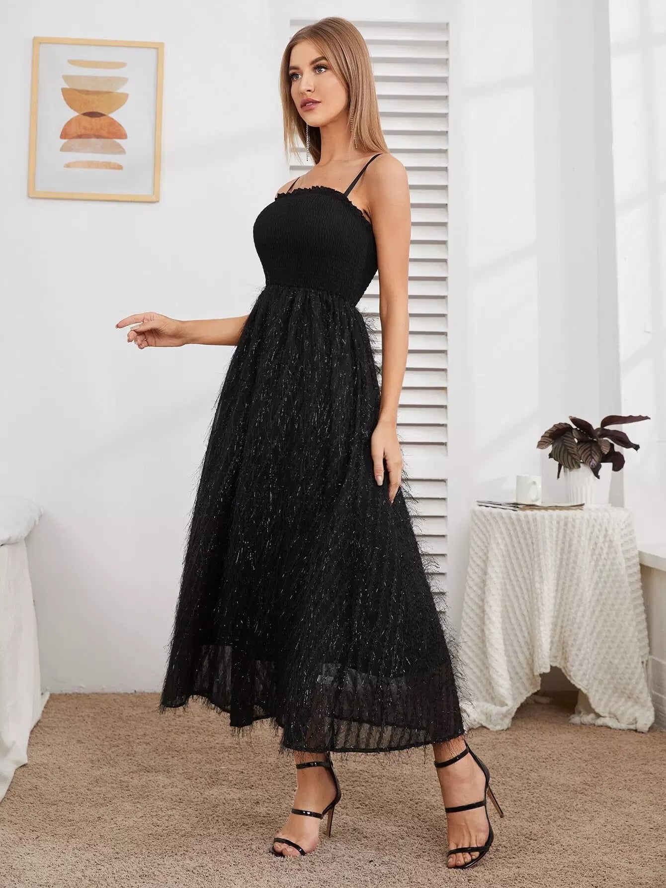 Shirred Bodice Fluffy Hem Cami Dress