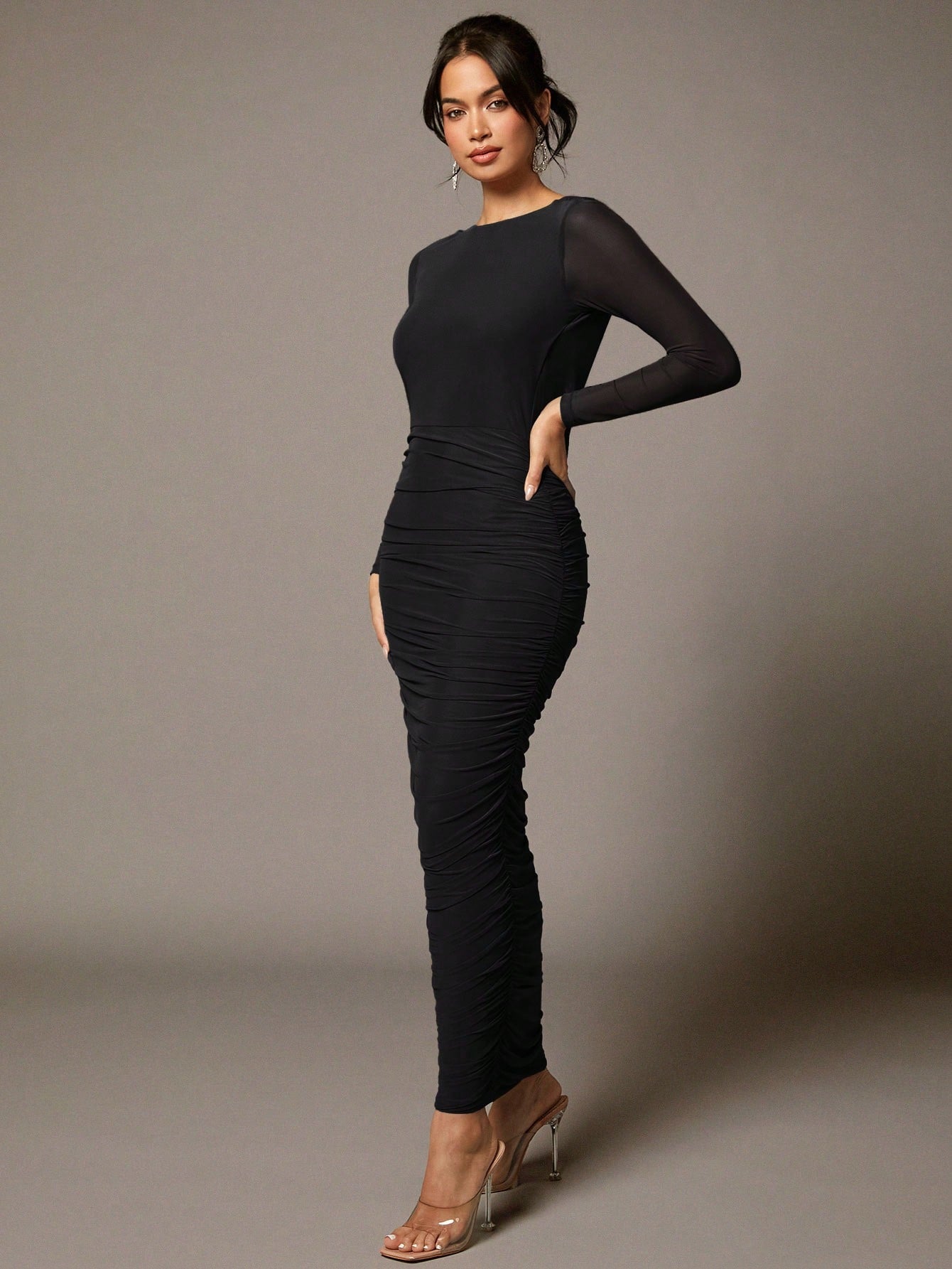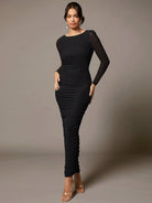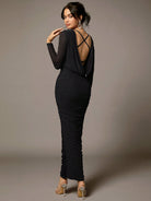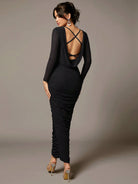 Silquee Khaki Mesh Long-Sleeved Pleated Large Open Back Swing Collar Cross-Strap Long Tight Sexy Dress