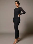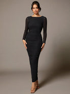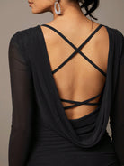 women Silquee Khaki Mesh Long-Sleeved Pleated Large Open Back Swing Collar Cross-Strap Long Tight Sexy Dress