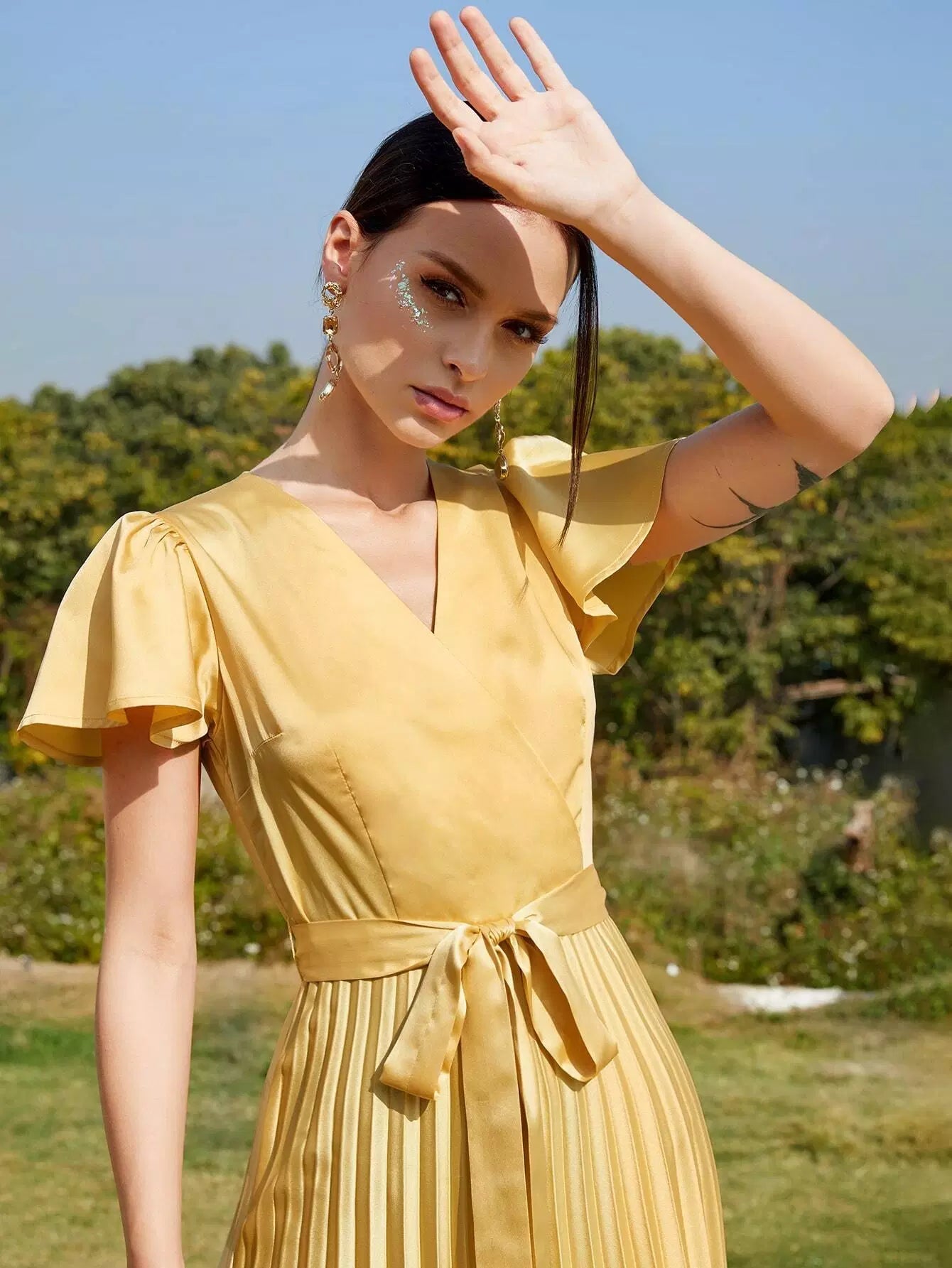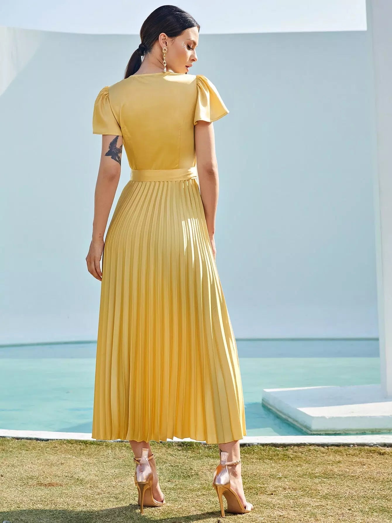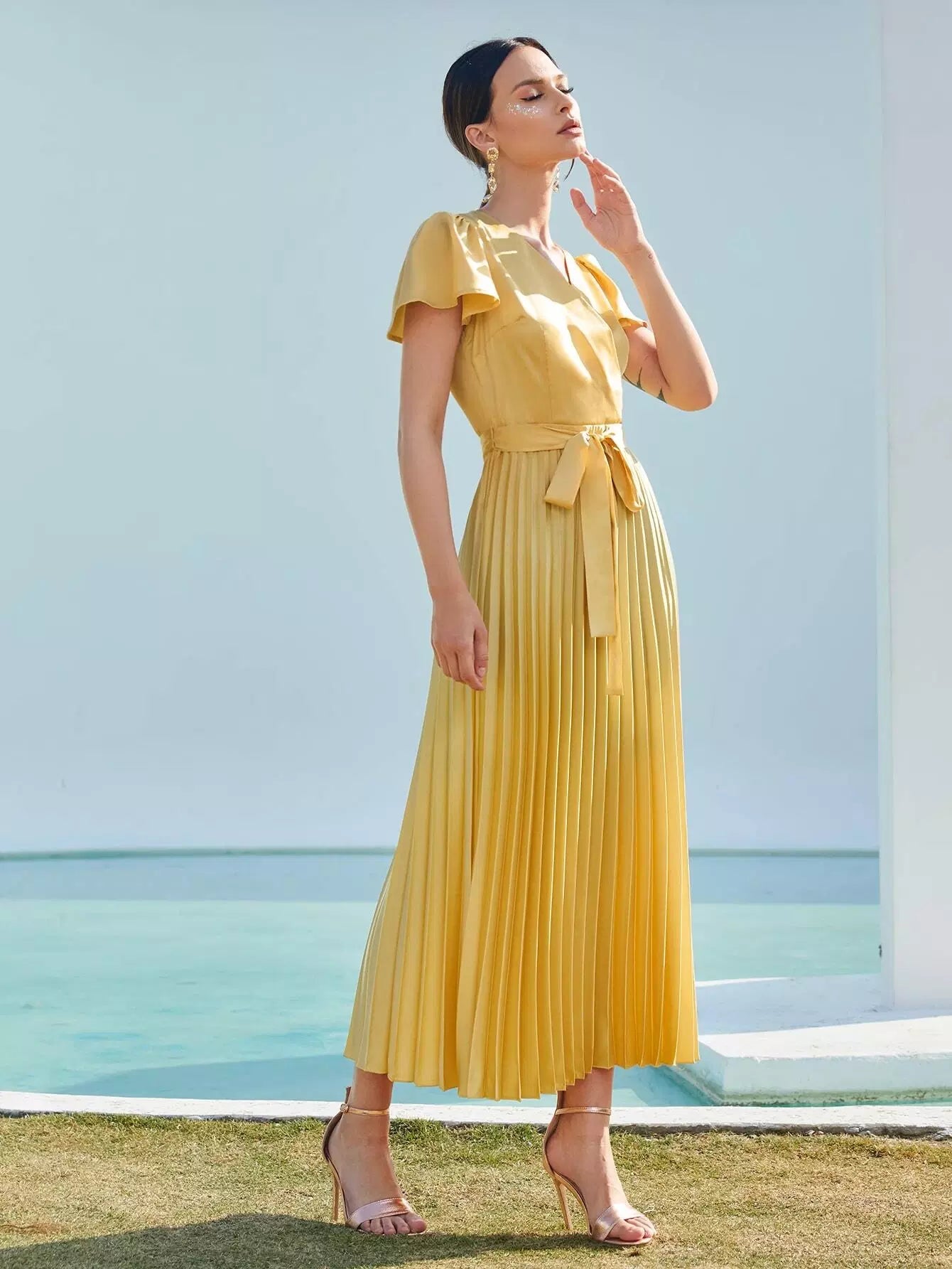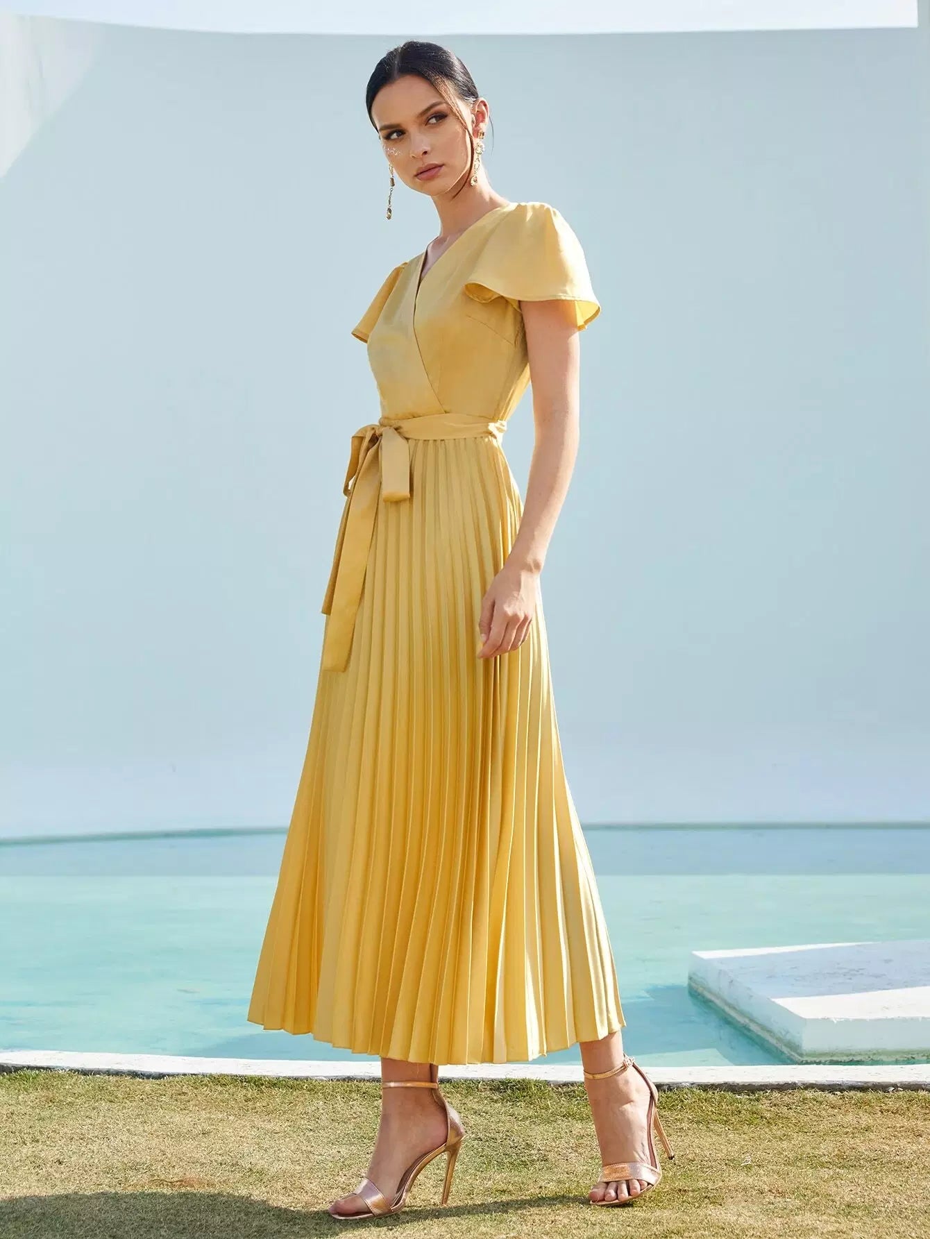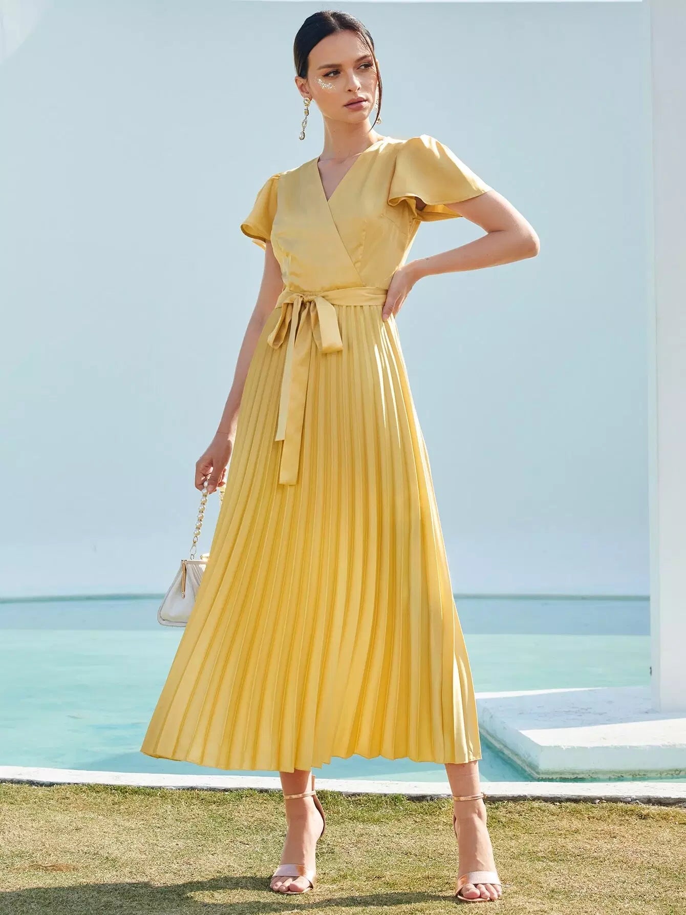 Surplice Neck Flutter Sleeve Pleated Satin Dress