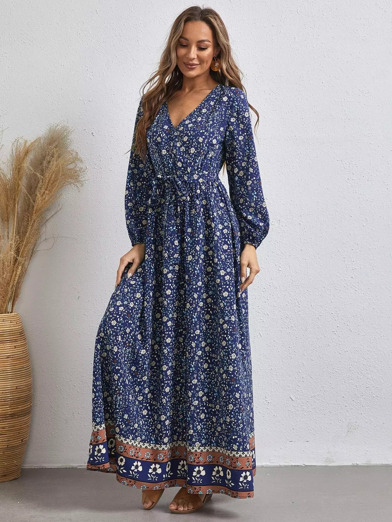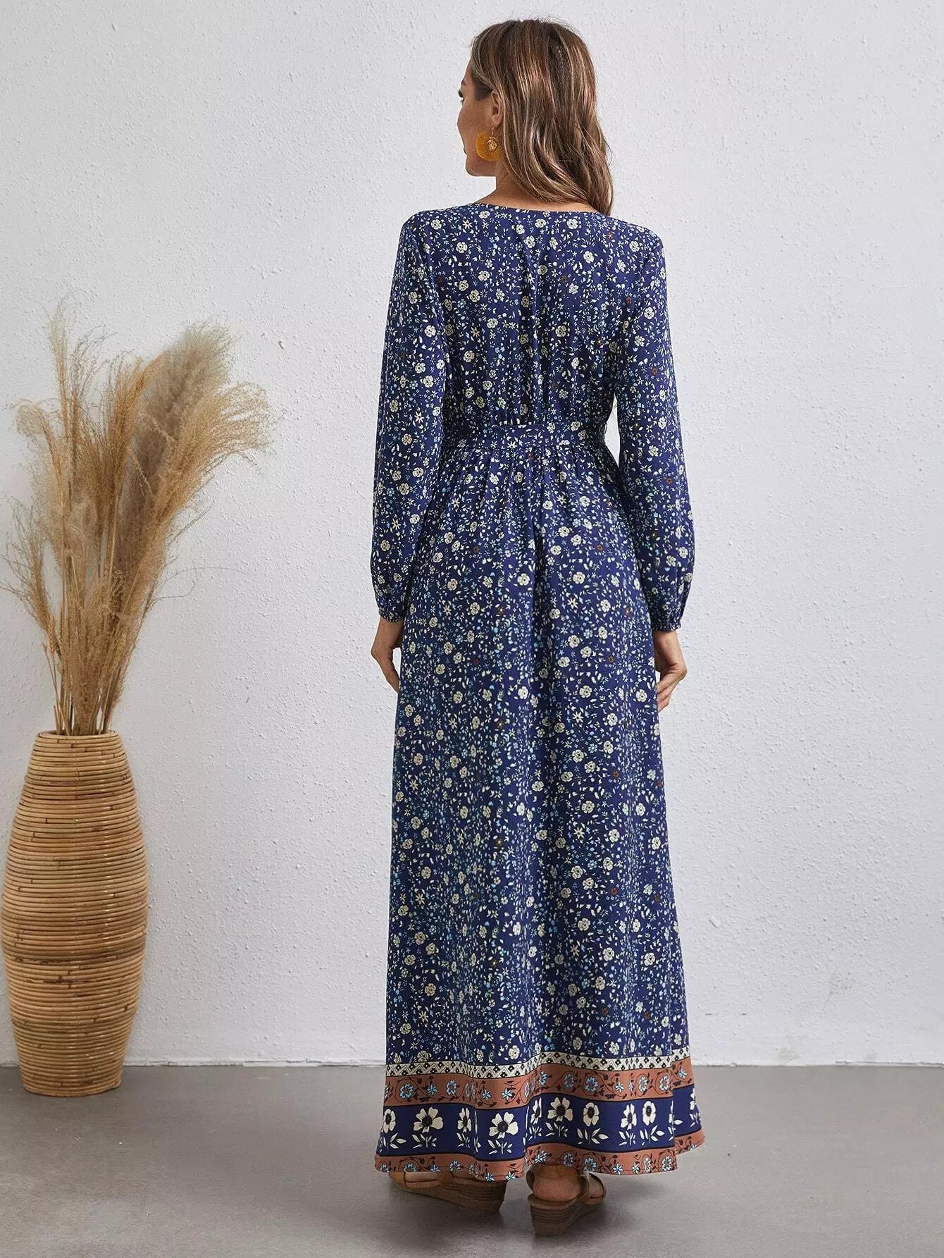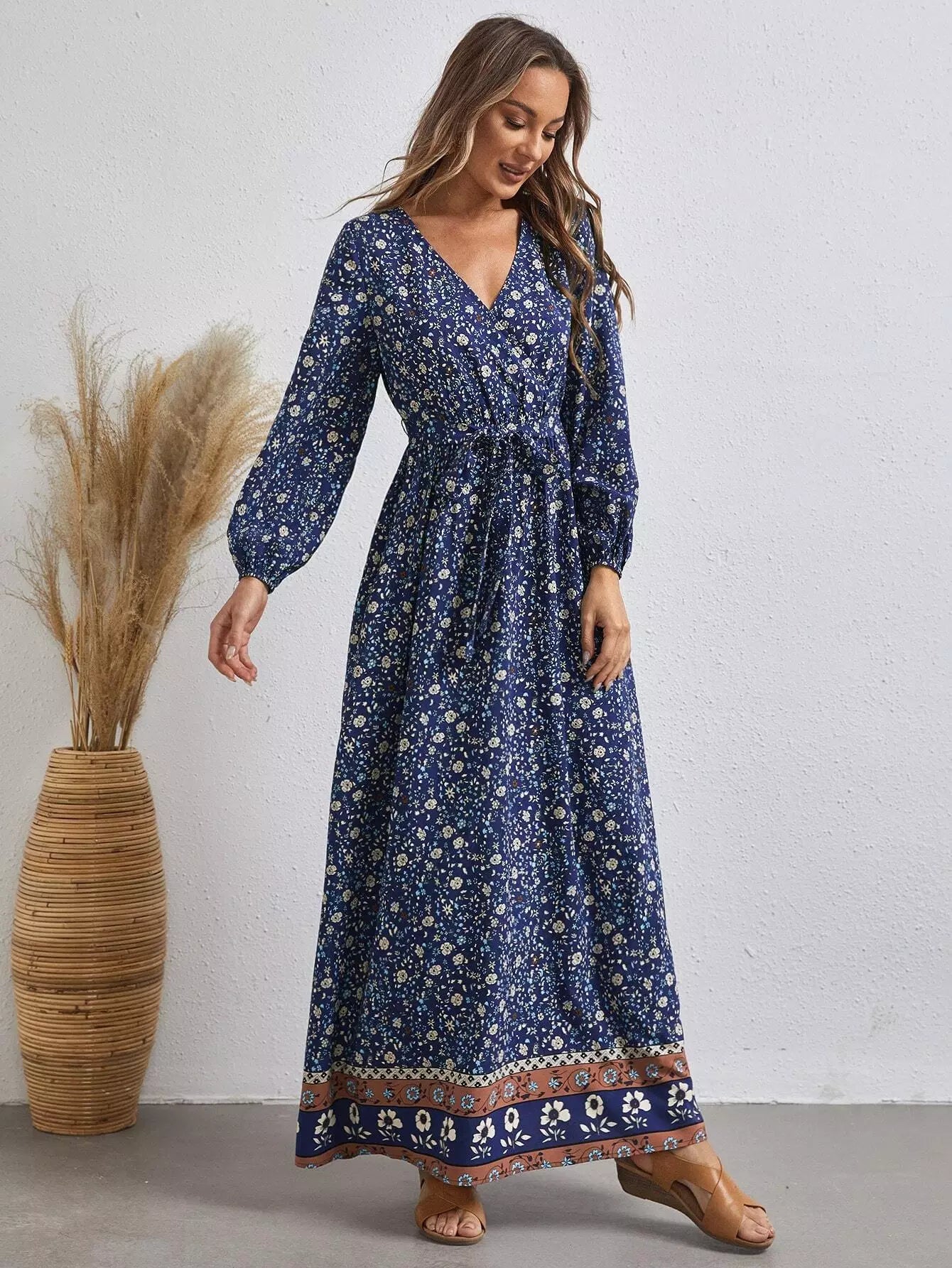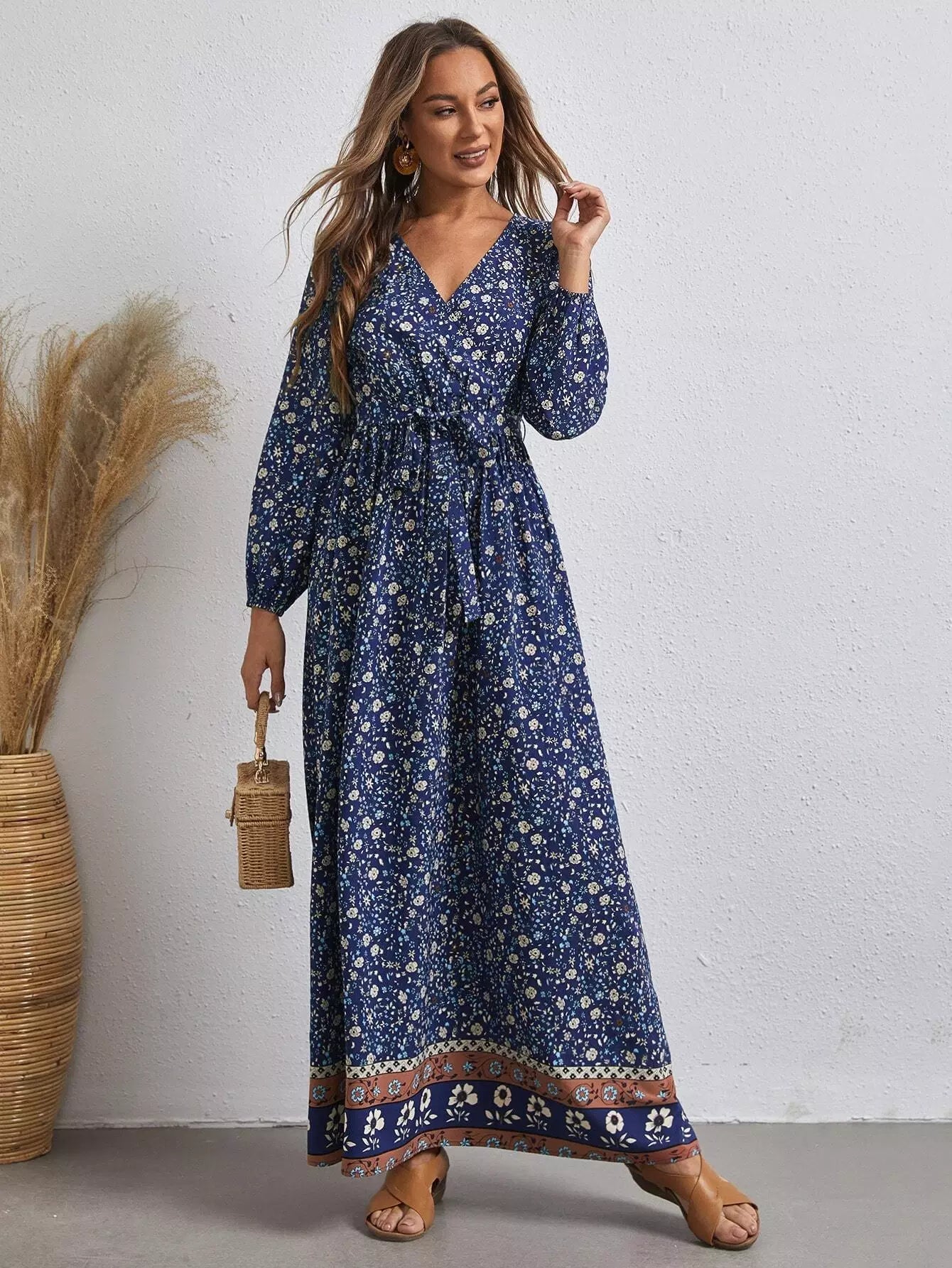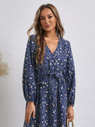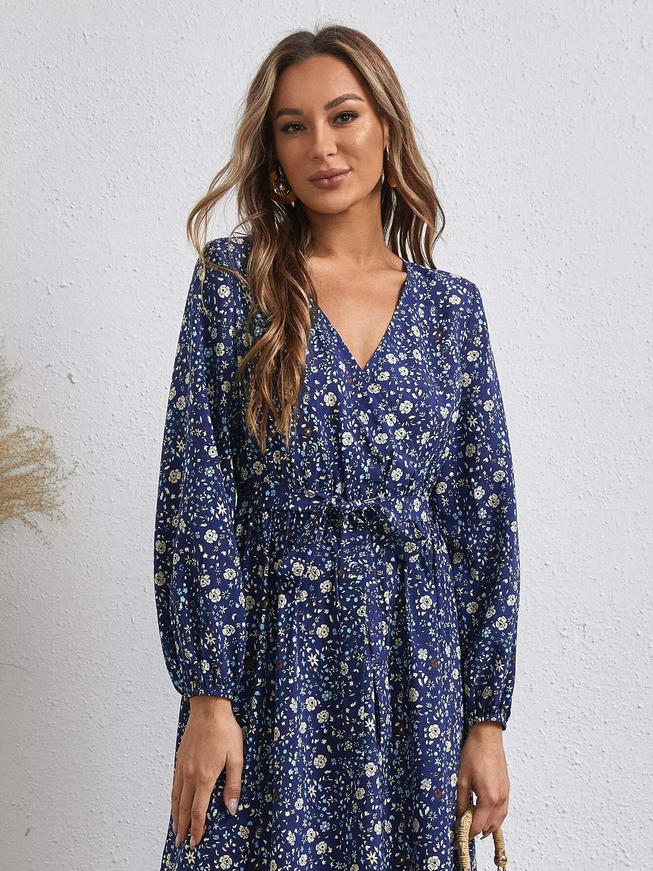 Surplice Neck Lantern Sleeve Floral Dress Without Belt