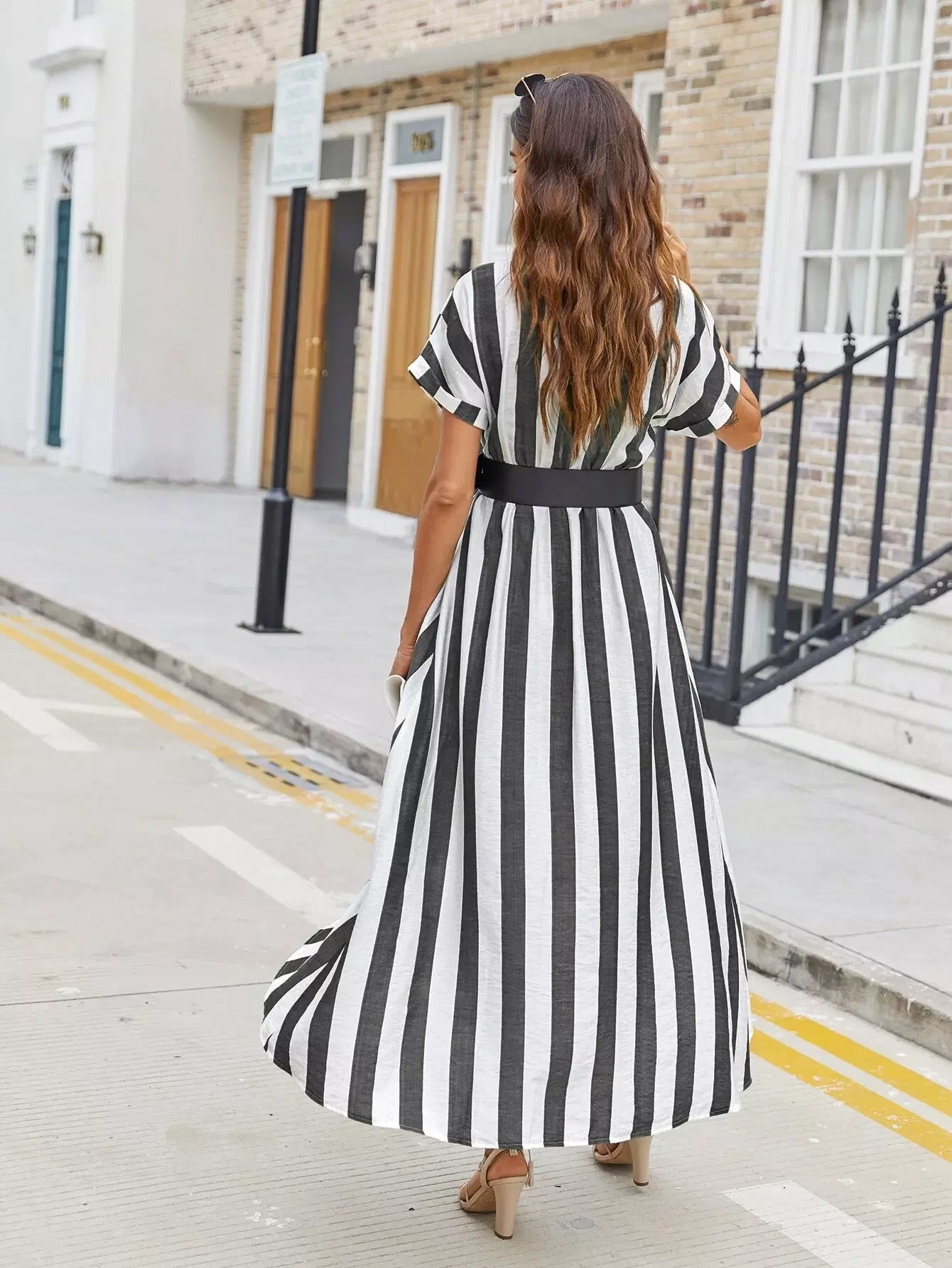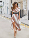 Women - Surplice Neck Striped Wrap A-line Dress Without Belted