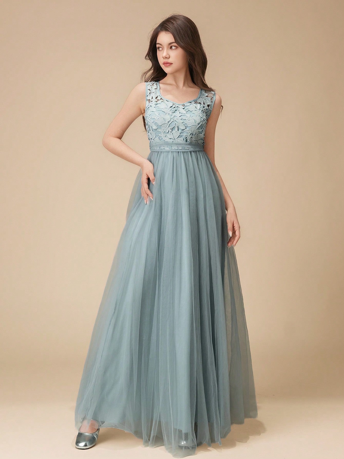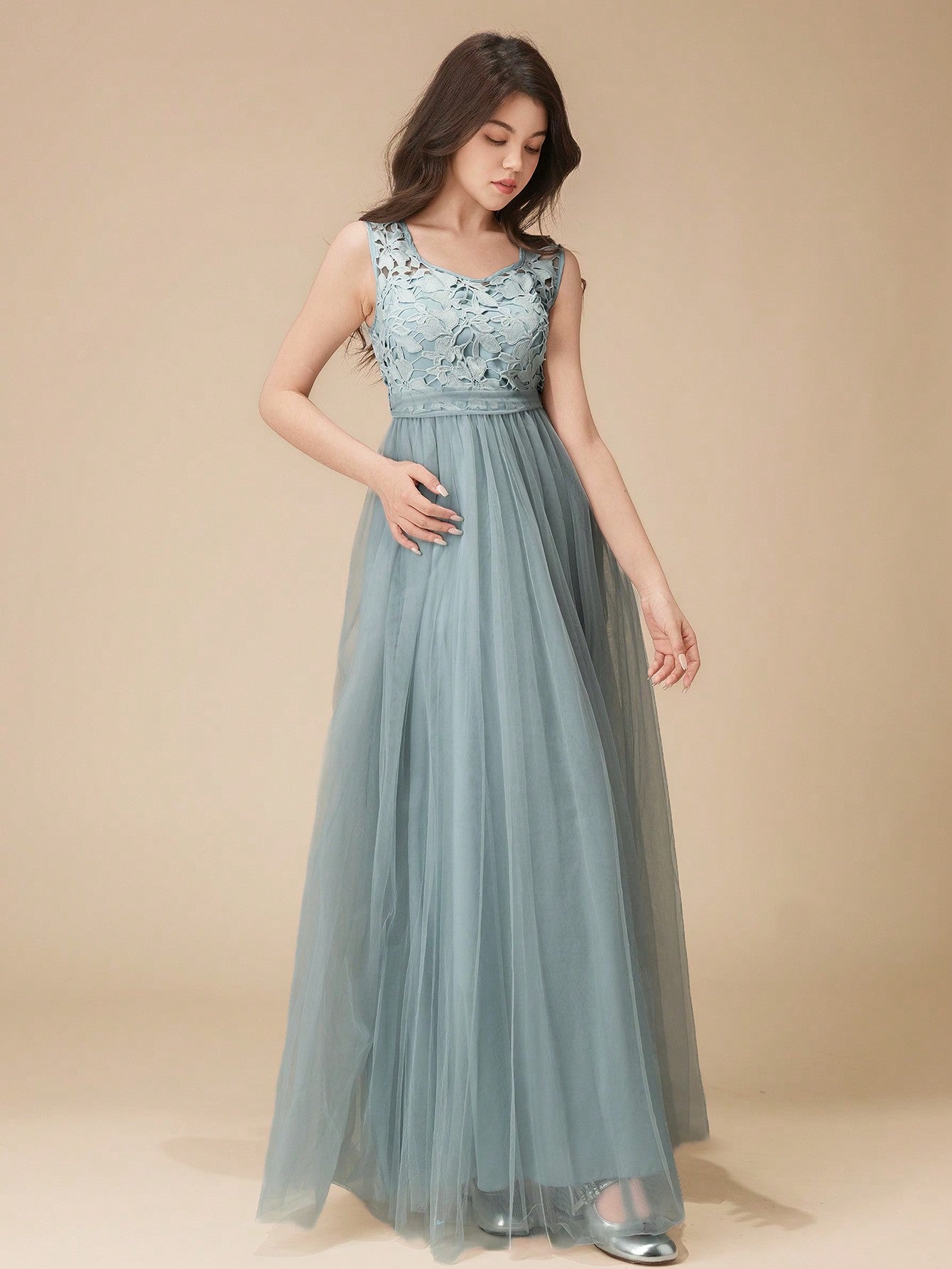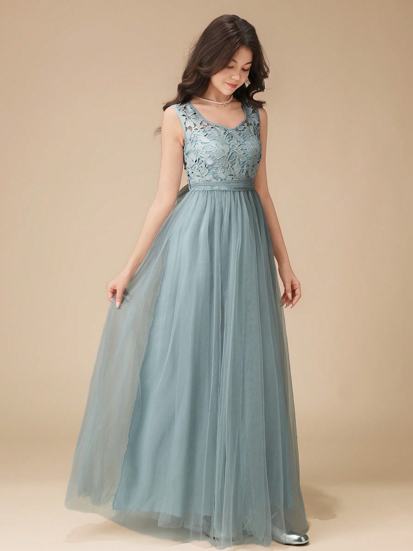women Teen Girl Chiffon Bridesmaid's Grey-Green Long Dress