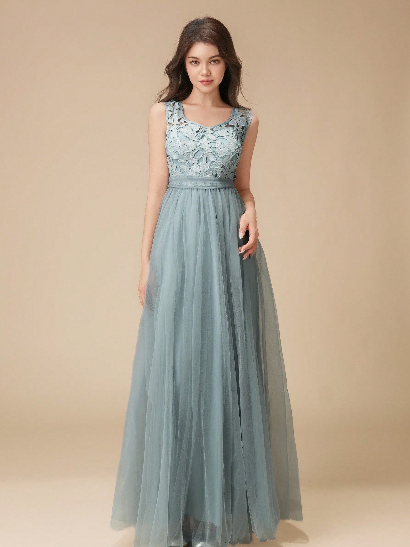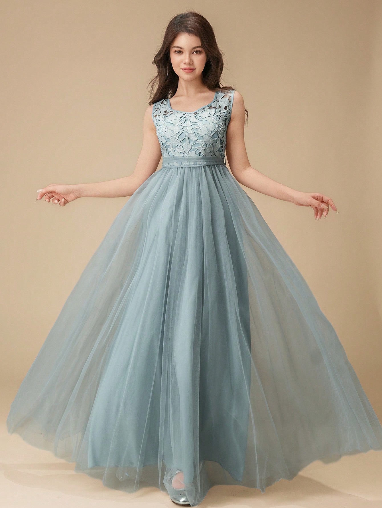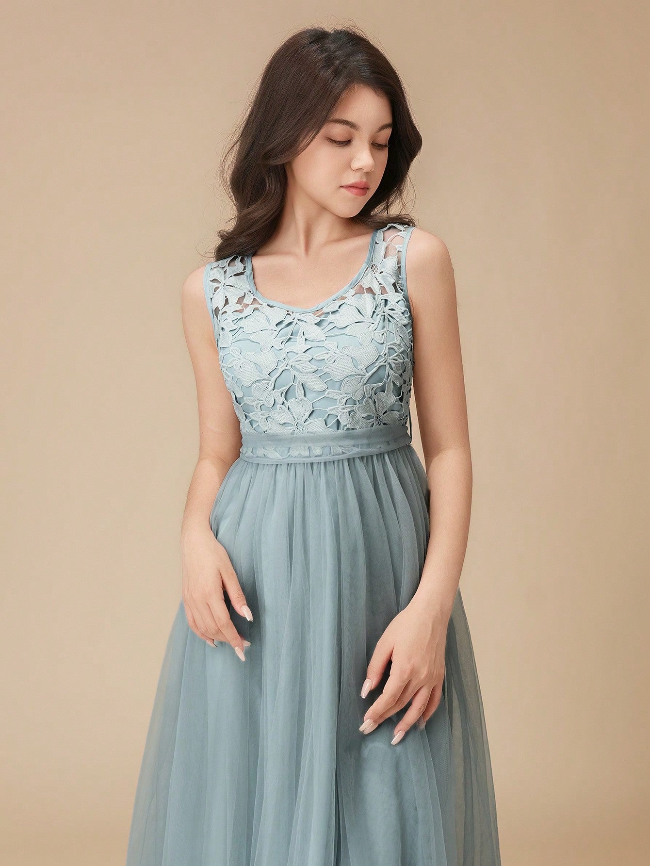 women Teen Girl Chiffon Bridesmaid's Grey-Green Long Dress