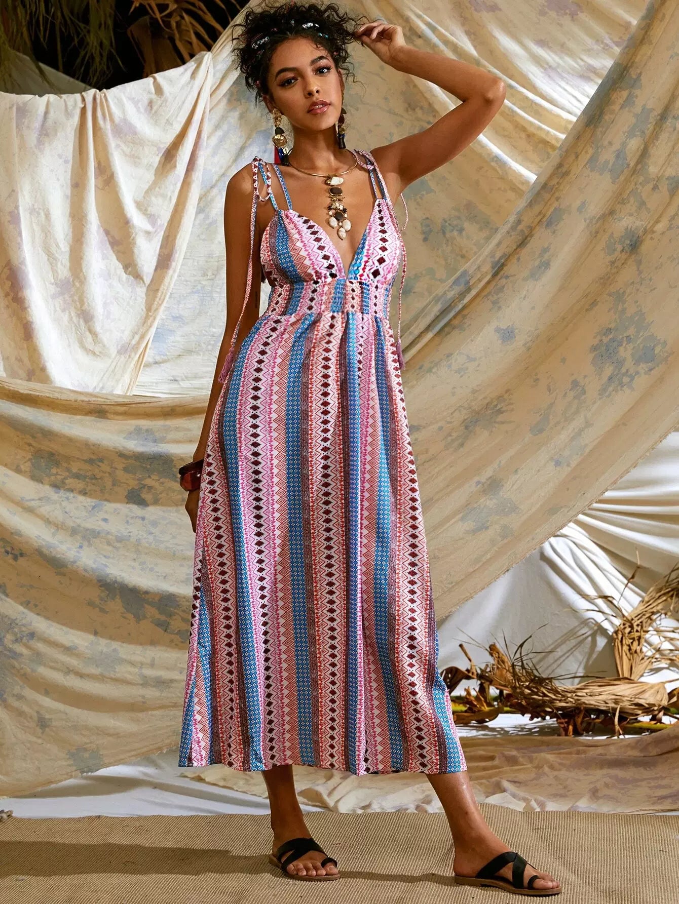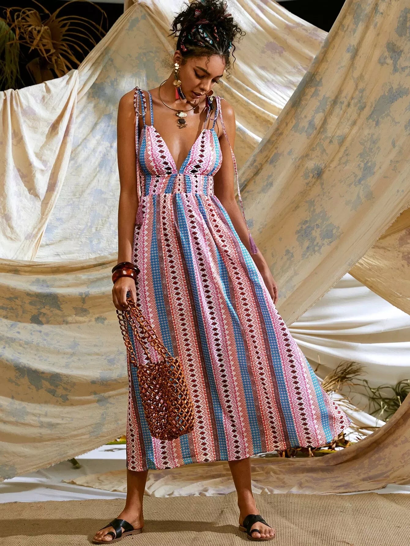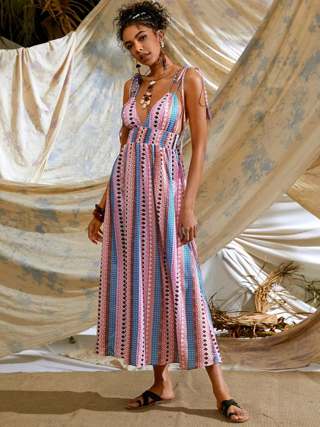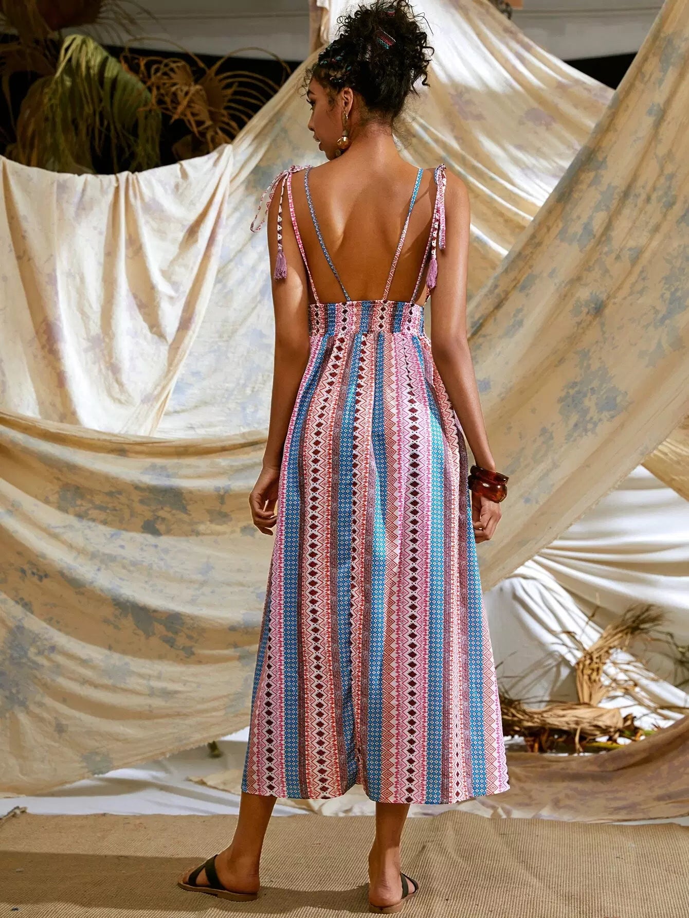 Tribal Print Shirred Waist Backless Cami Dress