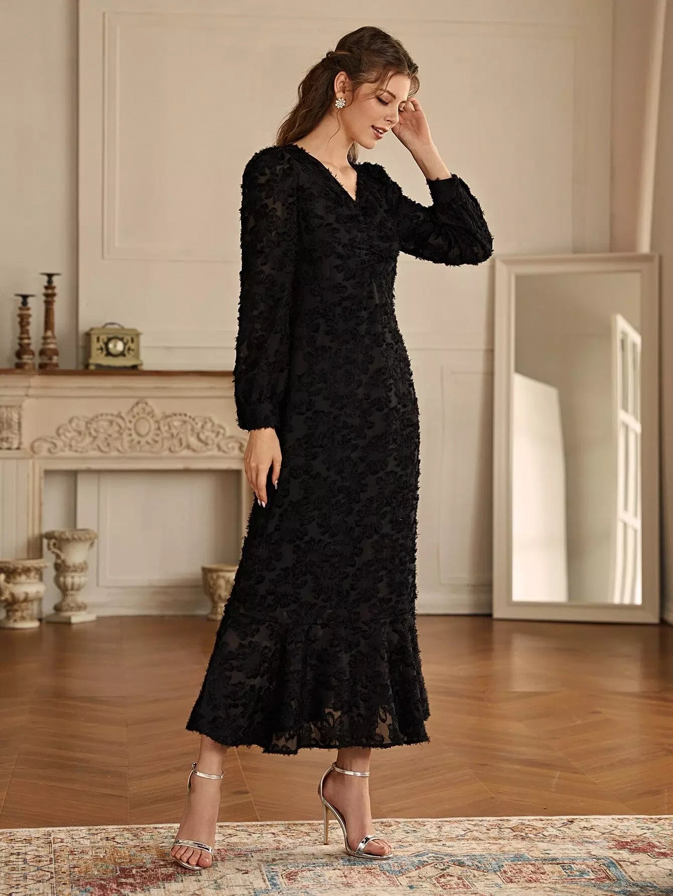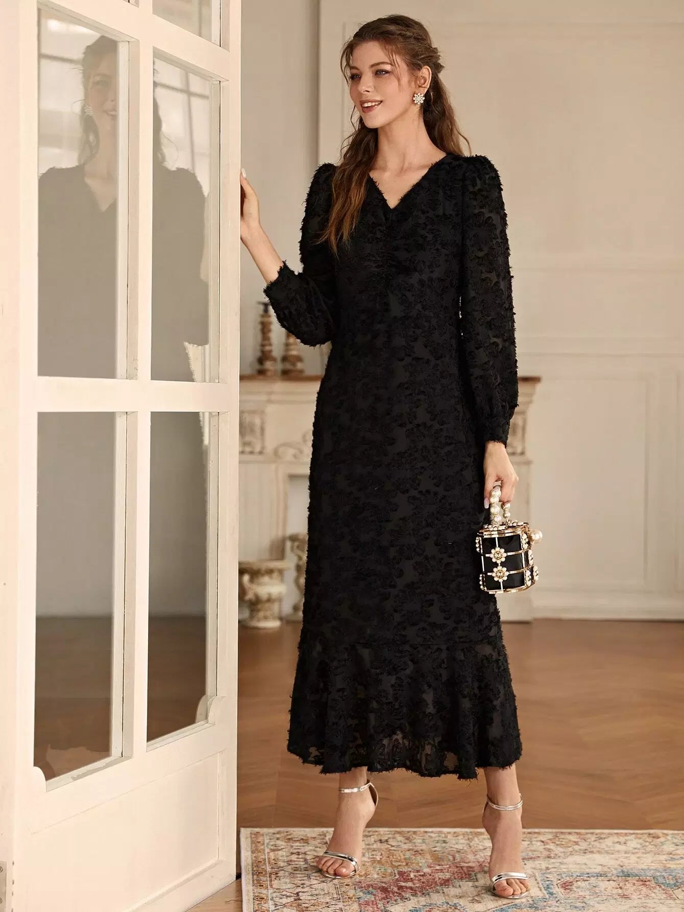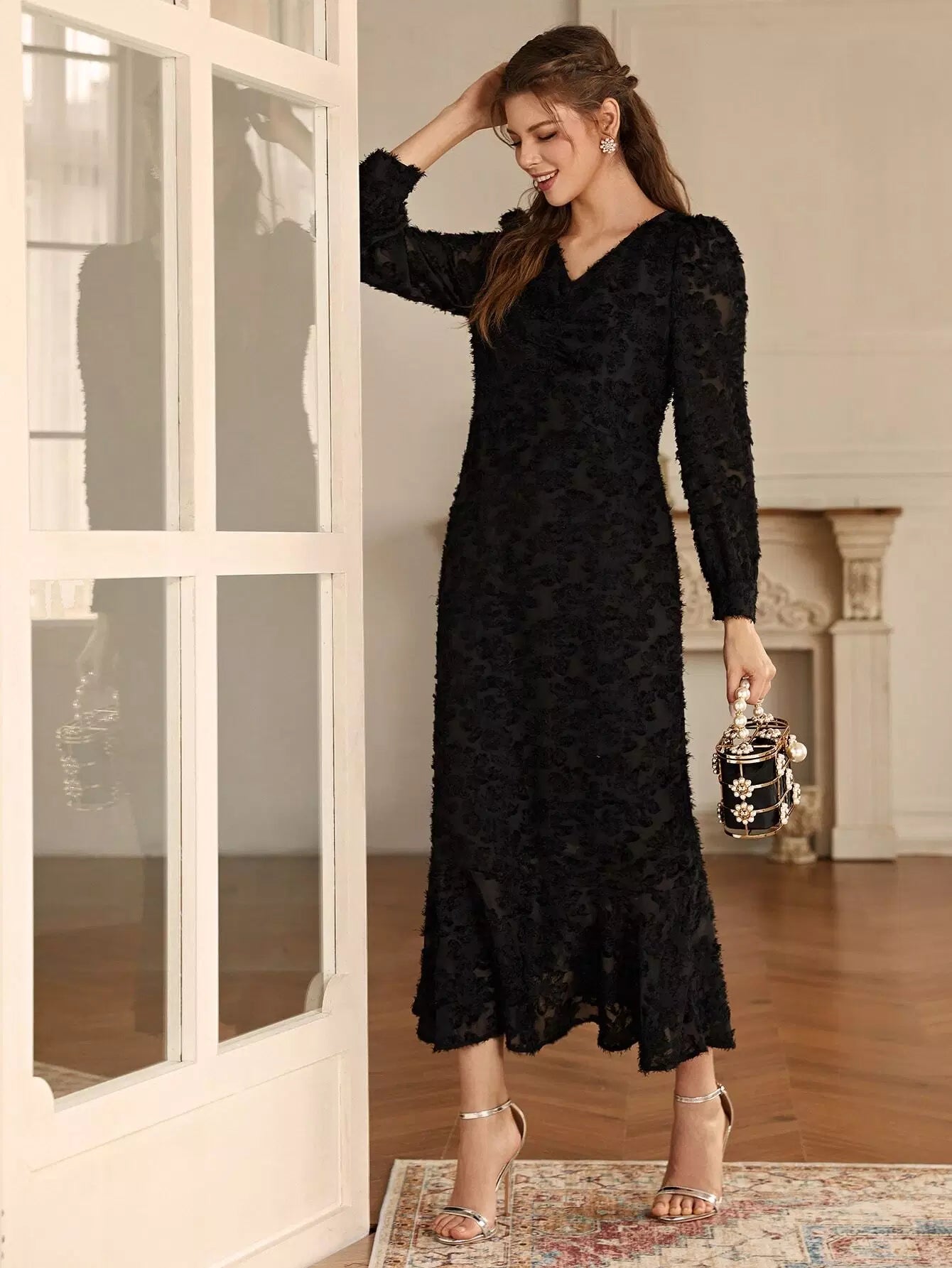 V-neck Ruffle Hem Fitted Fuzzy Dress
