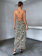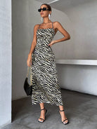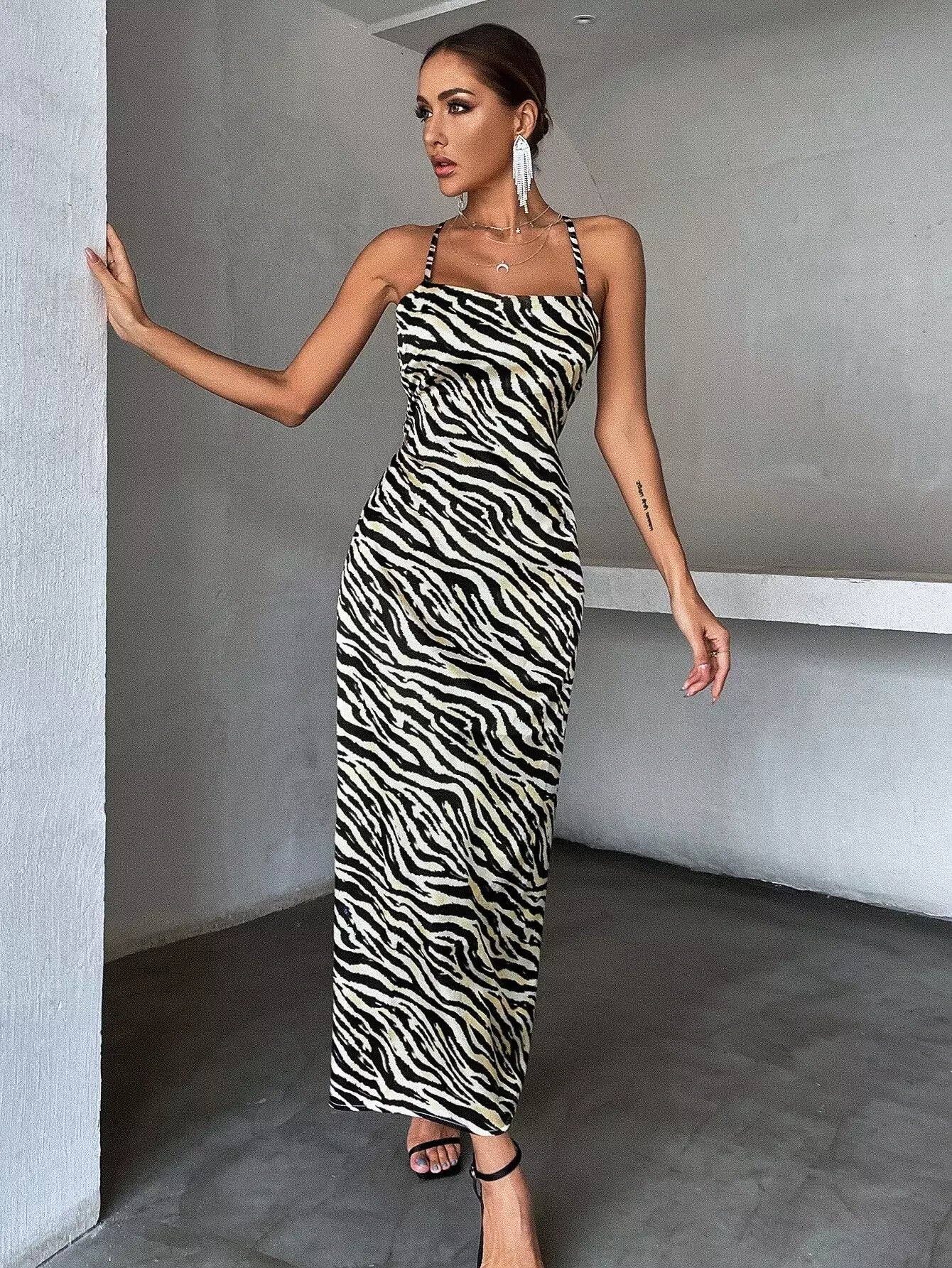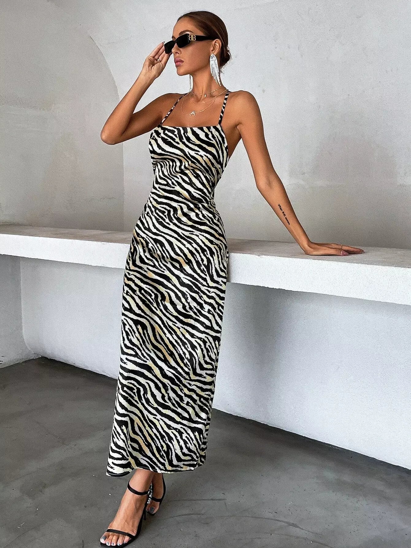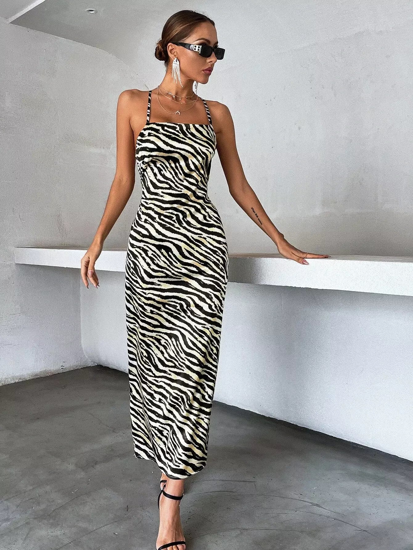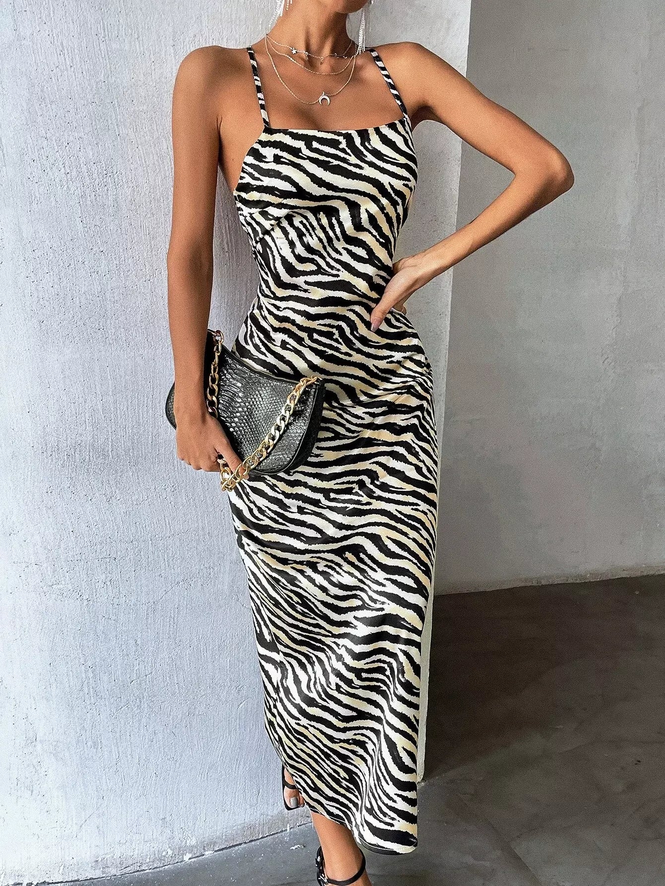 Zebra Striped Crisscross Knot Backless Satin Cami Dress
