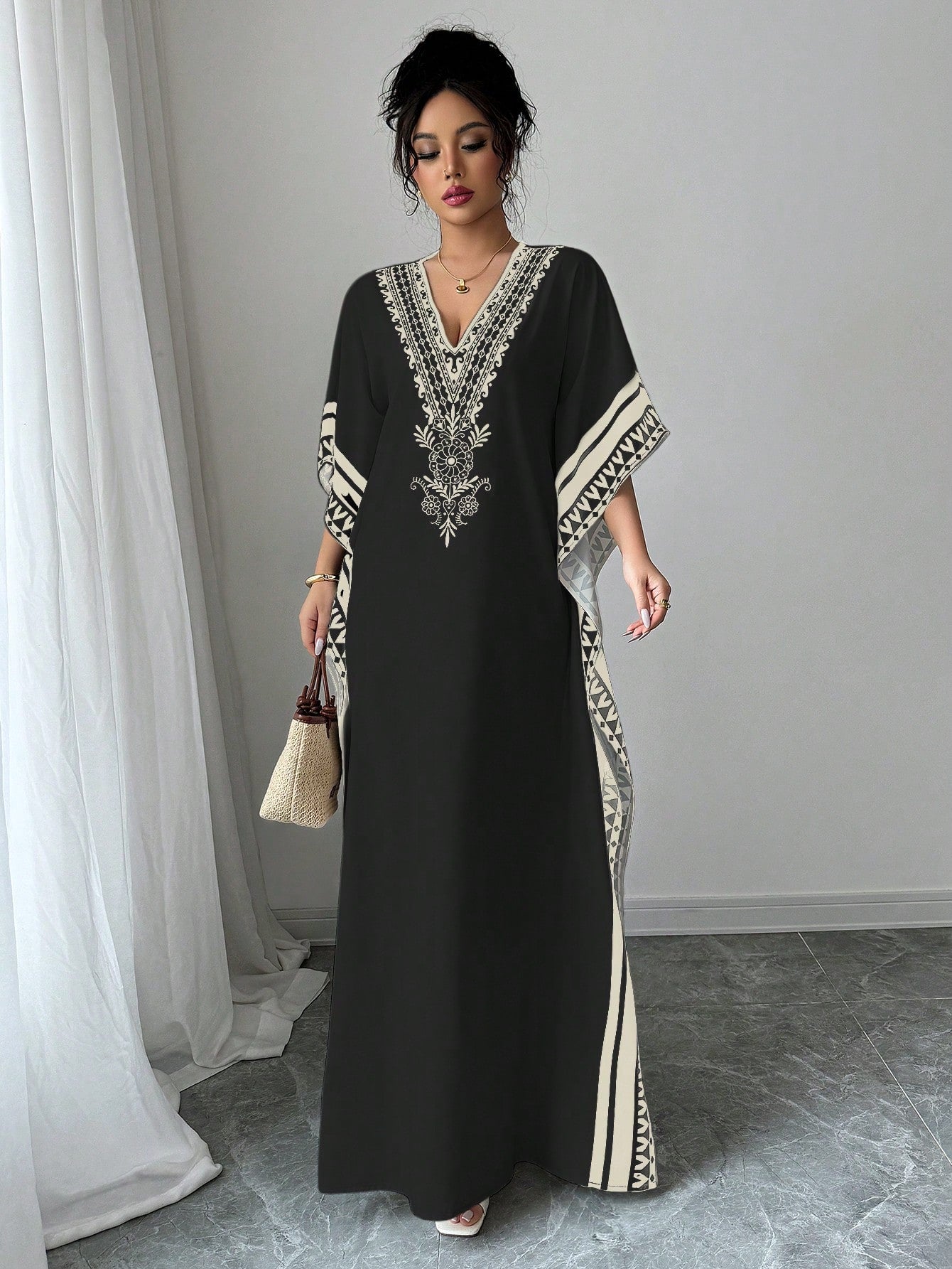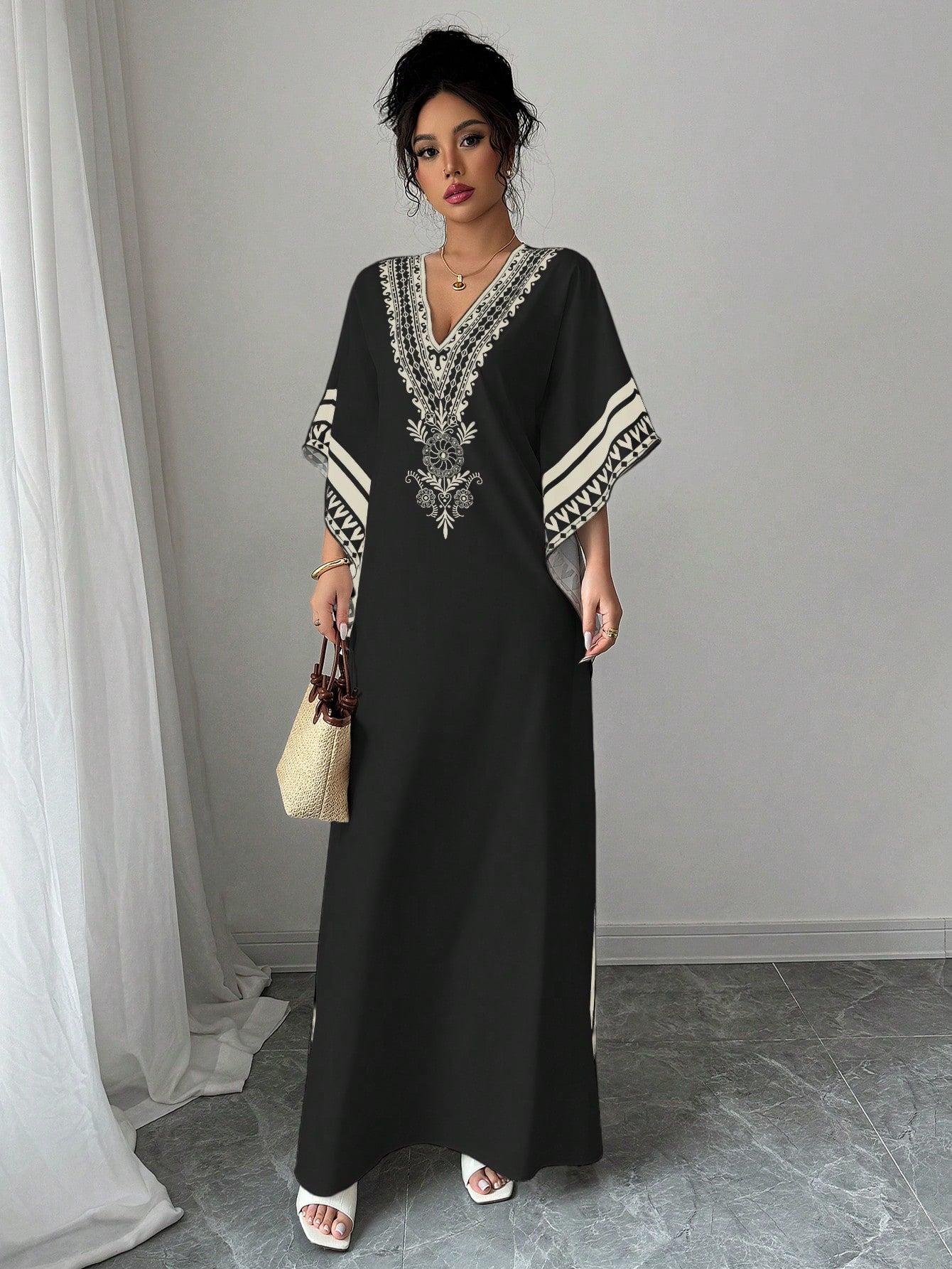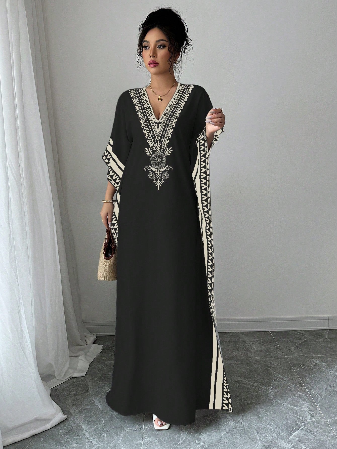 Chiquease Women's Elegant Deep V-Neck Retro Print Drop Shoulder Loose Dress