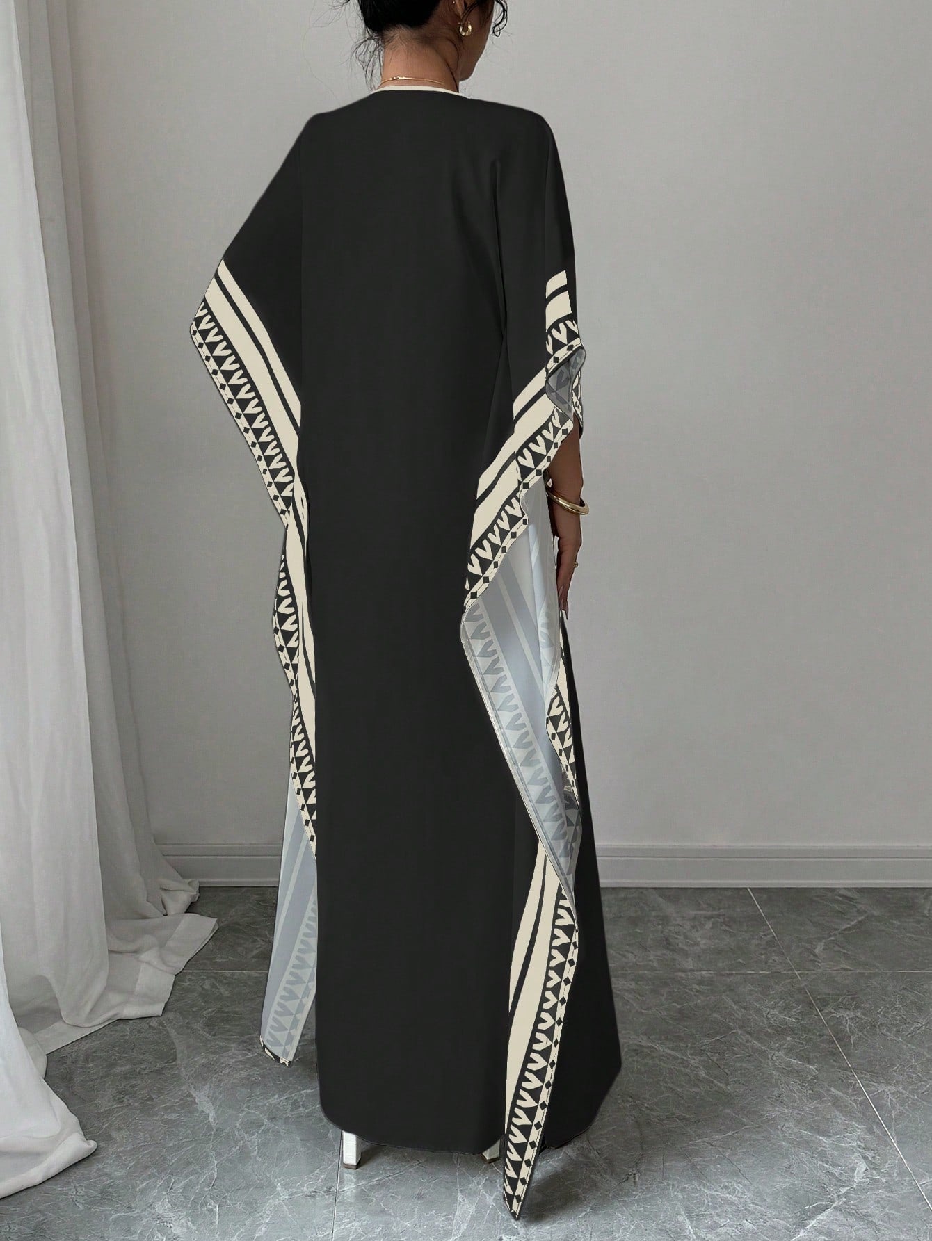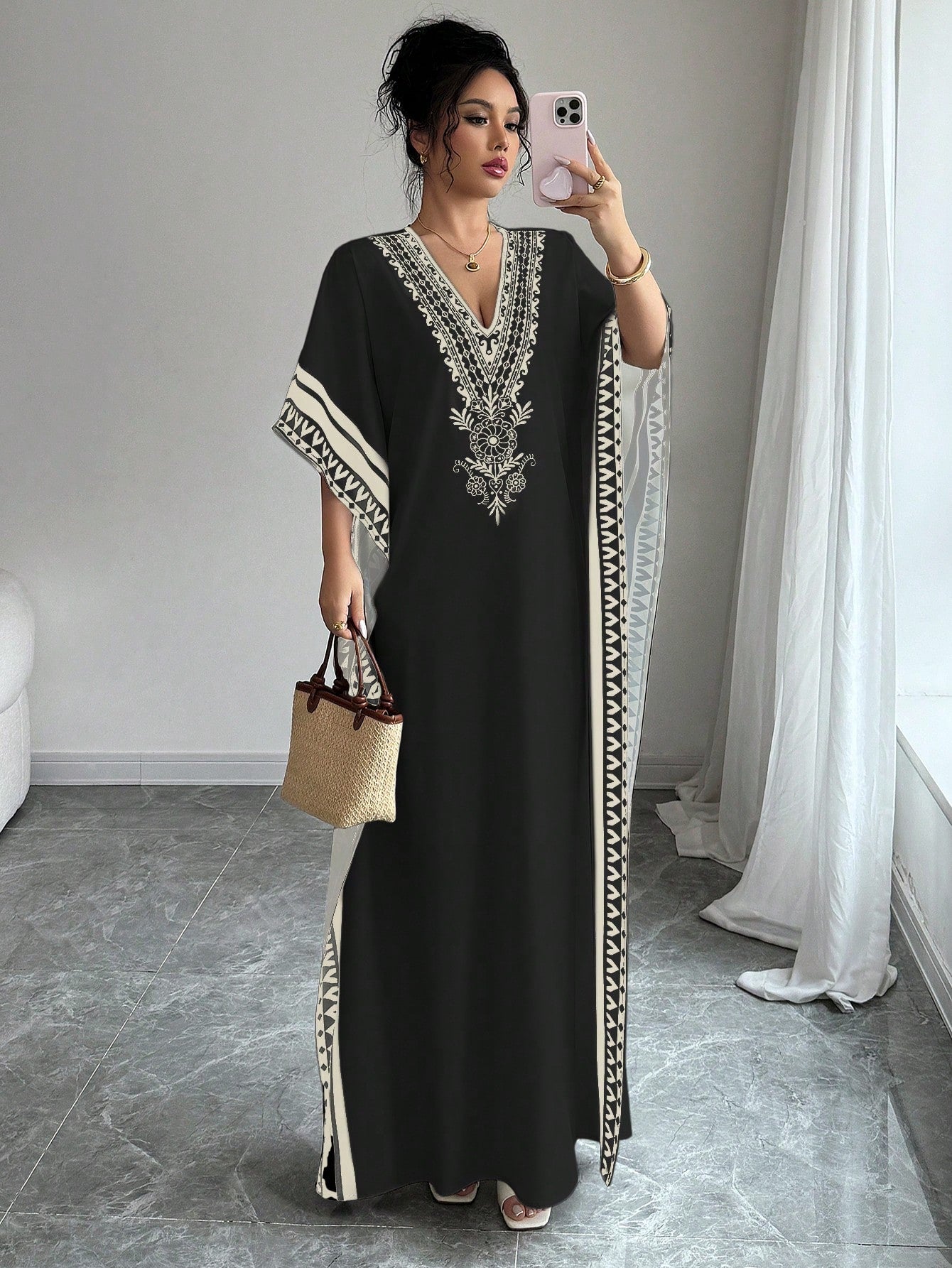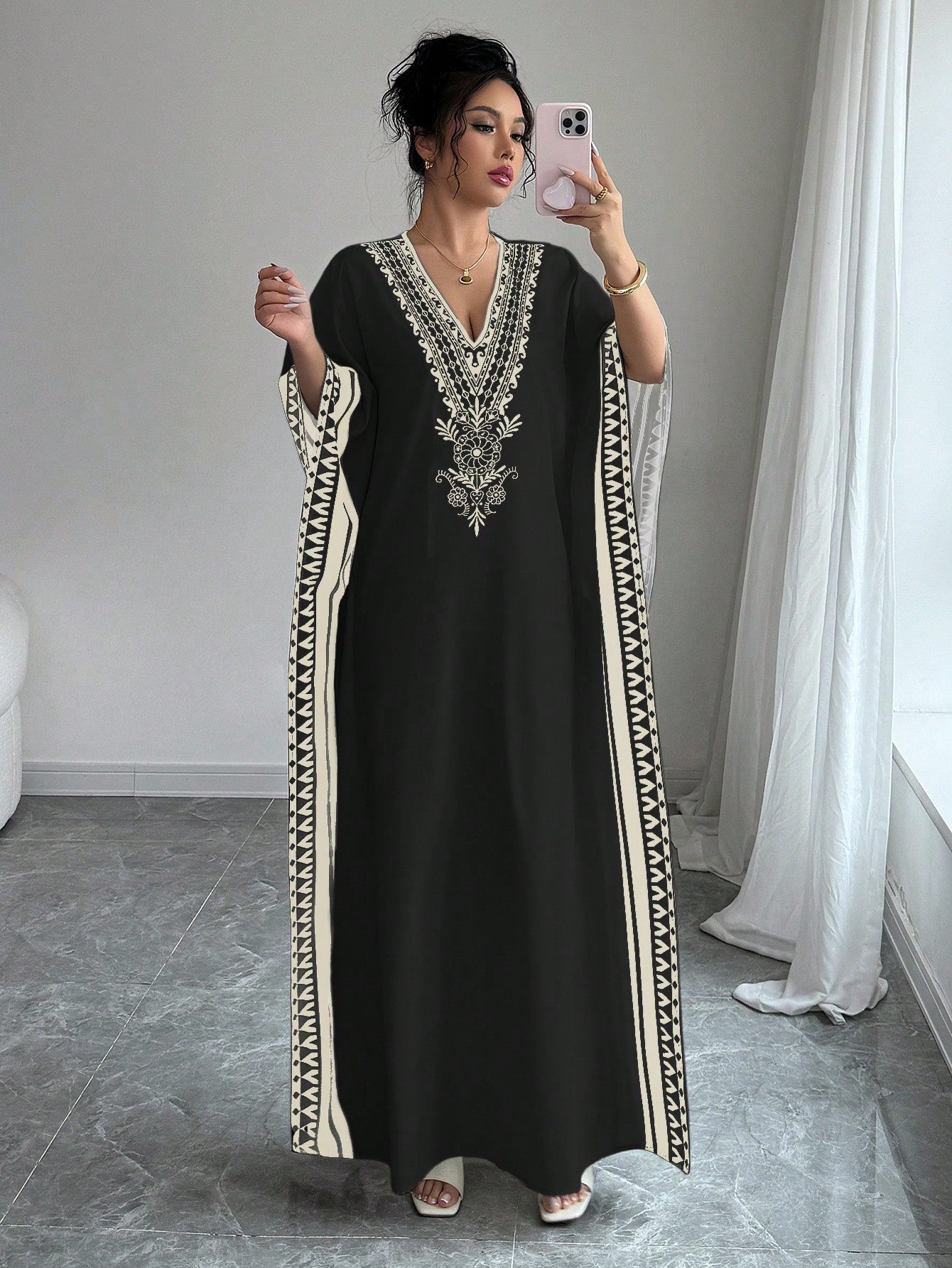 Chiquease Women's Elegant Deep V-Neck Retro Print Drop Shoulder Loose Dress