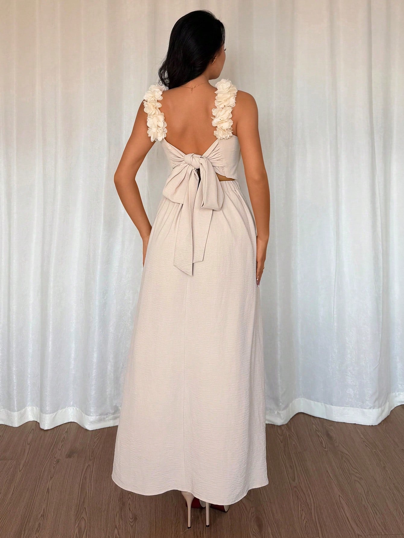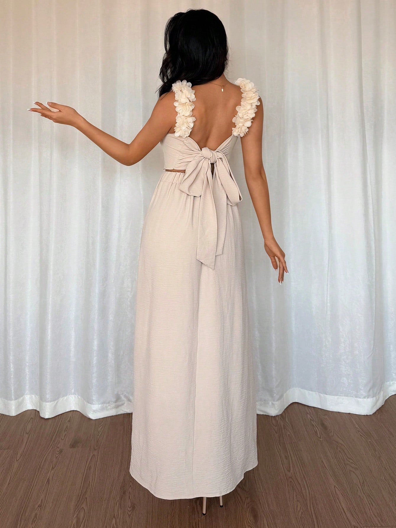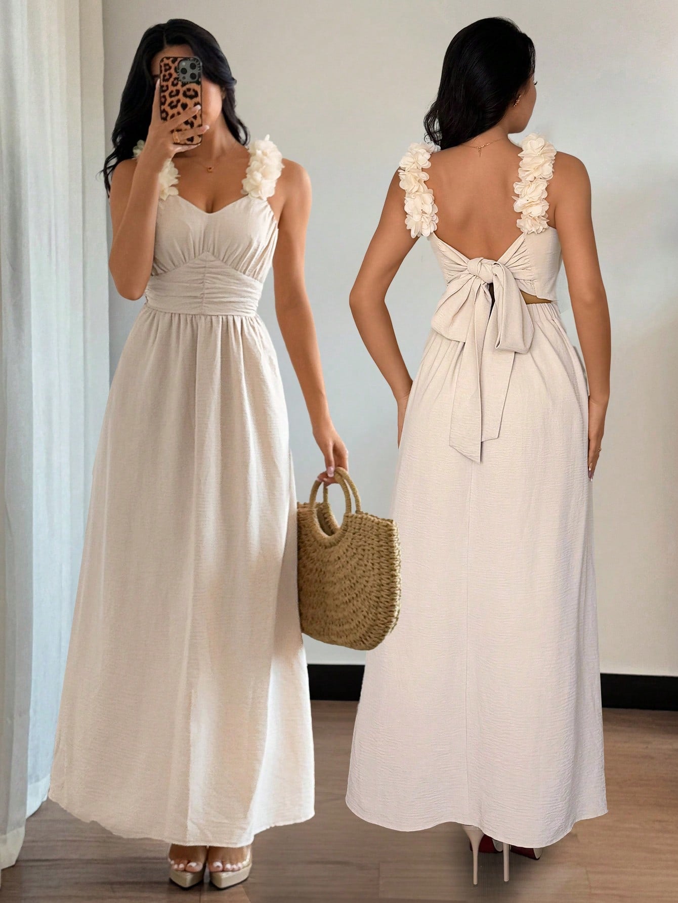 Chiquease Women's Elegant V-Neck Sleeveless Vacation Dress With 3D Floral Lace Cutout Back Tie Design,