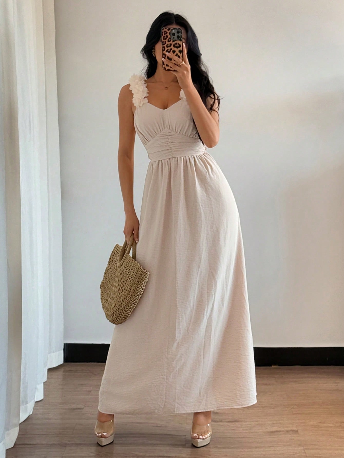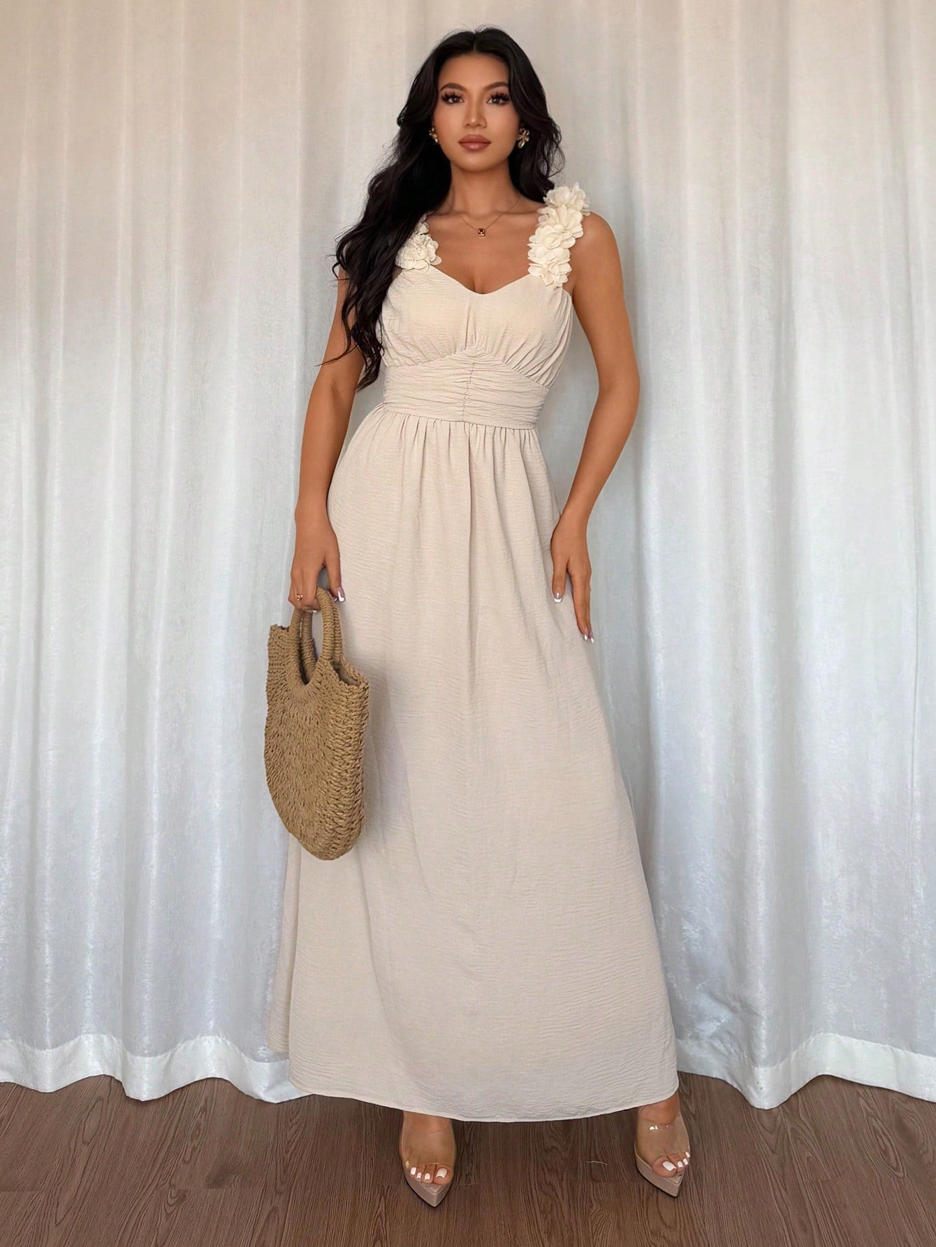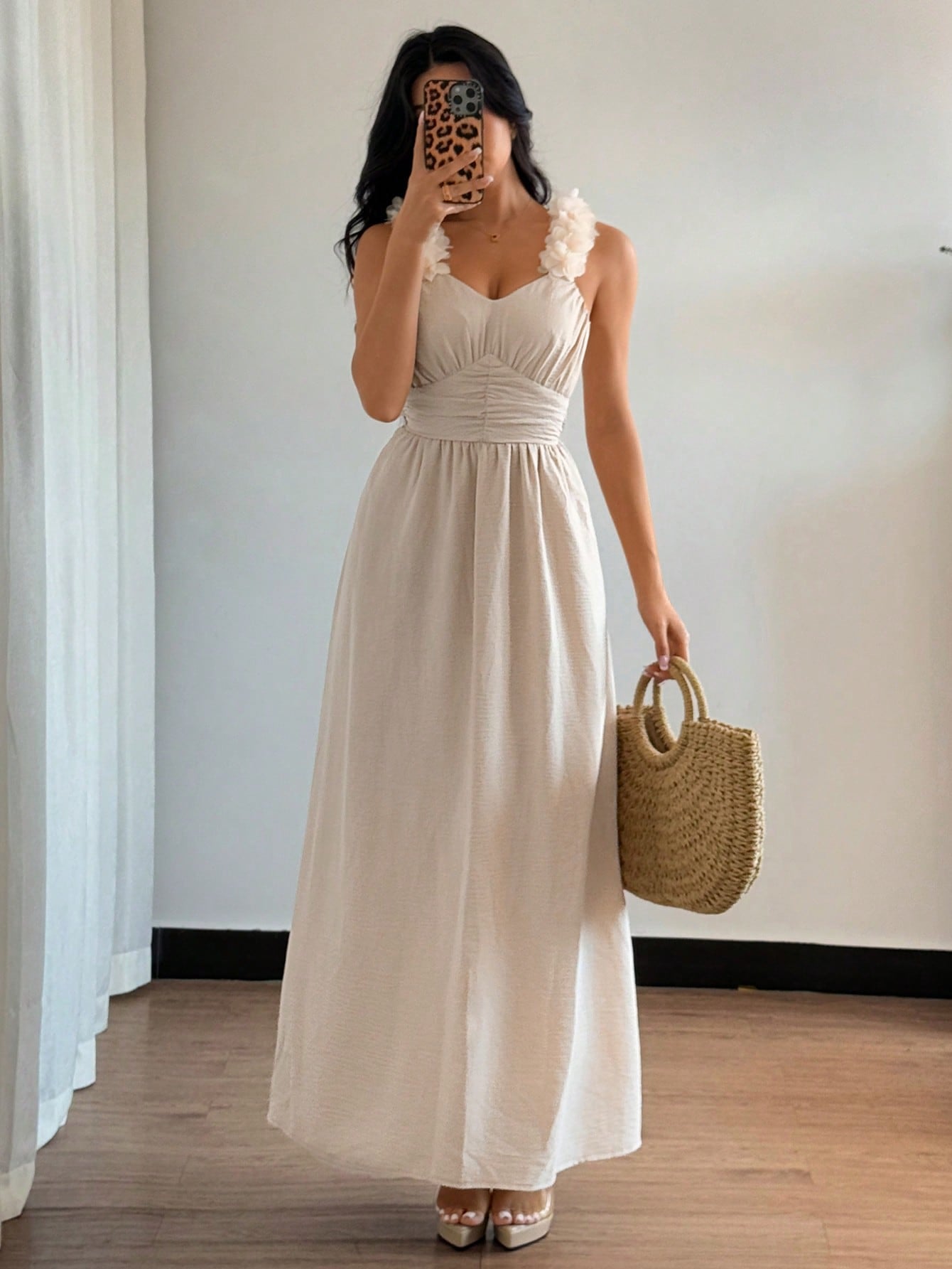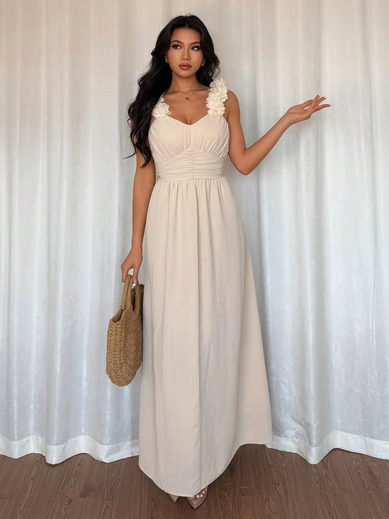 Chiquease Women's Elegant V-Neck Sleeveless Vacation Dress With 3D Floral Lace Cutout Back Tie Design,
