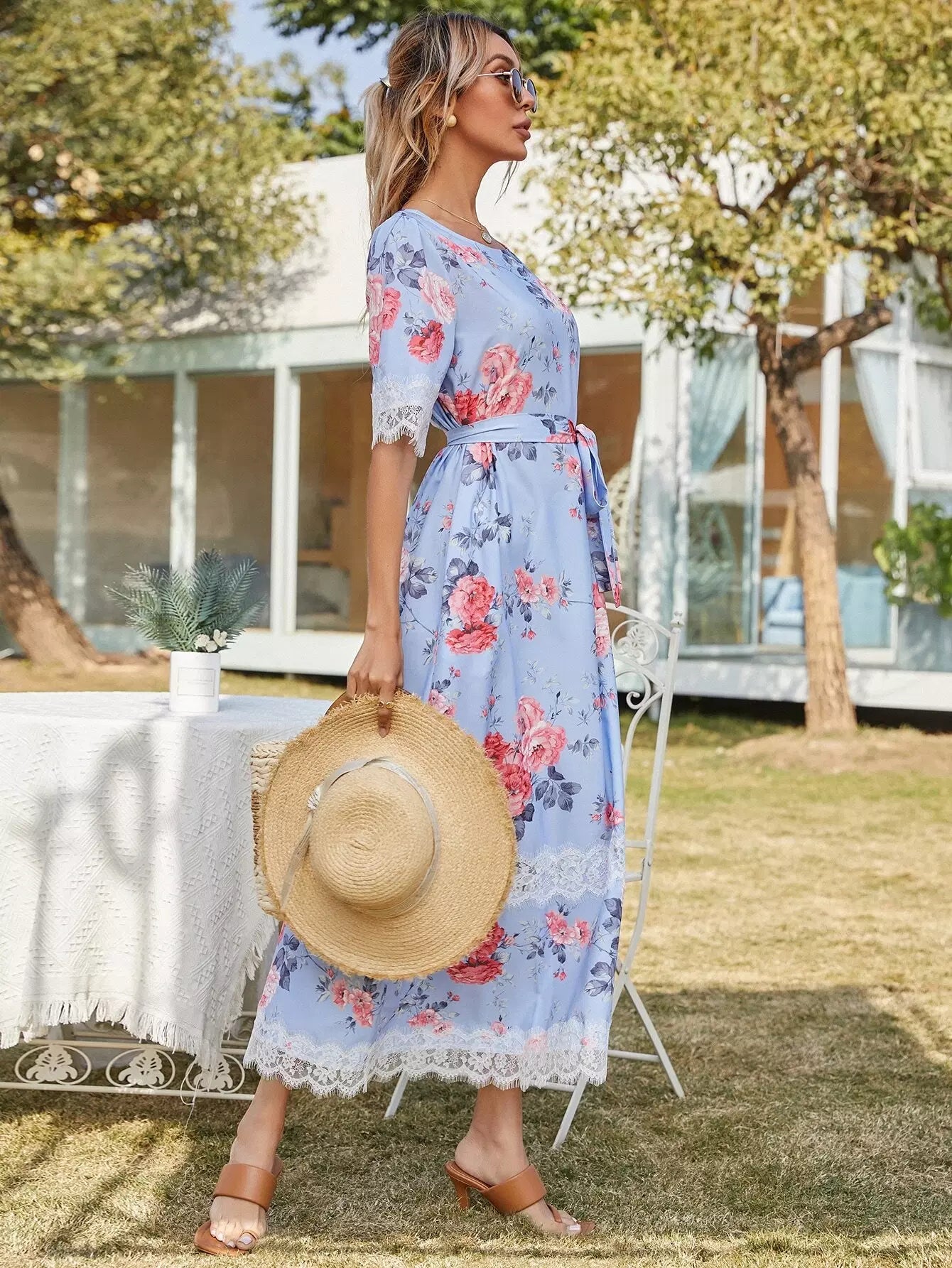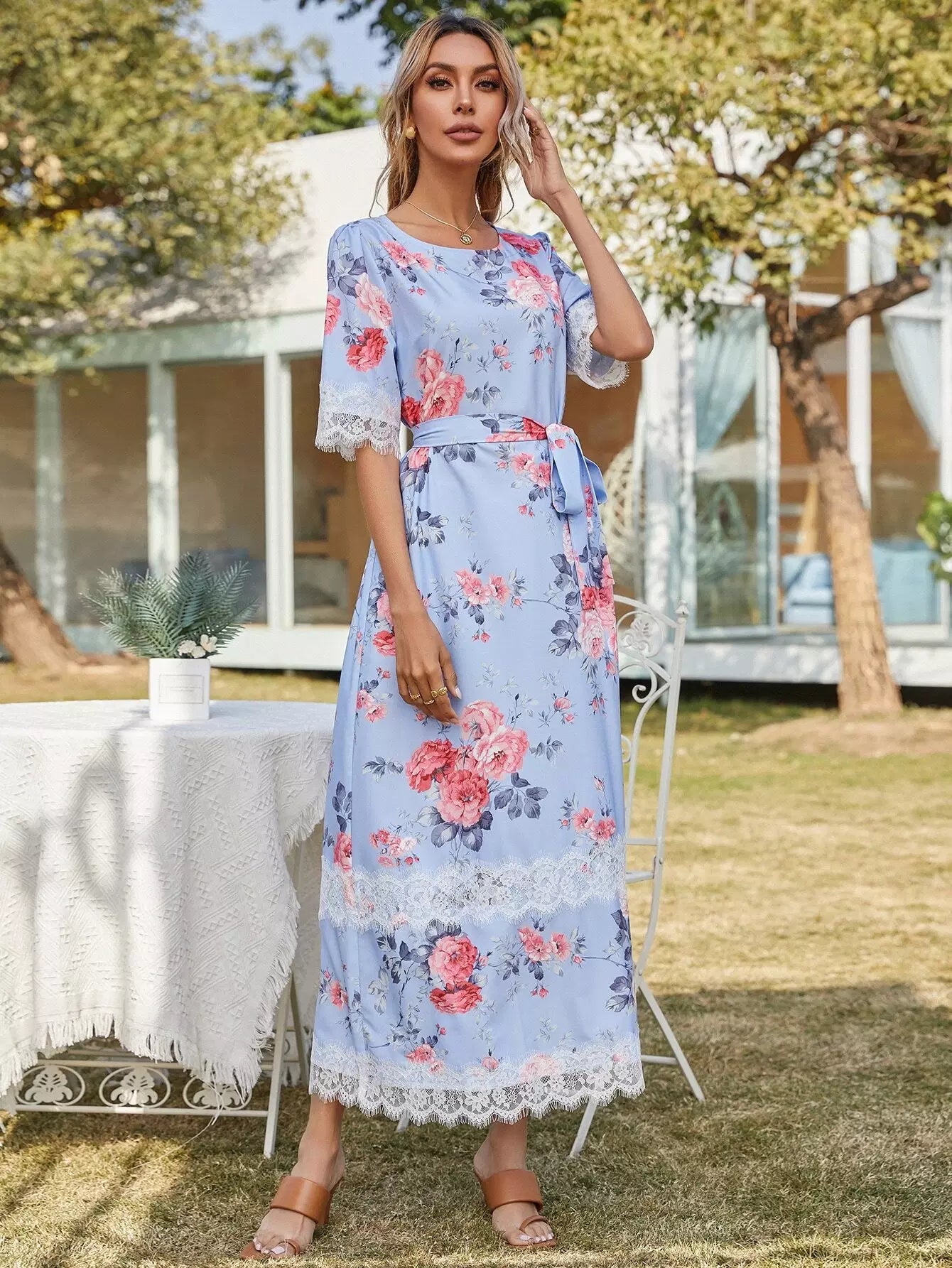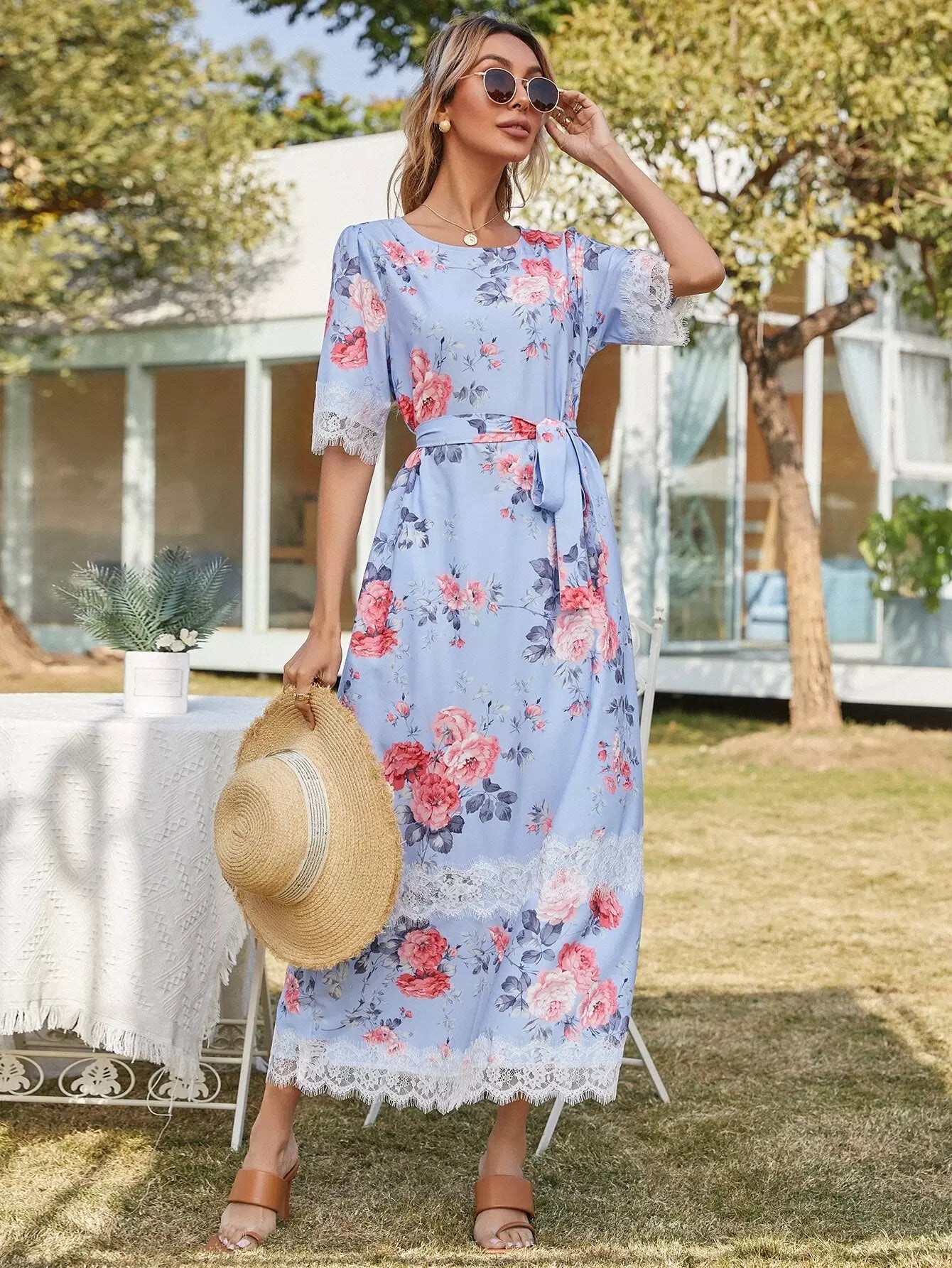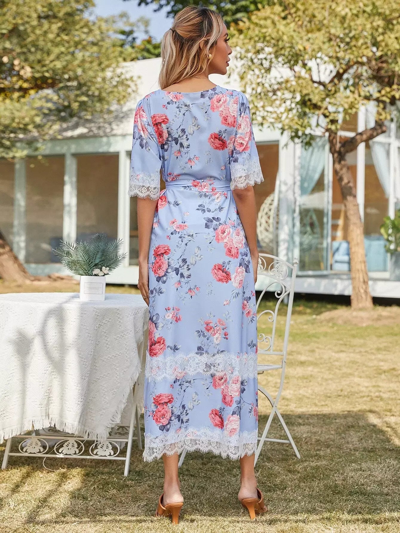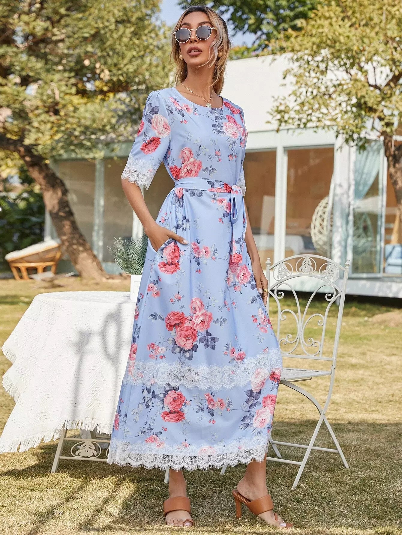 Contrast Lace Floral Print Dress Without Belt