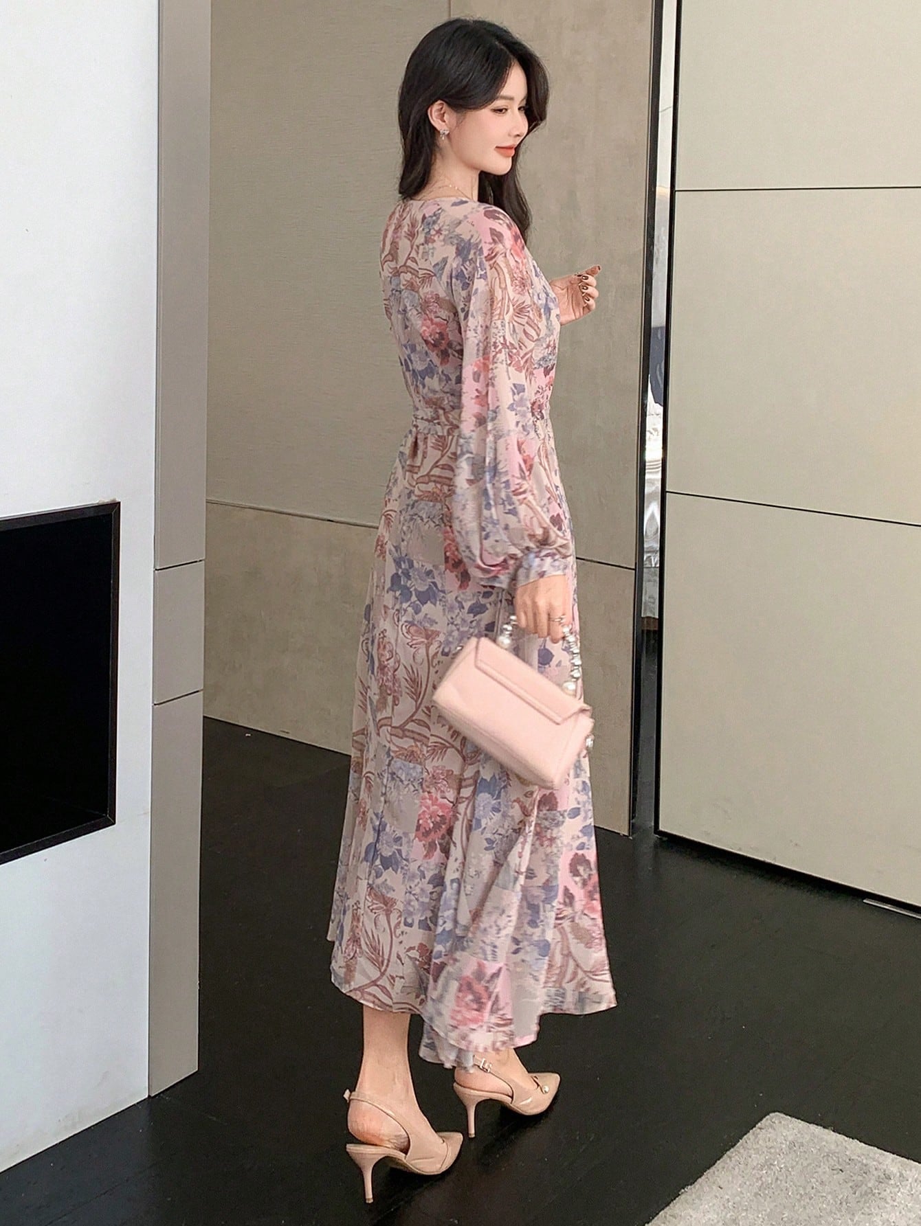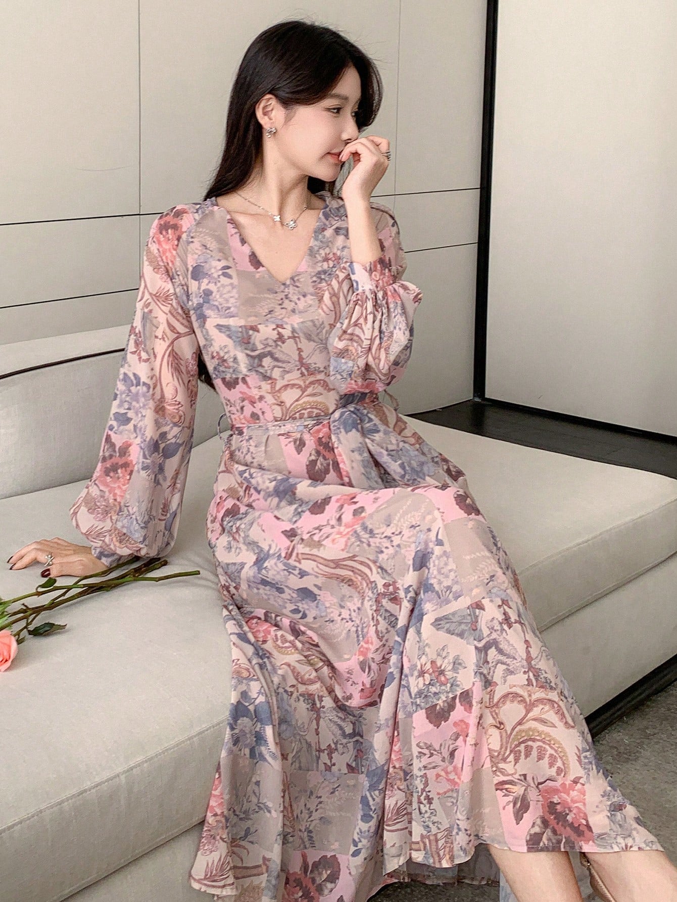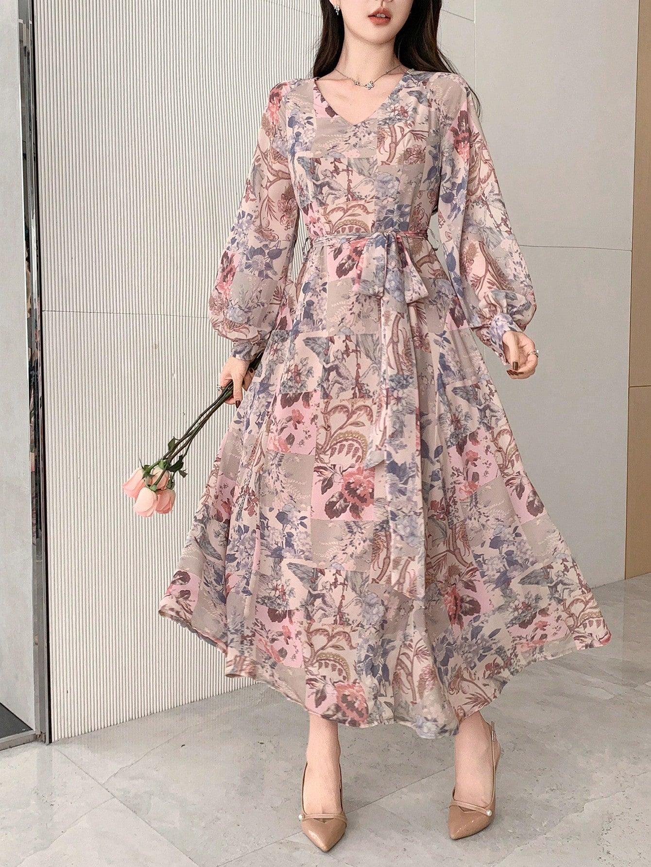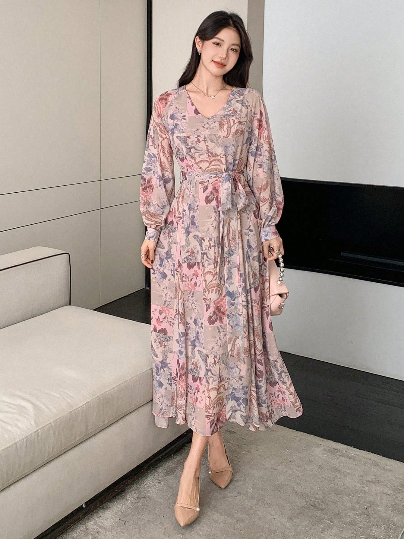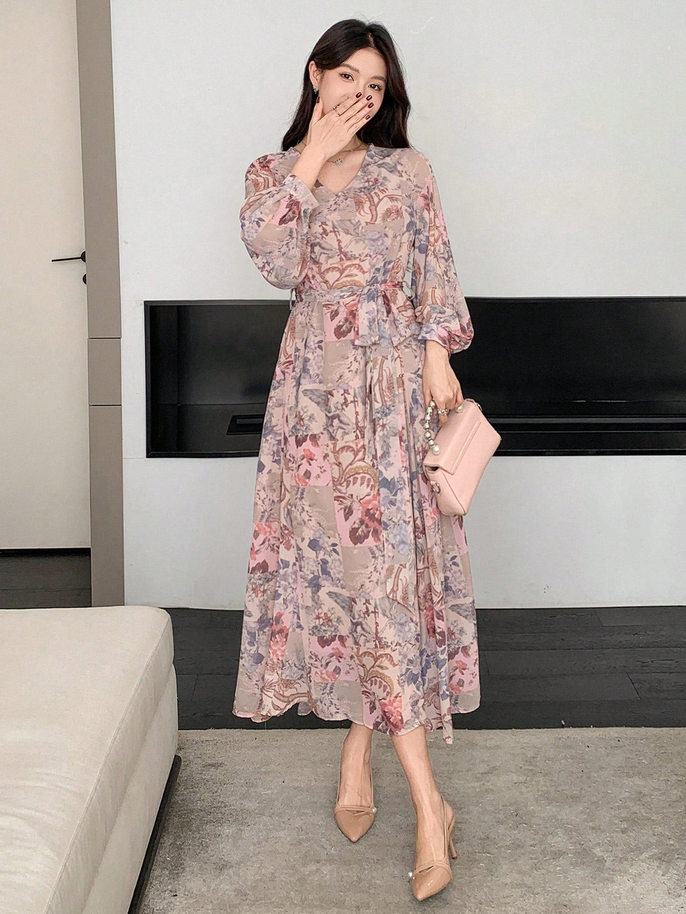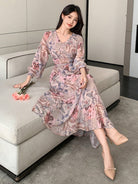 DAZY Women's Floral Patchwork Long Sleeve Mid-Length Dress, Spring/Fall