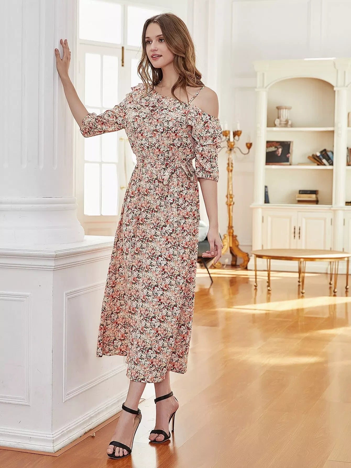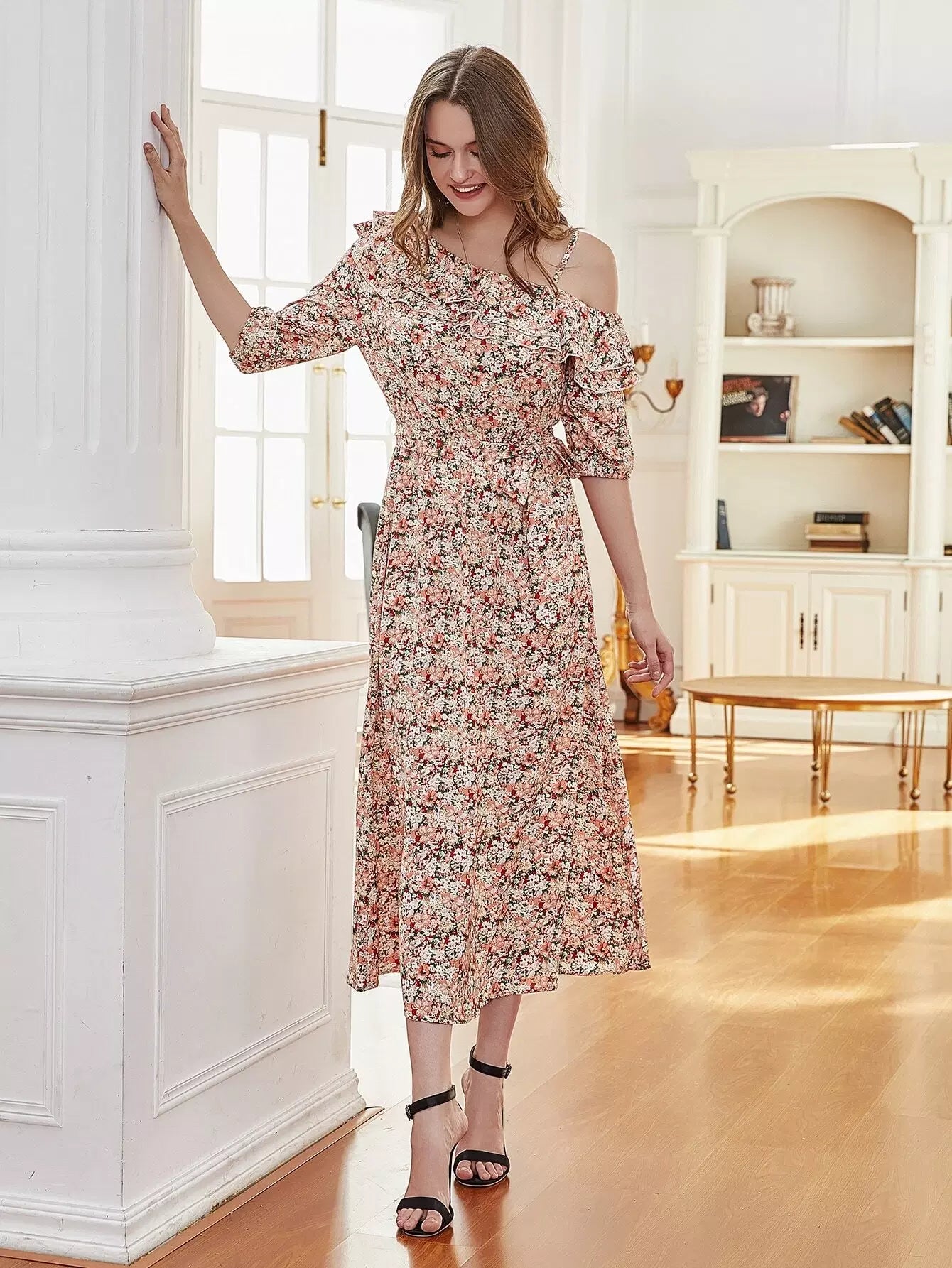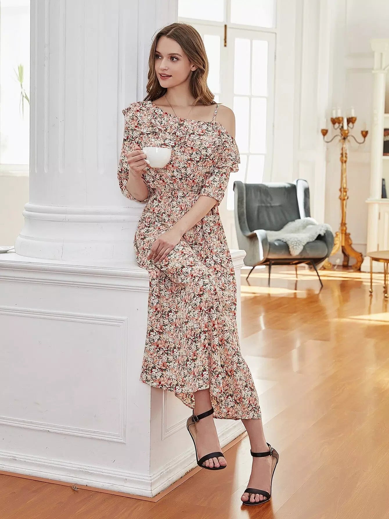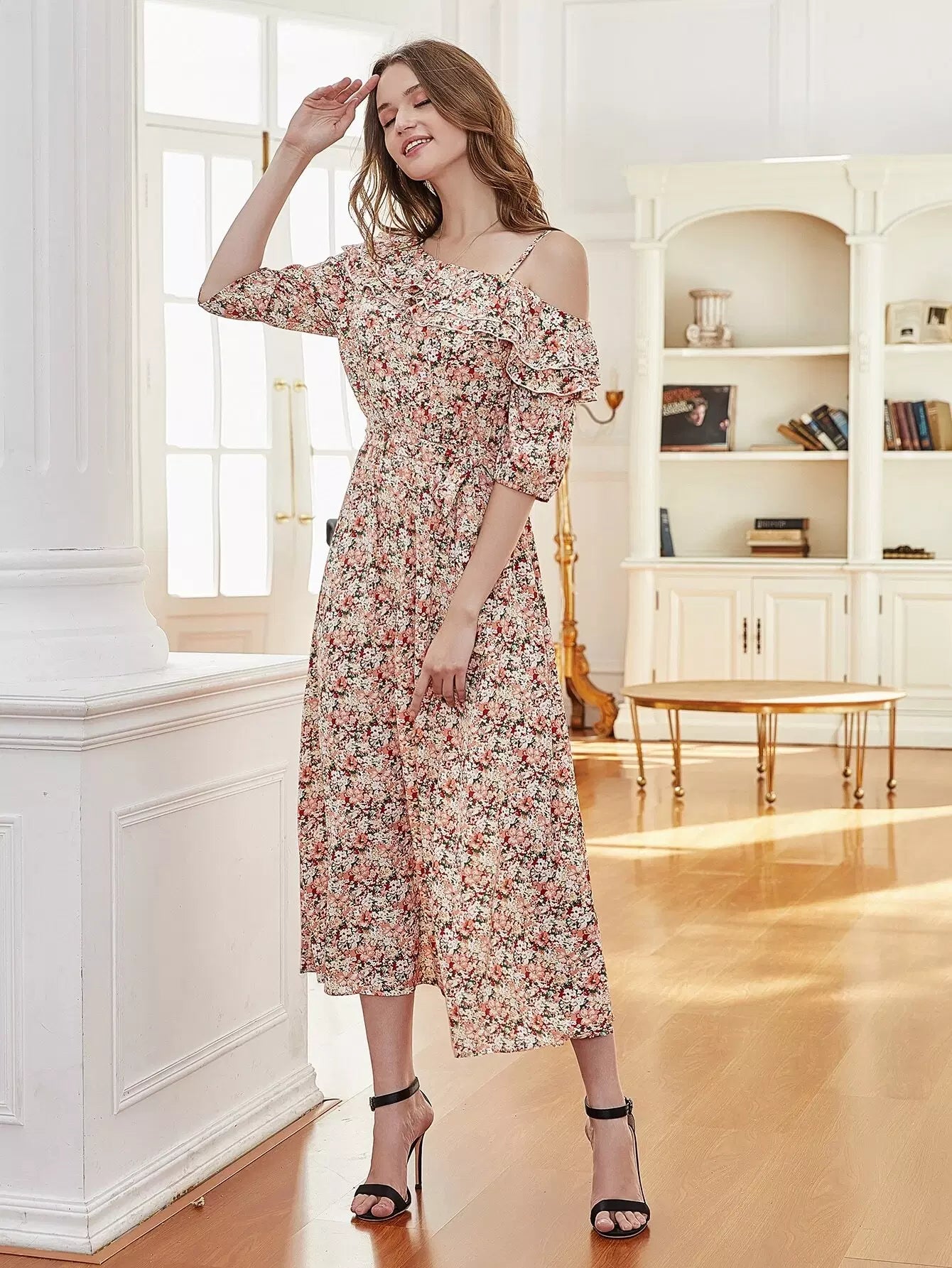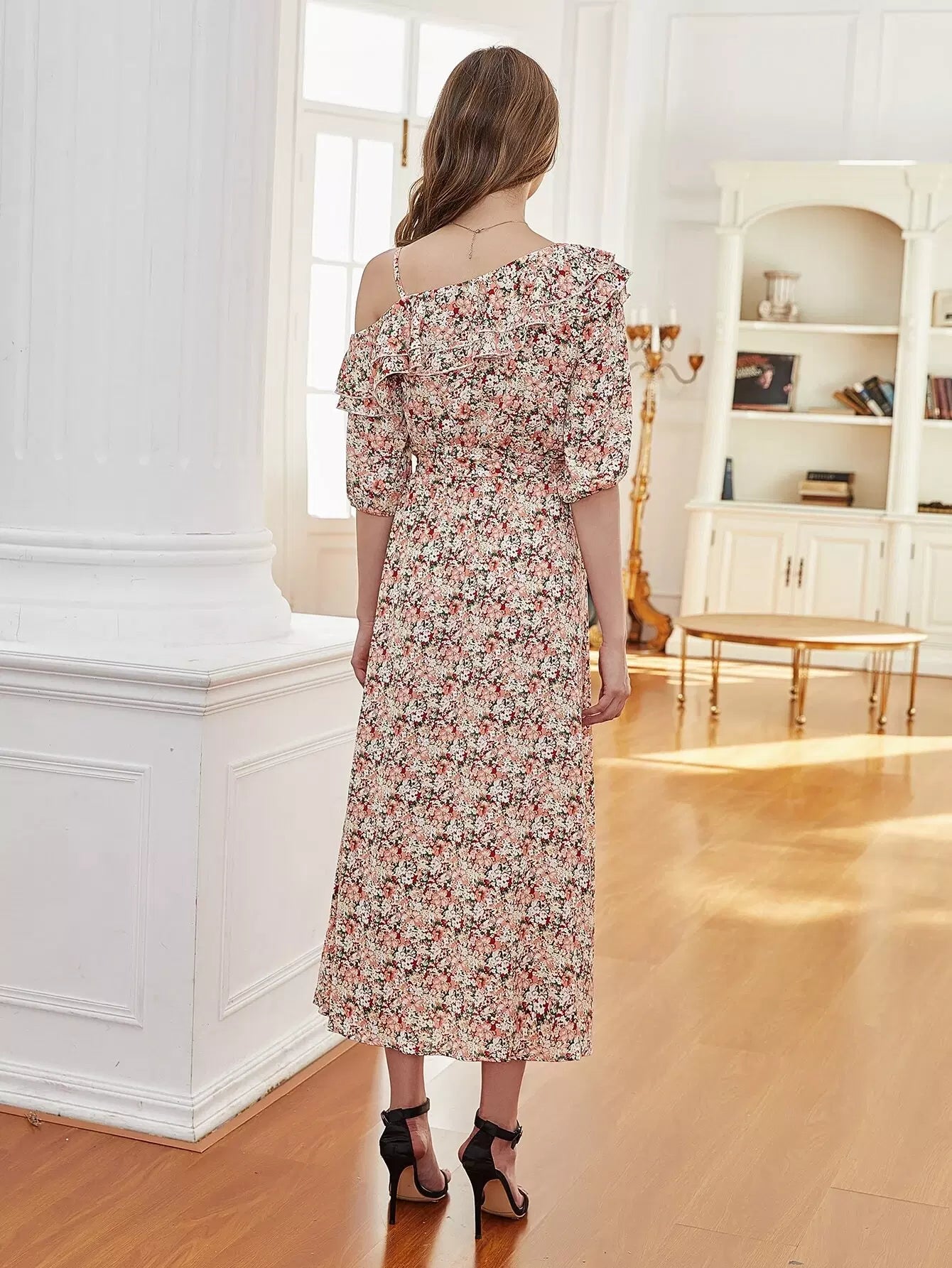 Ditsy Floral Layered Ruffle Panel Asymmetrical Neck Dress