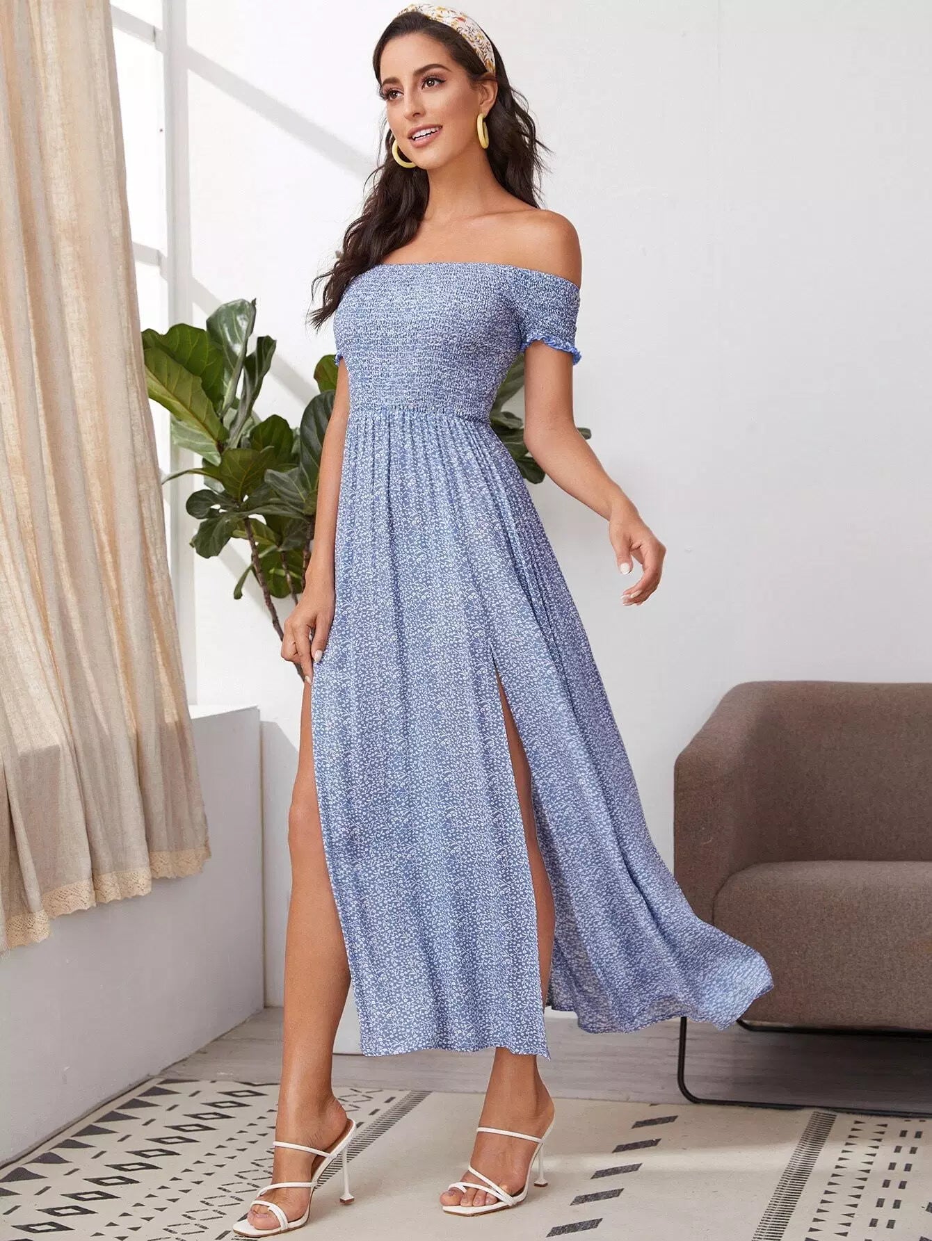 Ditsy Floral Print M-slit Hem Shirred Bardot Dress