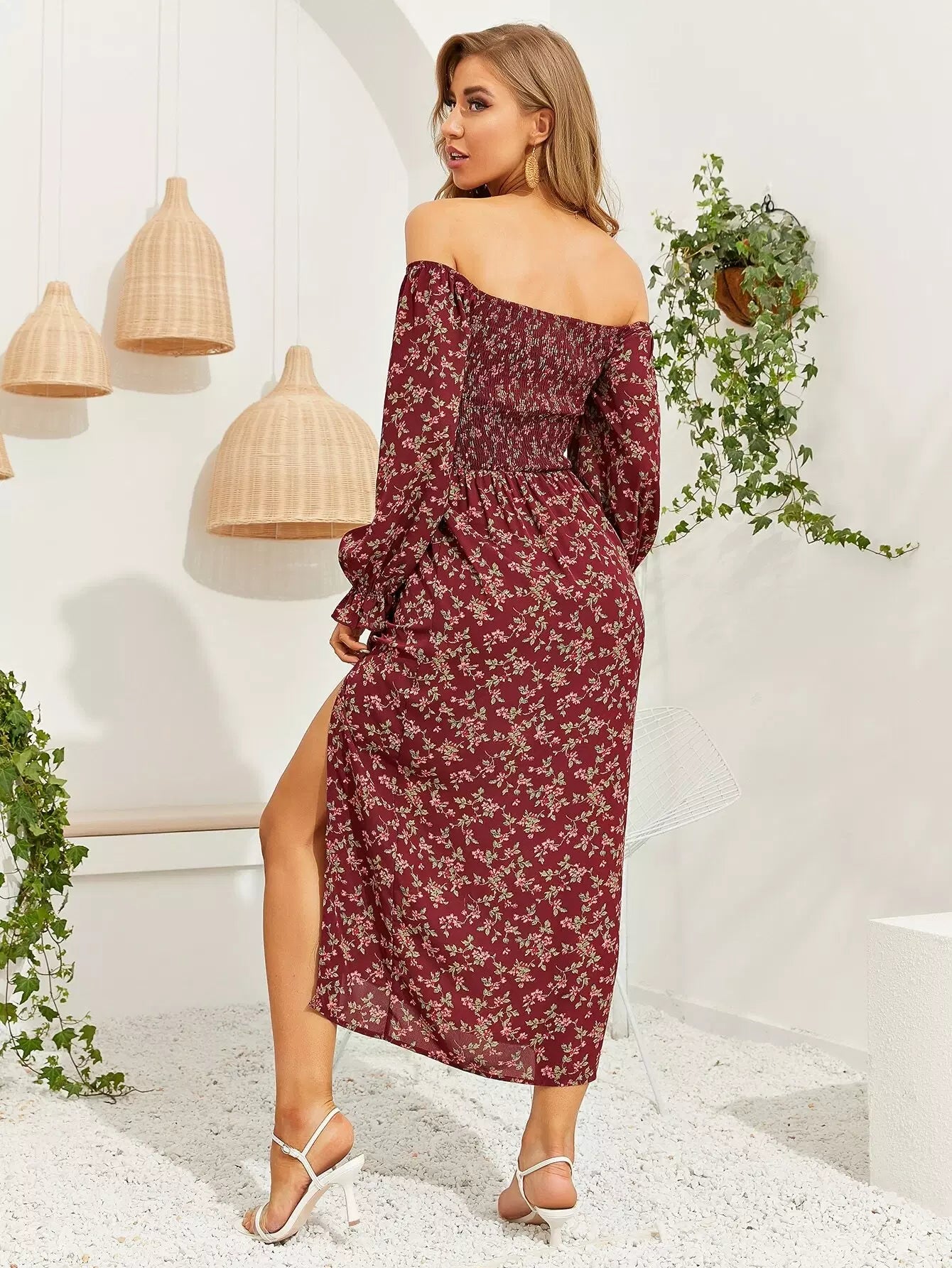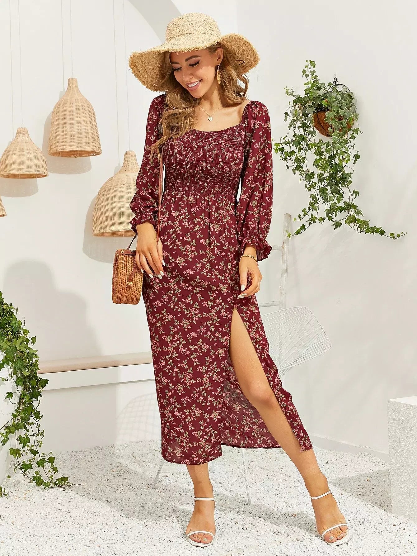 Ditsy Floral Split Thigh Shirred Bodice Dress