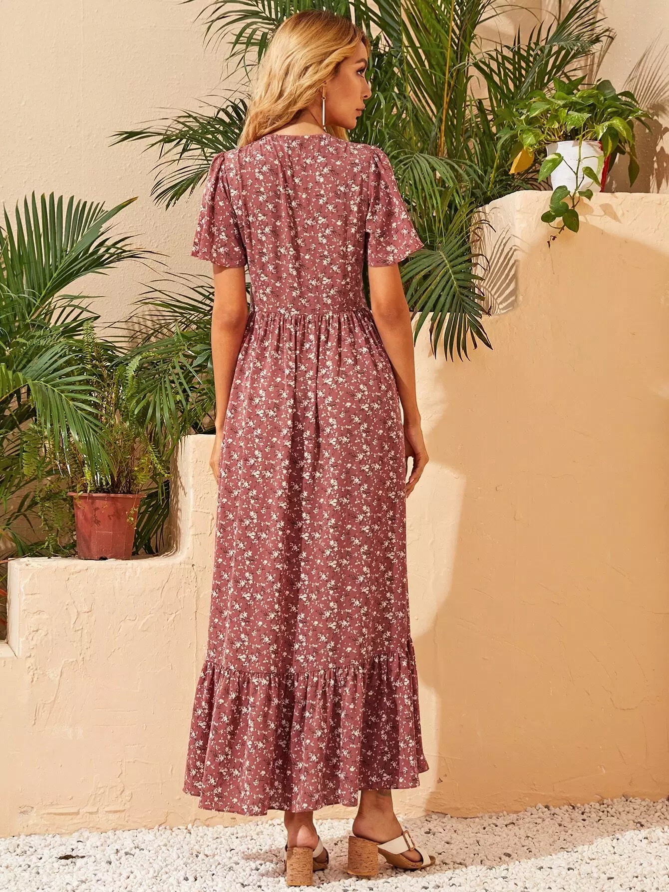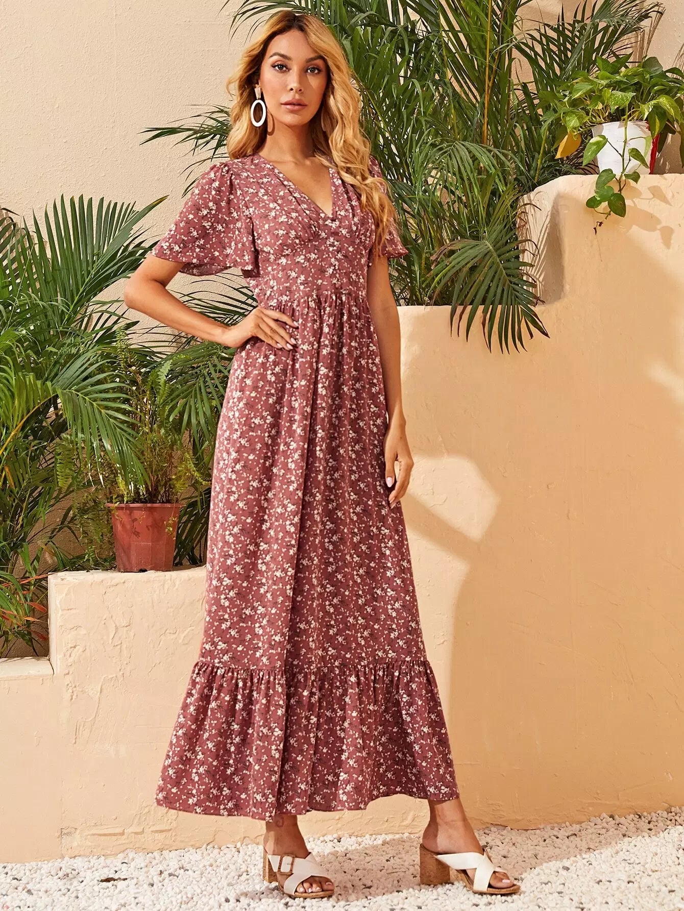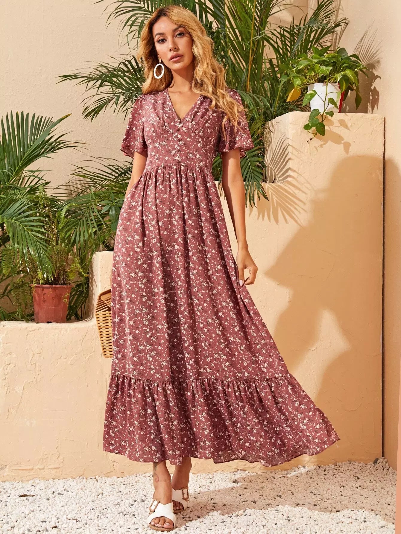Ditsy Floral V-Neck Ruffled Maxi Dress