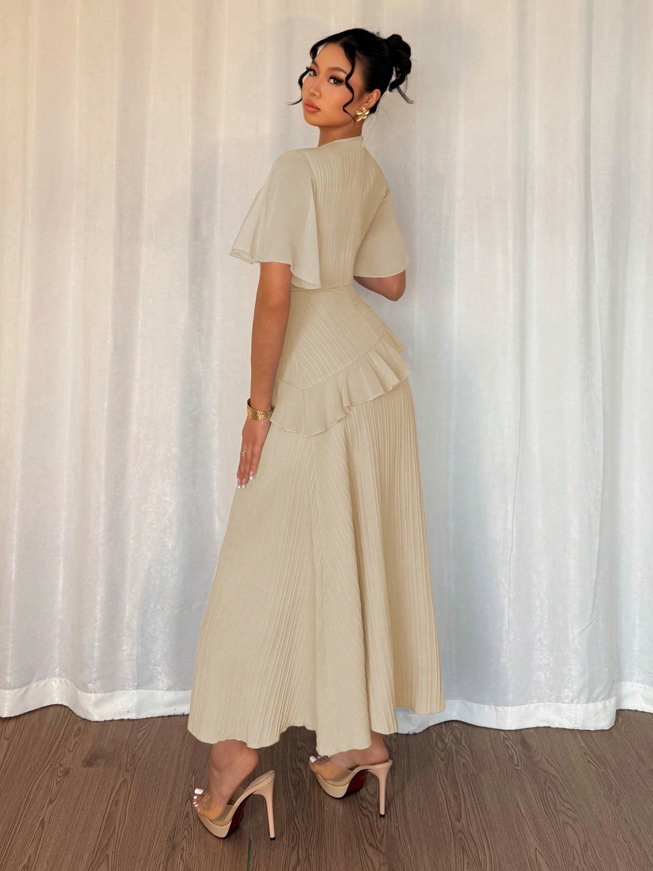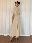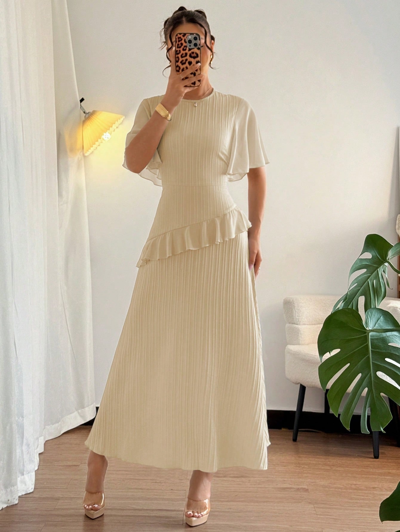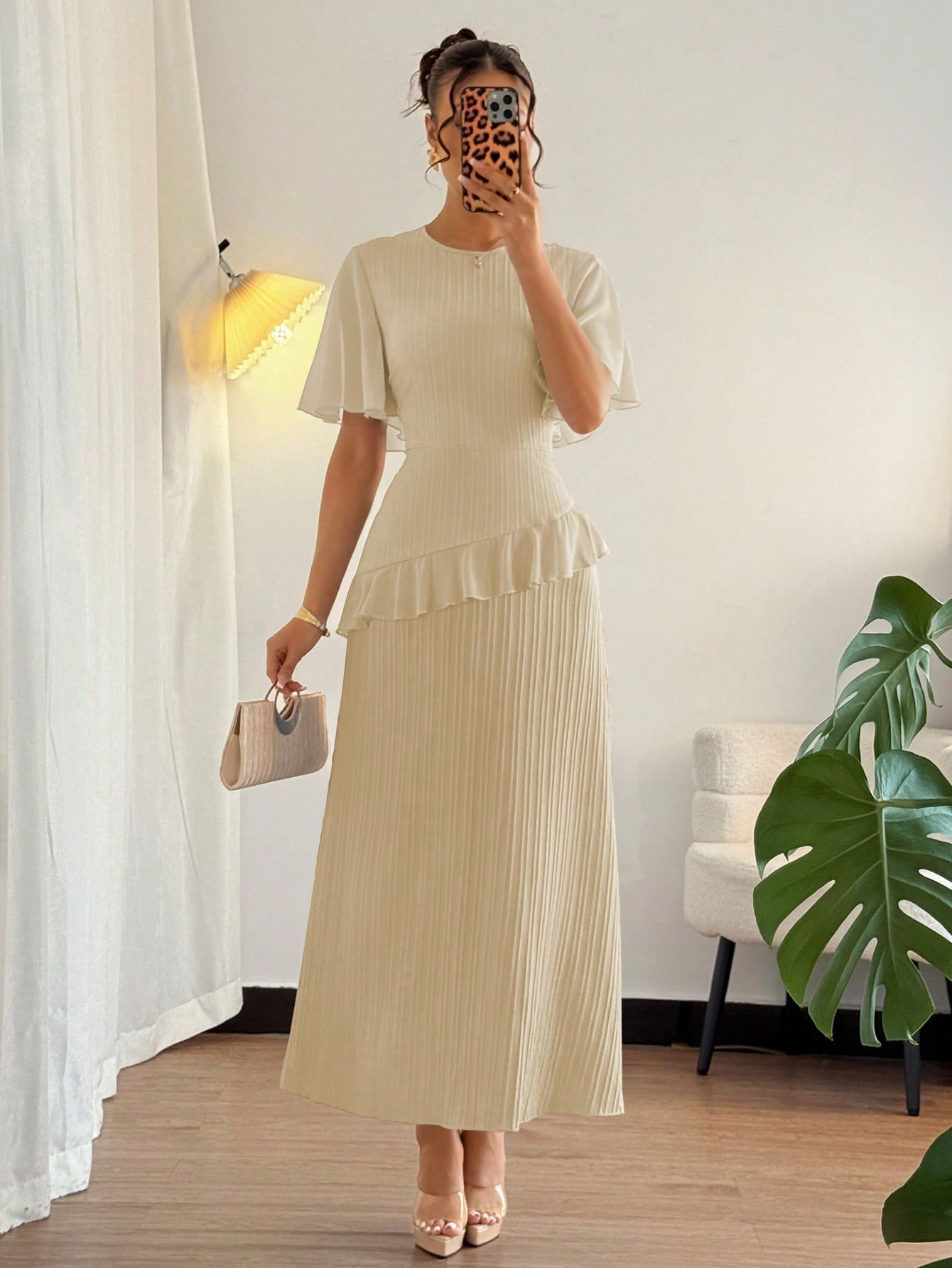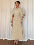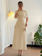 Elenzga New Women's Textured Woven Fabric Round Neck Chiffon Ruffle Sleeve High-Waisted Maxi Casual Without Belt