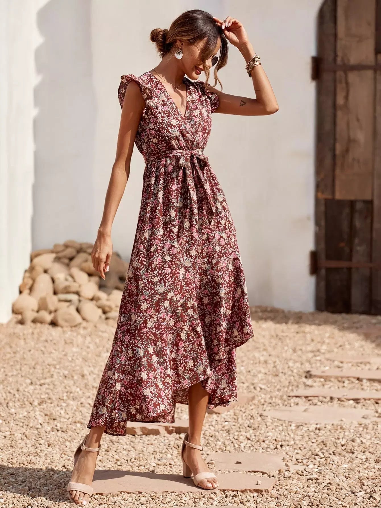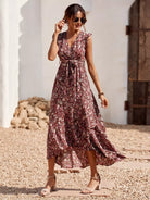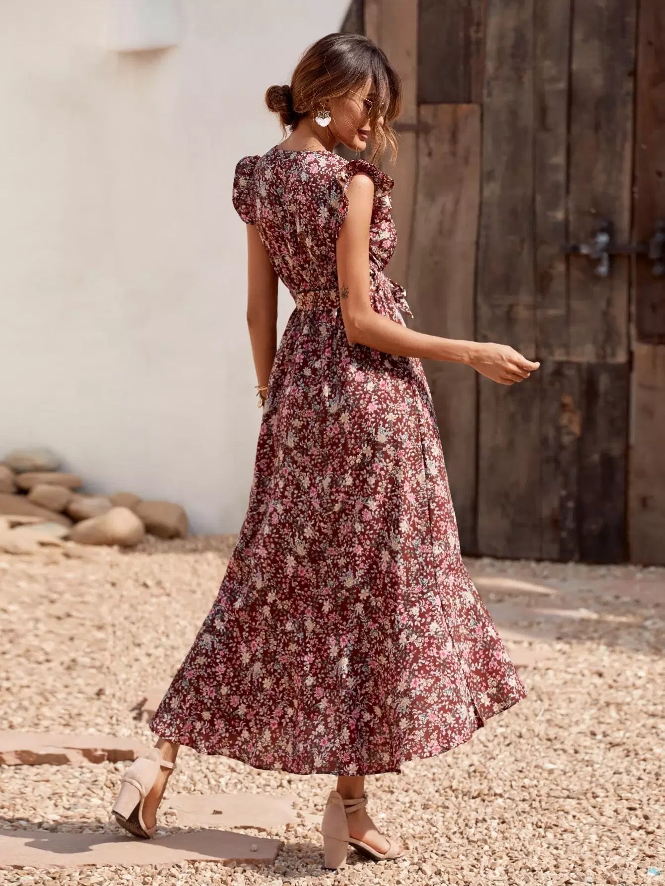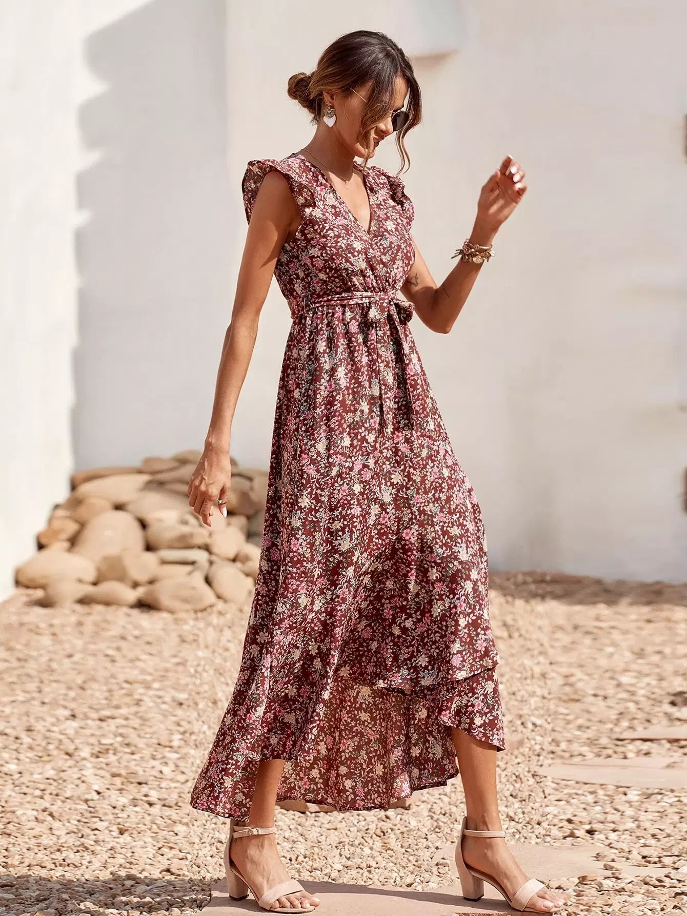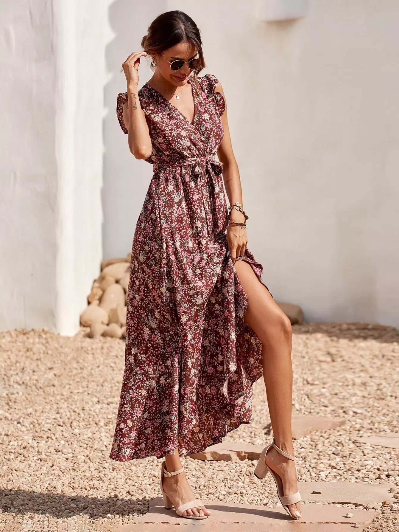 Floral Surplice Front Ruffle Hem Dress Without Belt