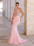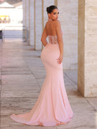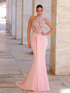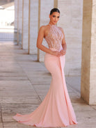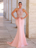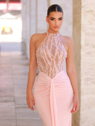 Glamrae Elegant Luxury Pink Hand Embroidered Pearl Collar Sexy Sheer Ruffle Fishtail Dress With Sashes
