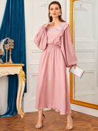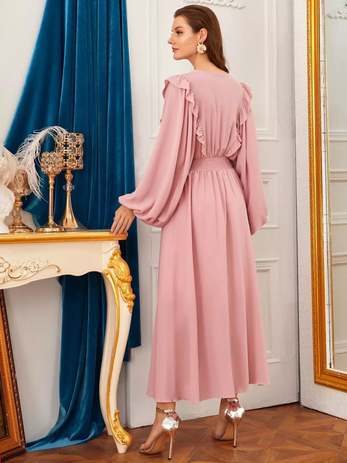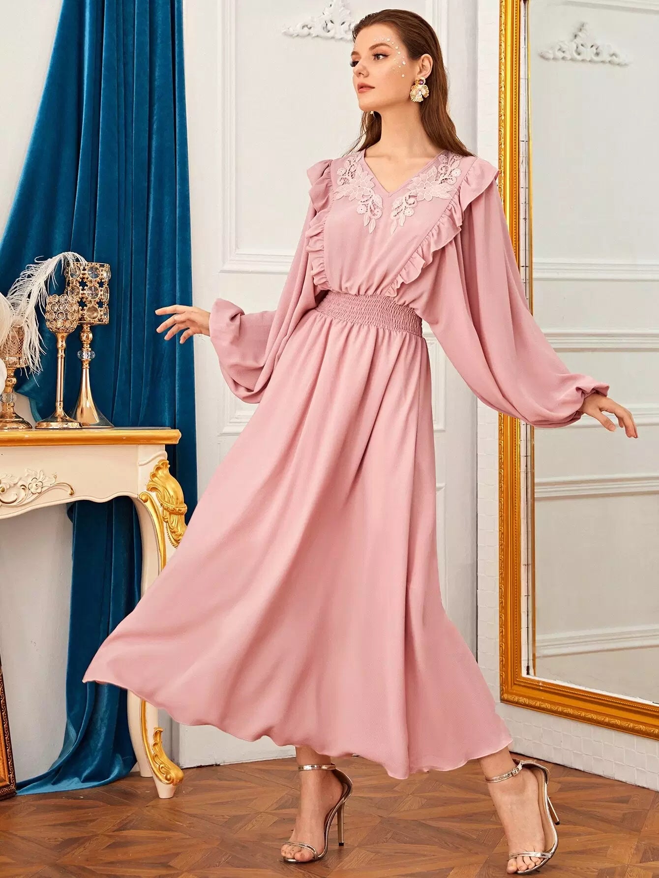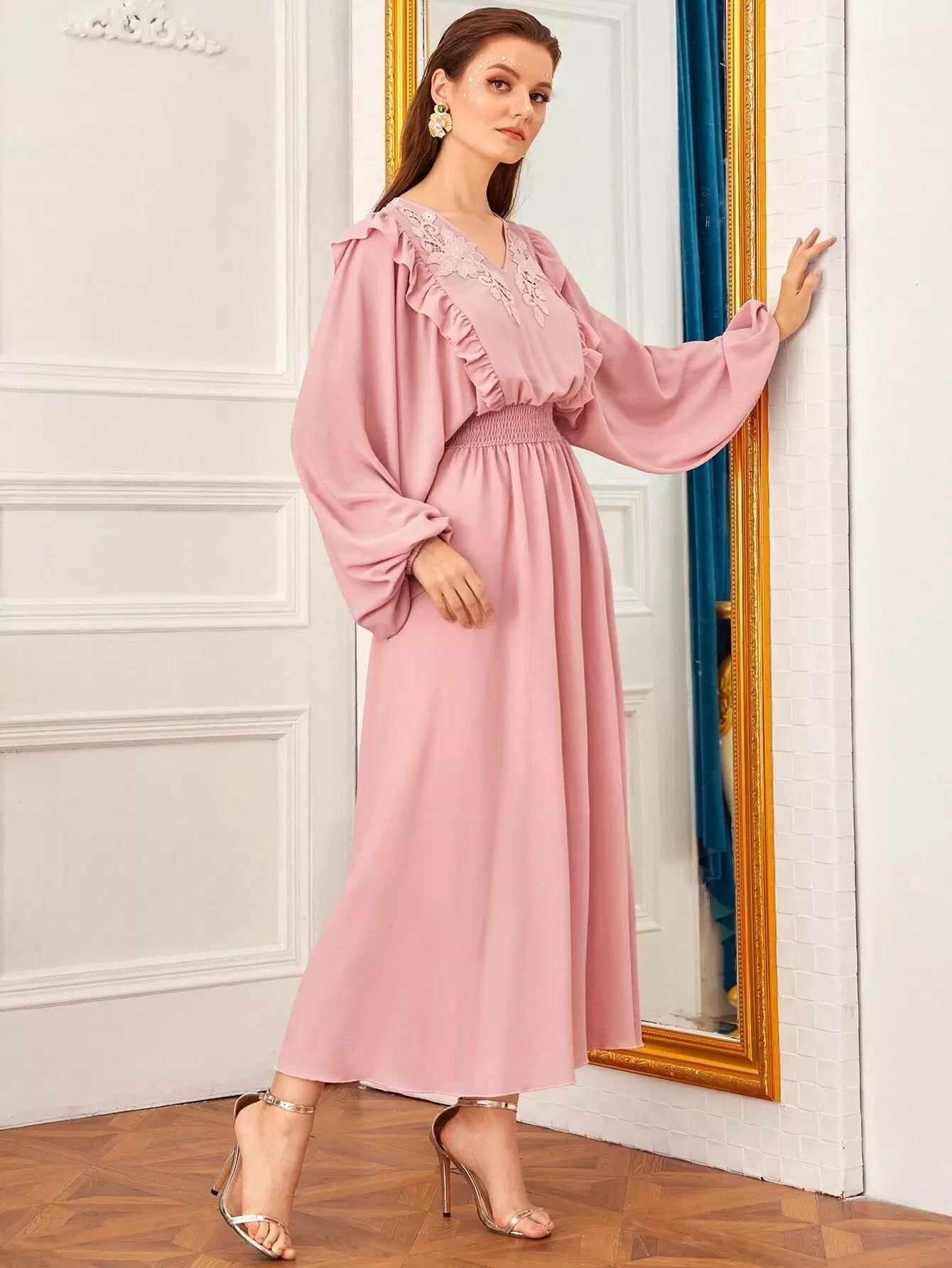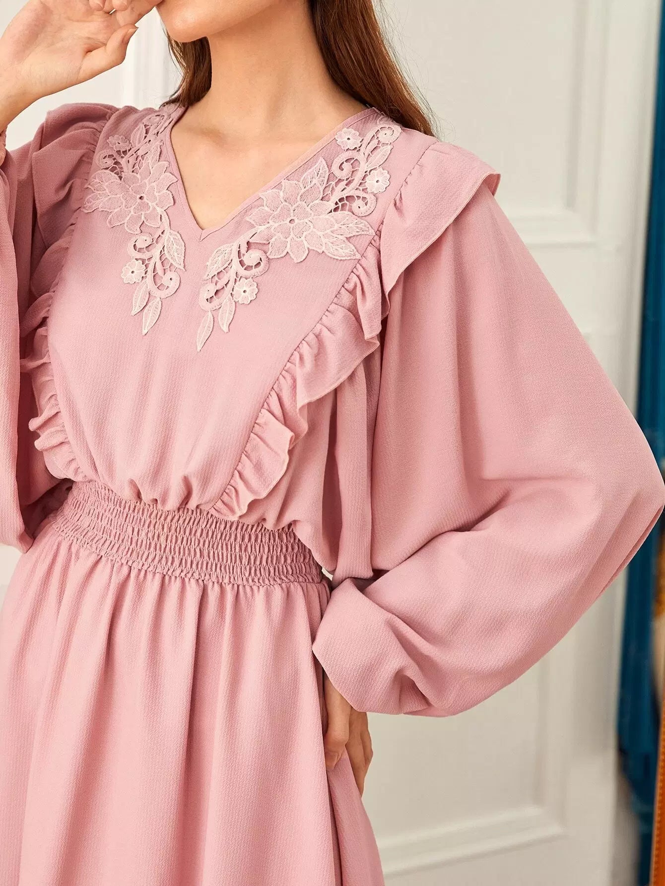 Guipure Lace Yoke Ruffle Trim Batwing Sleeve Dress