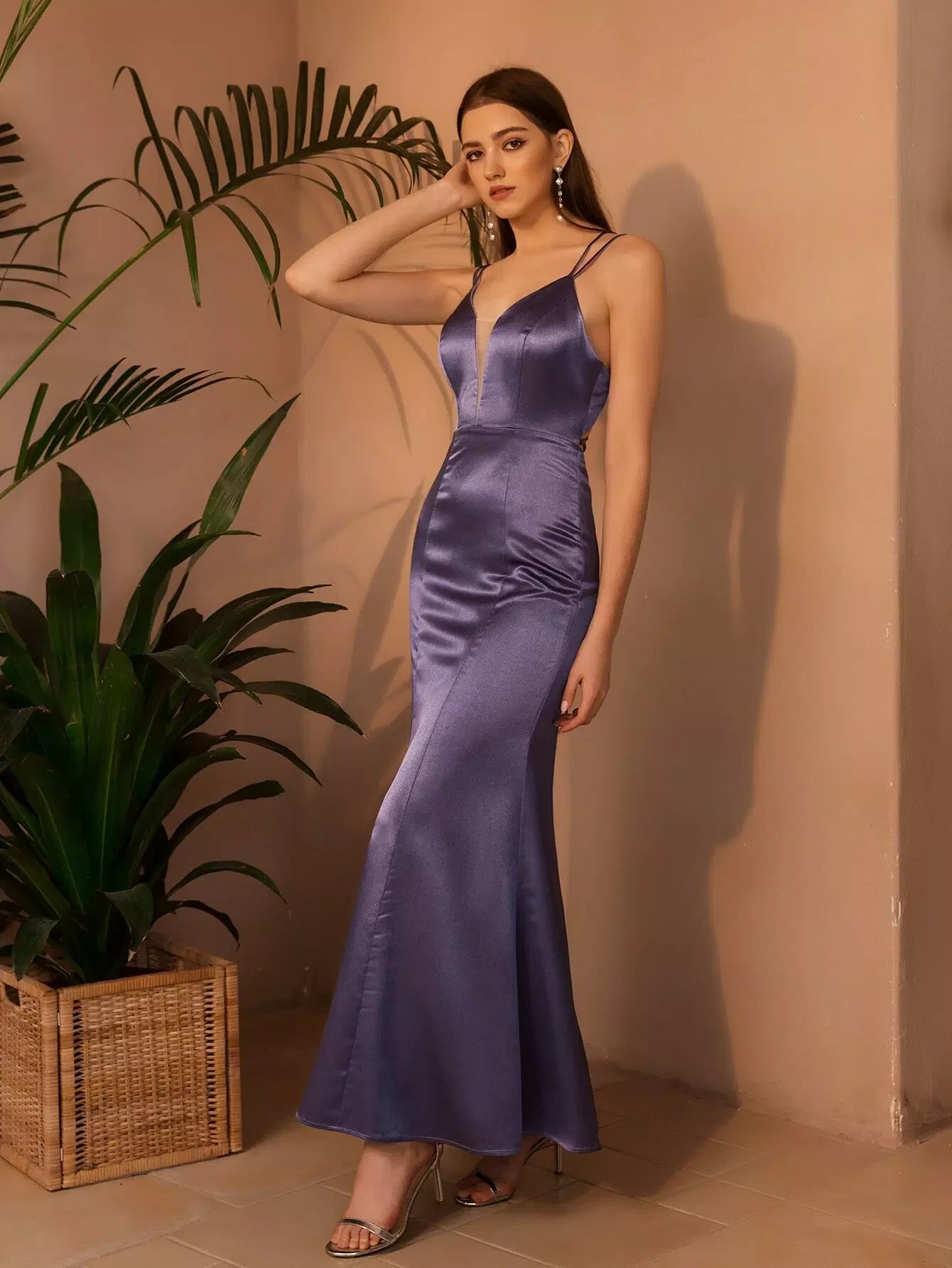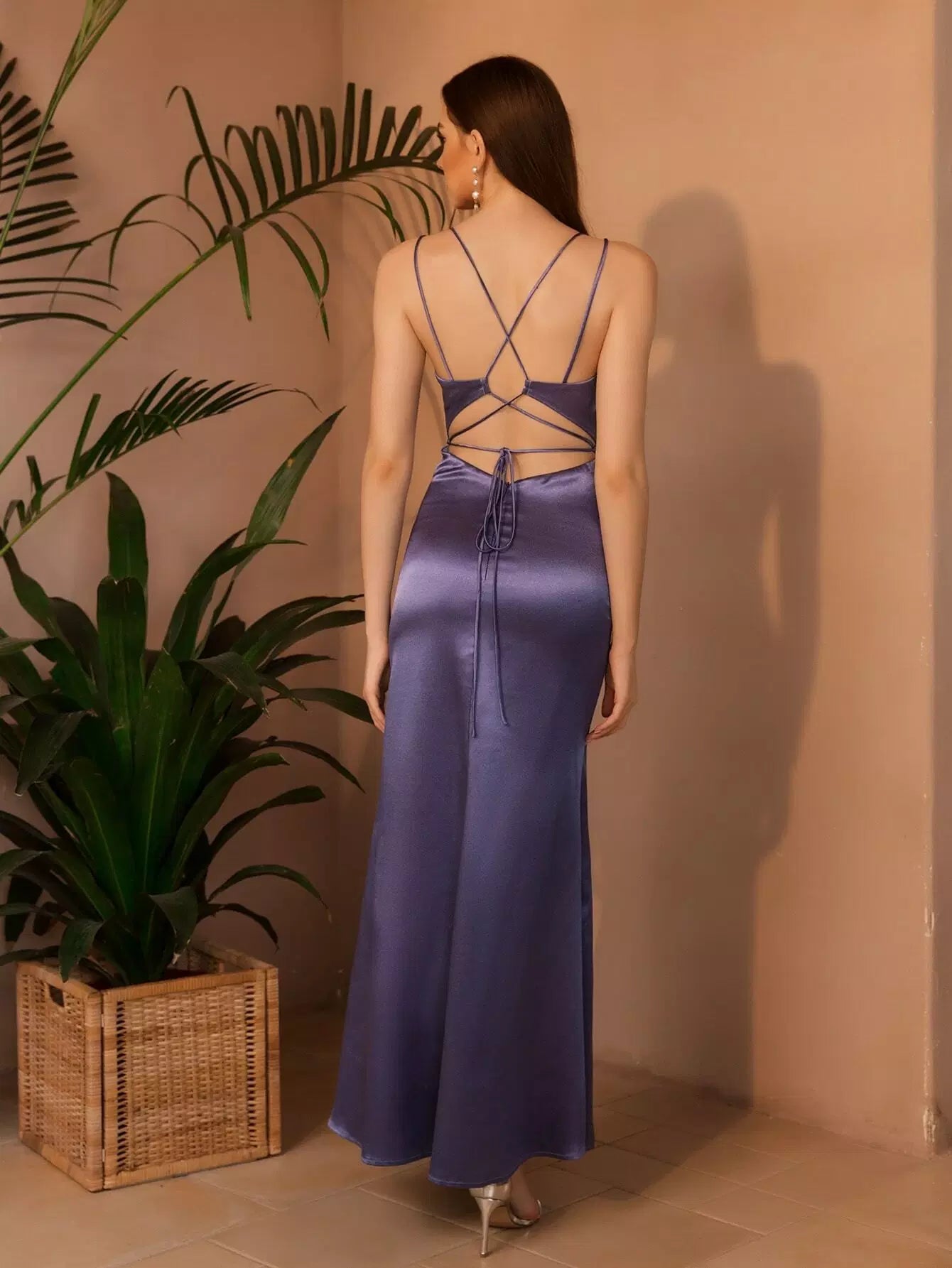 Mesh Insert Tied Backless Satin Mermaid Hem Dress