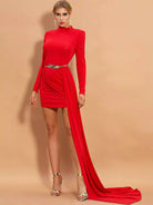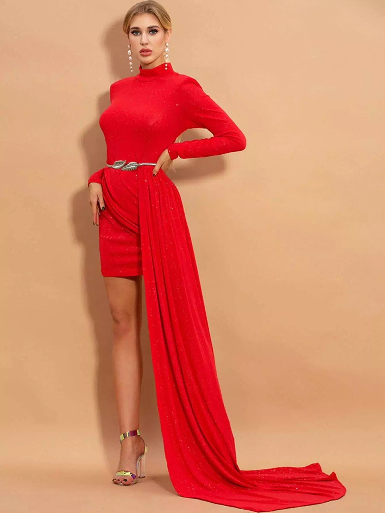 Mock-neck Draped Glitter Prom Dress Without Belt