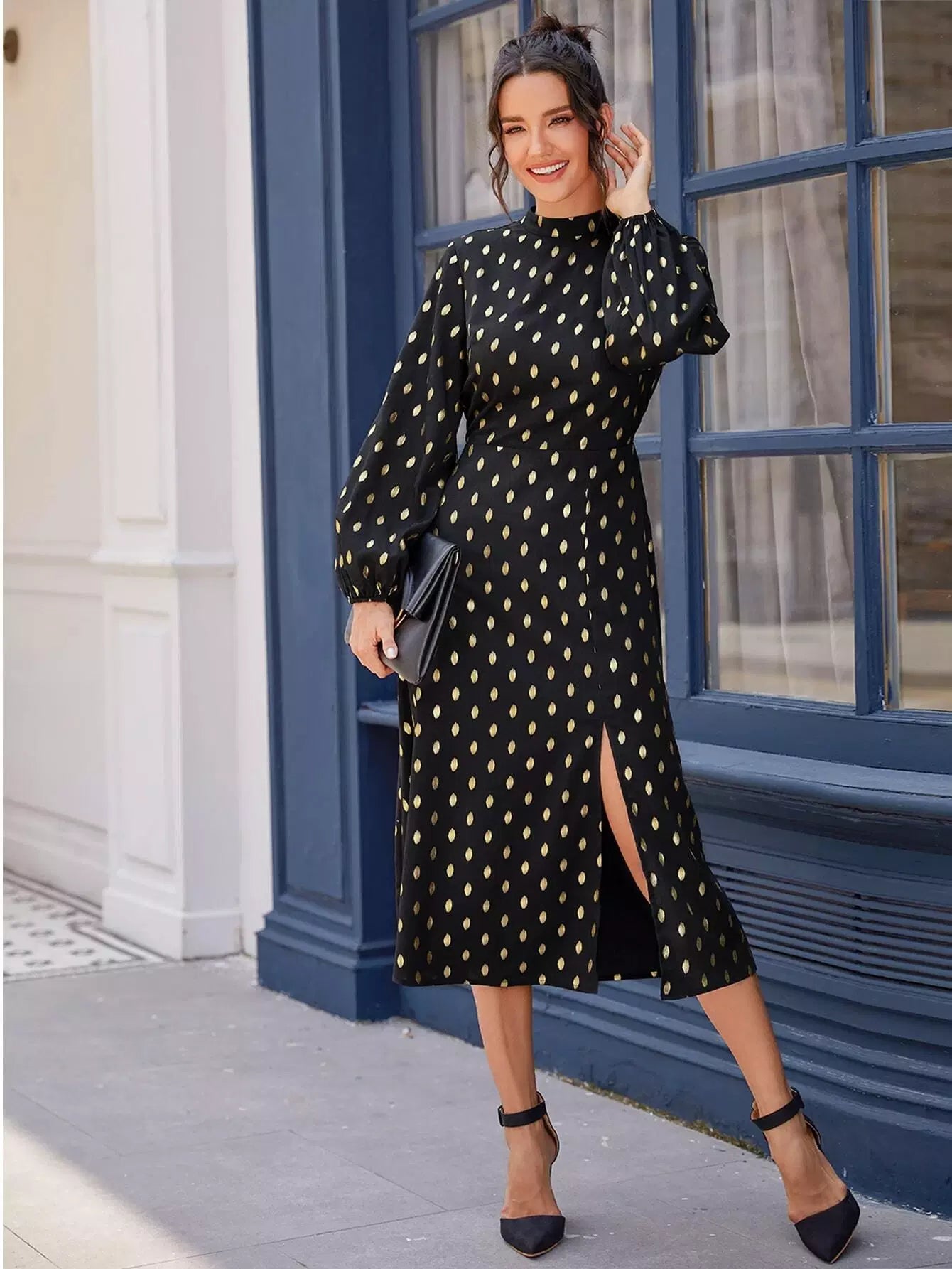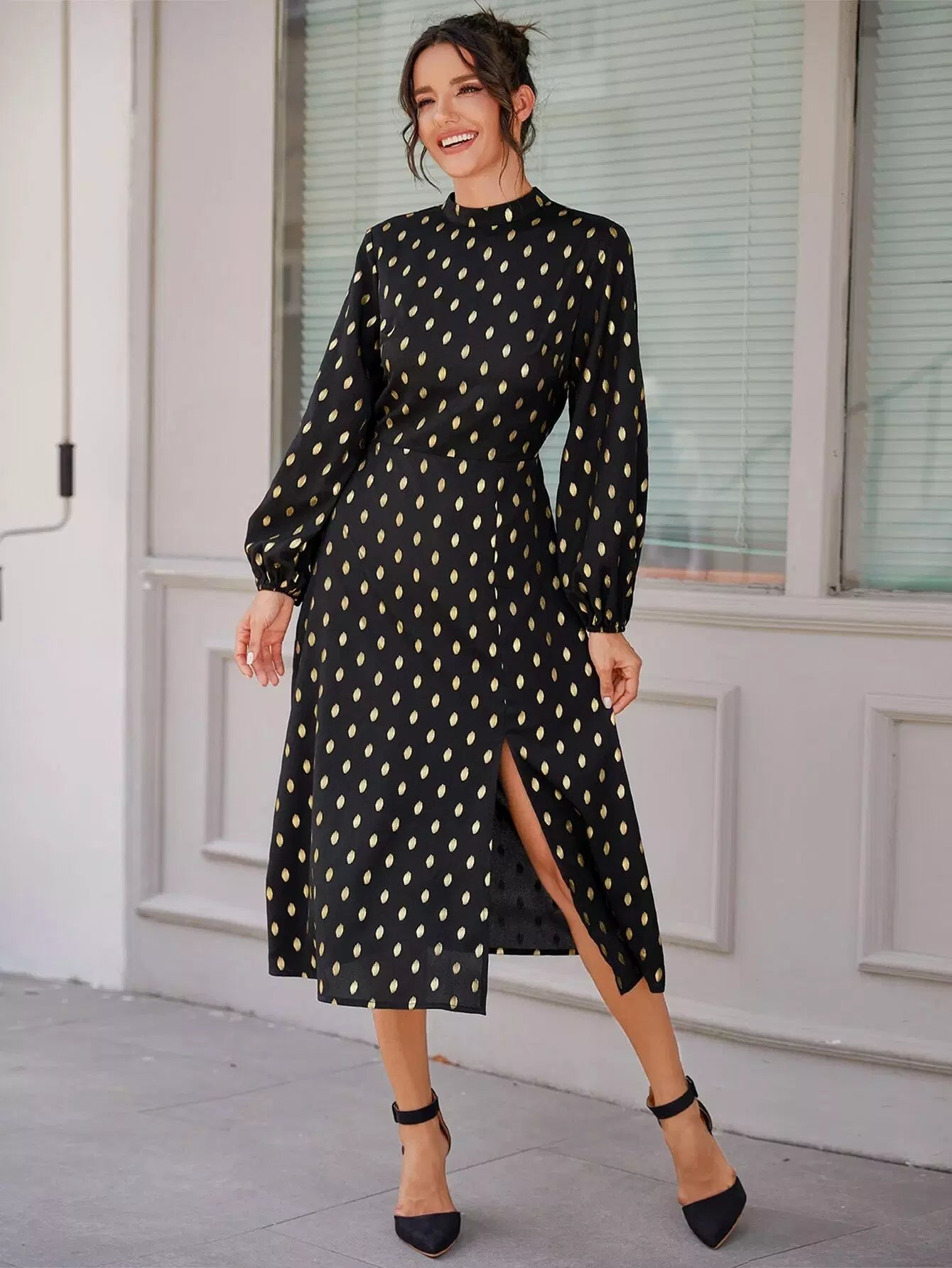 Mock Neck Gold Dot Split Thigh Dress