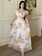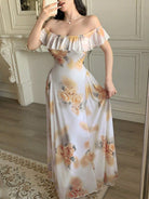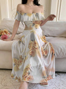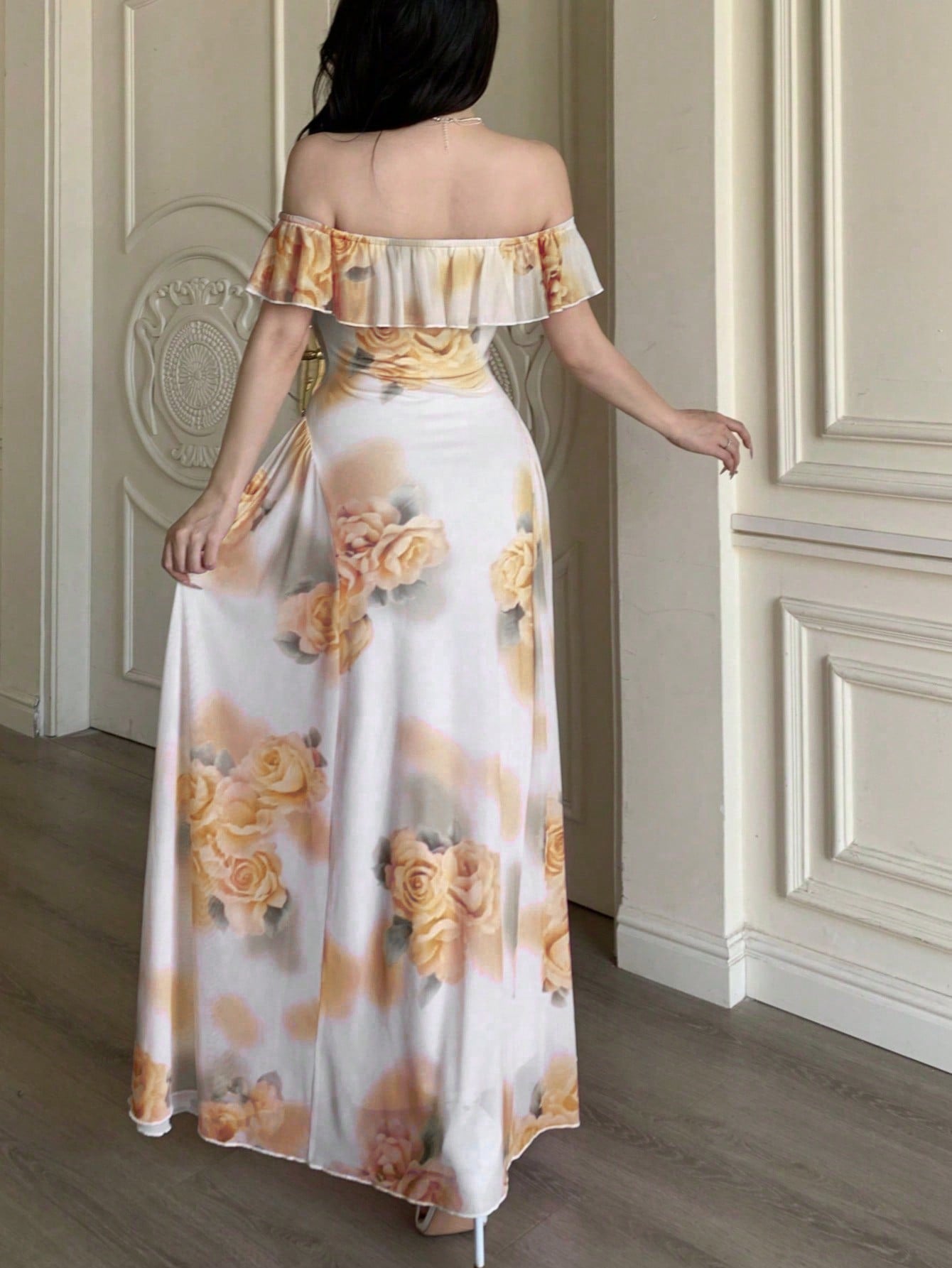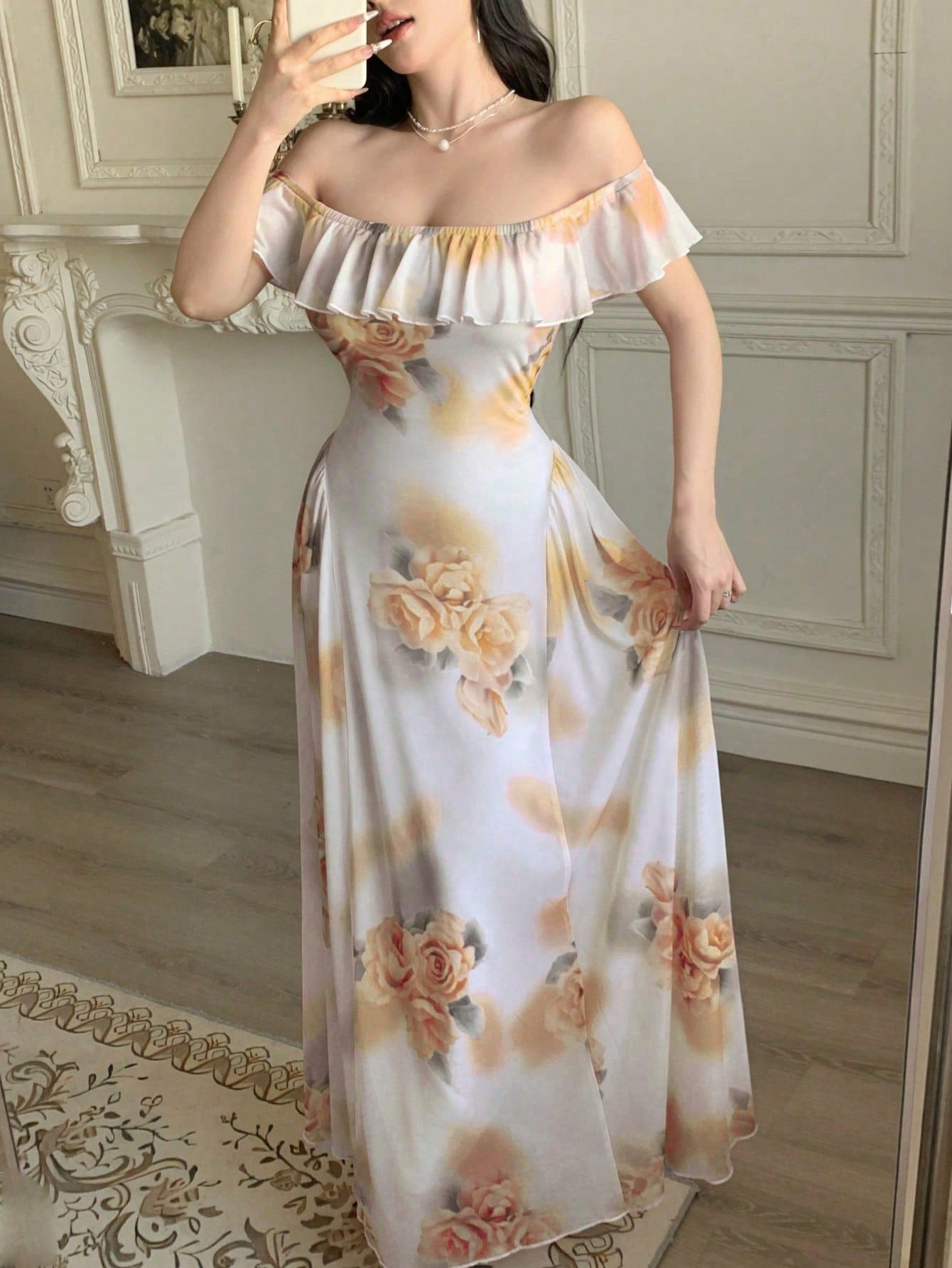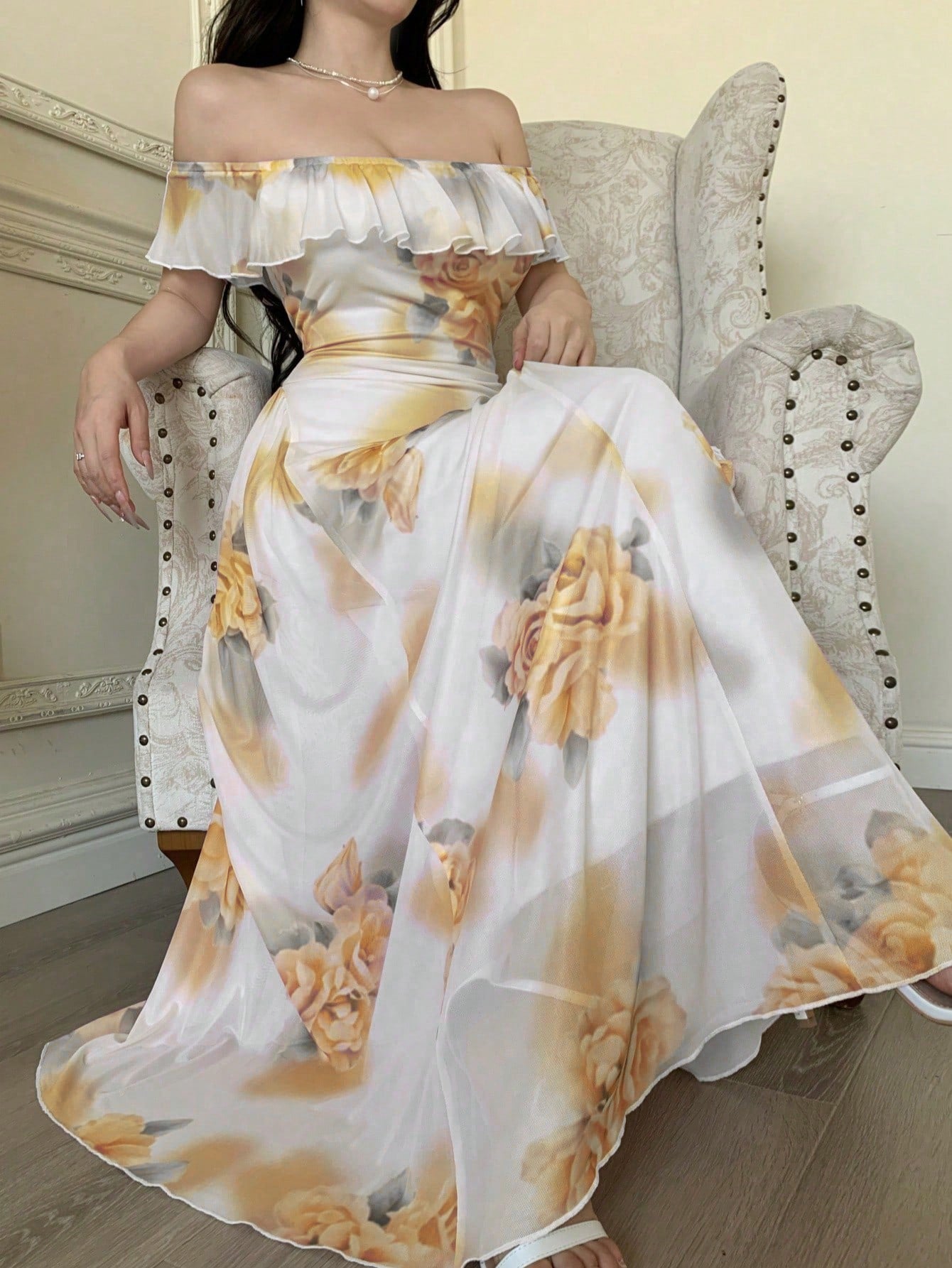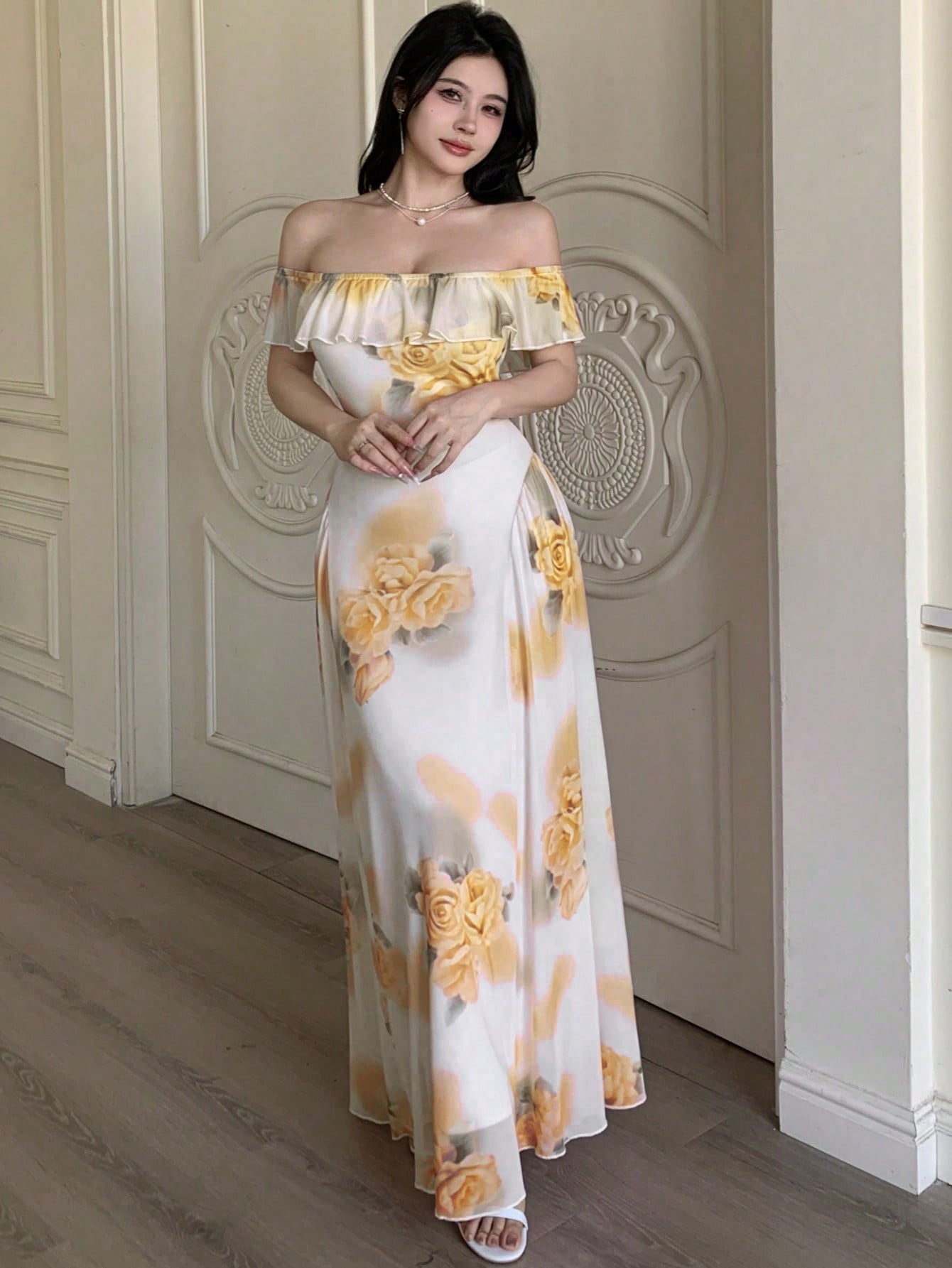 Modelyn Women's Off-Shoulder Ruffled Hem Floral Print Dress With Voluminous Skirt, Summer