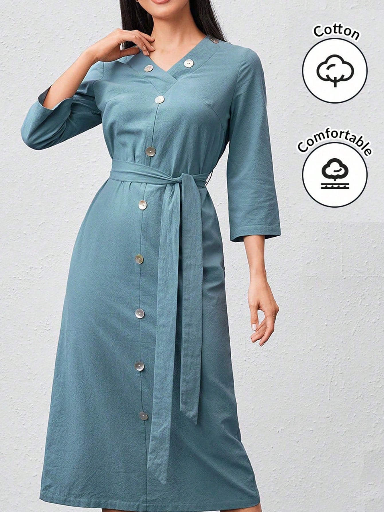 Mulvari Button Detail Waist Cinched Long Sleeve Dress