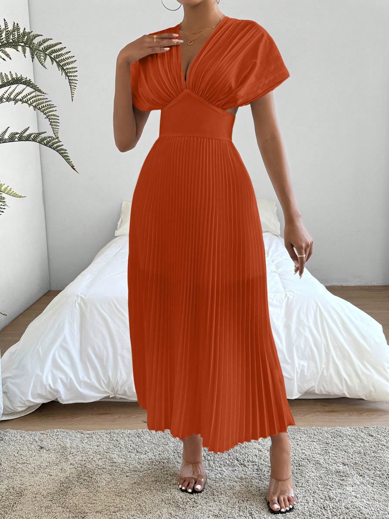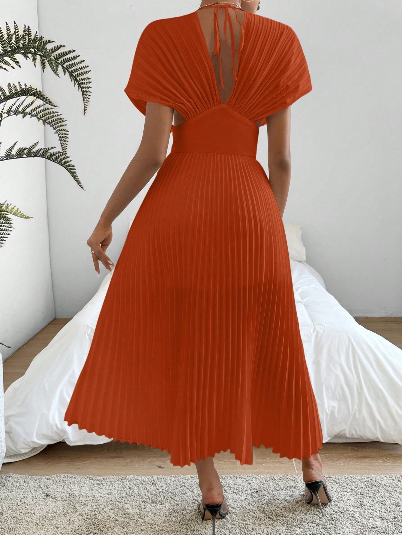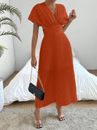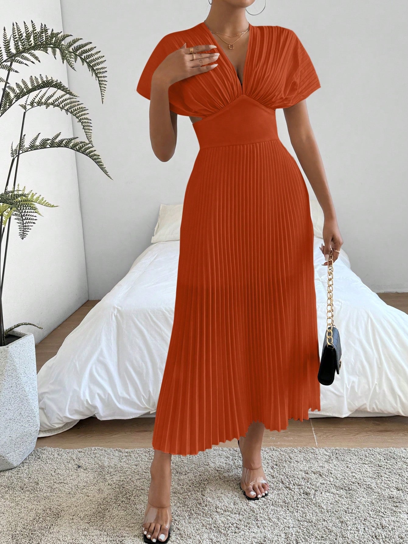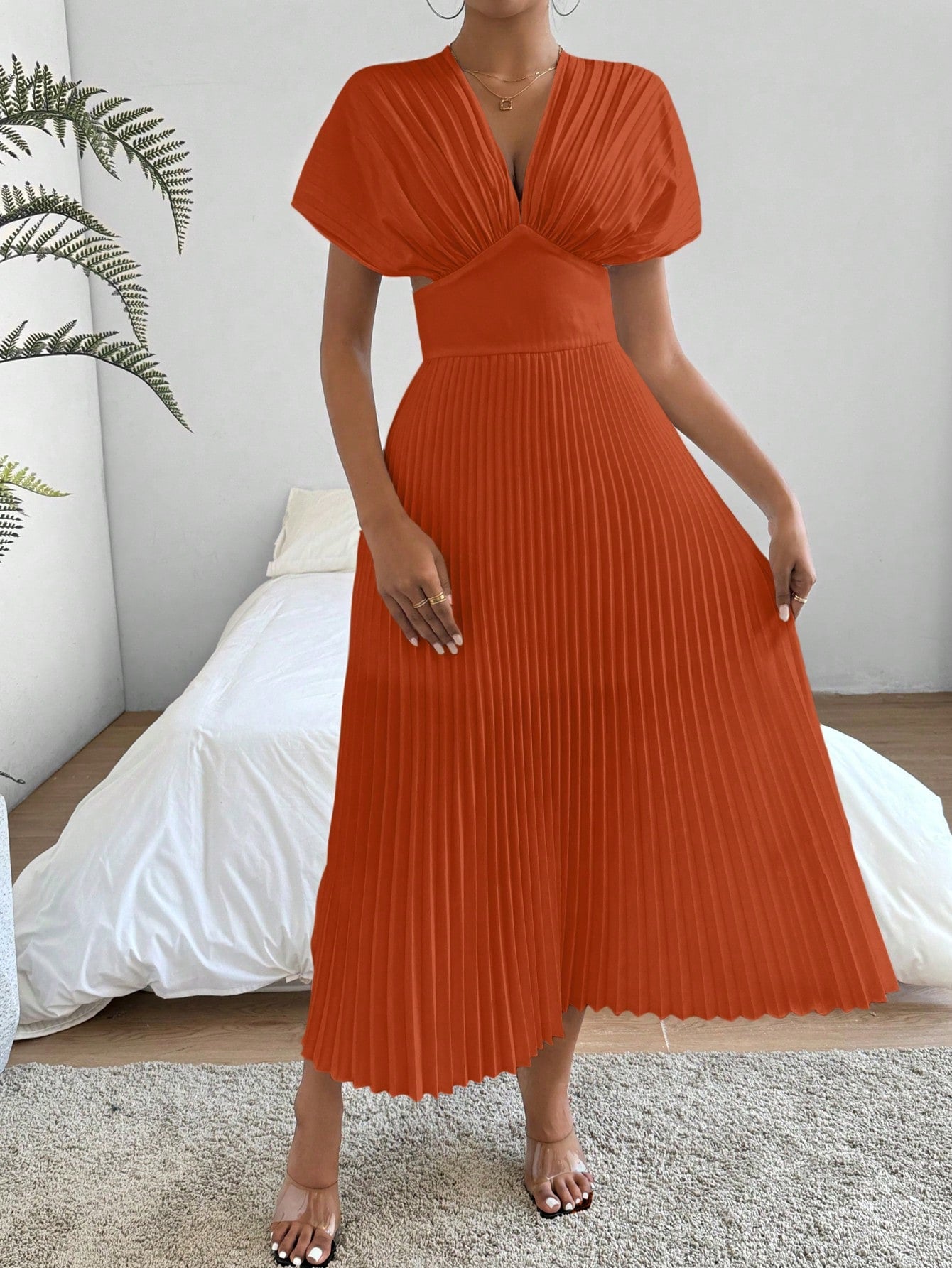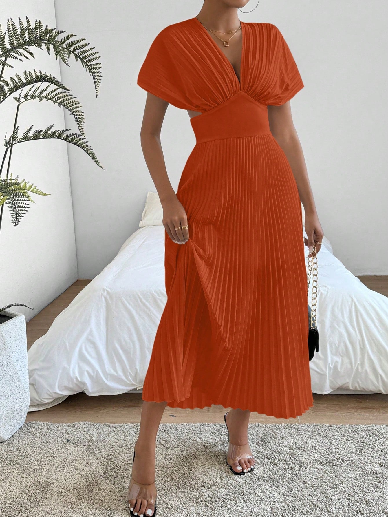 Privï½ Accordion Pleat Waist Cinched Deep V-Neck Dress
