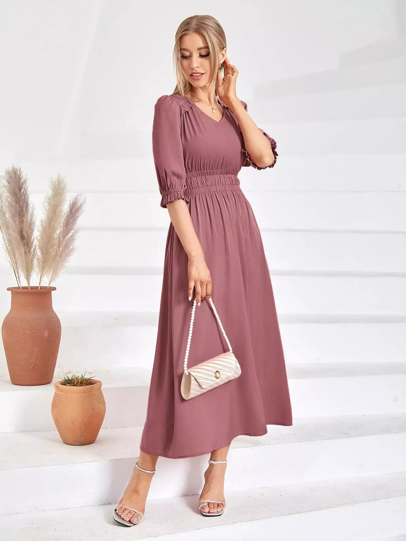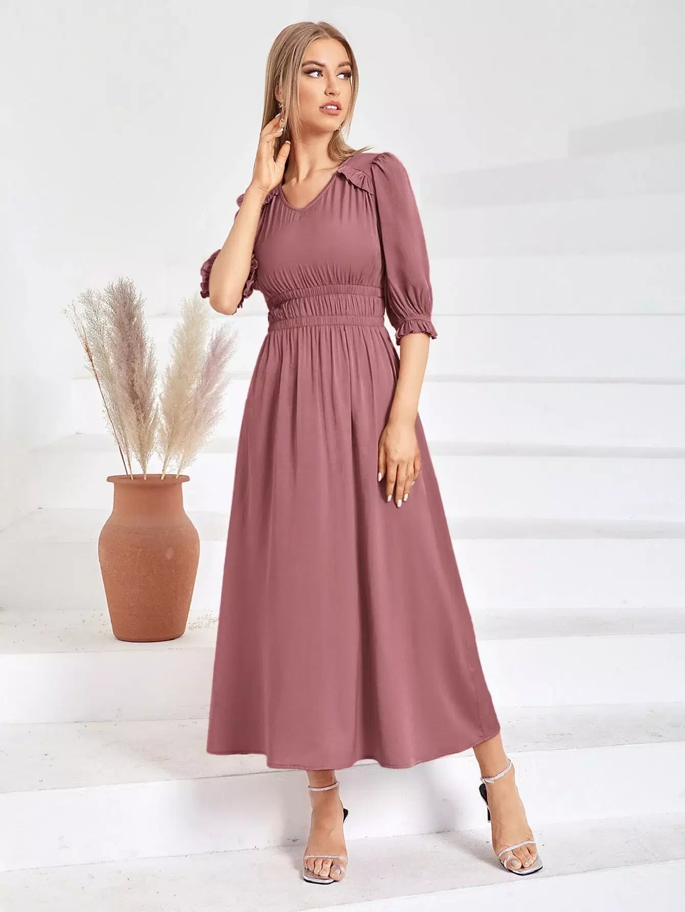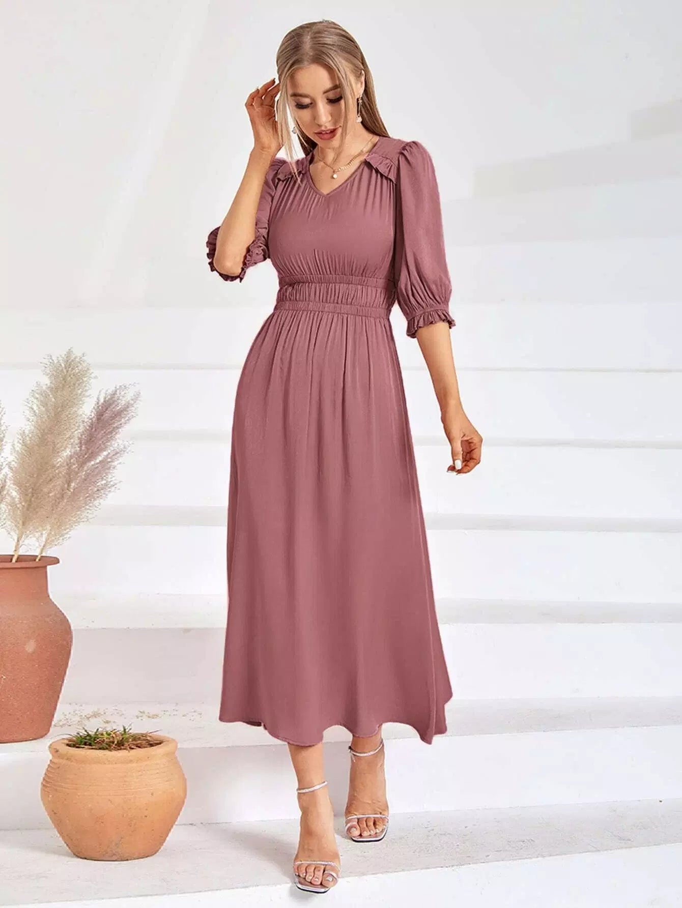 Puff Sleeve Shirred A-line Dress