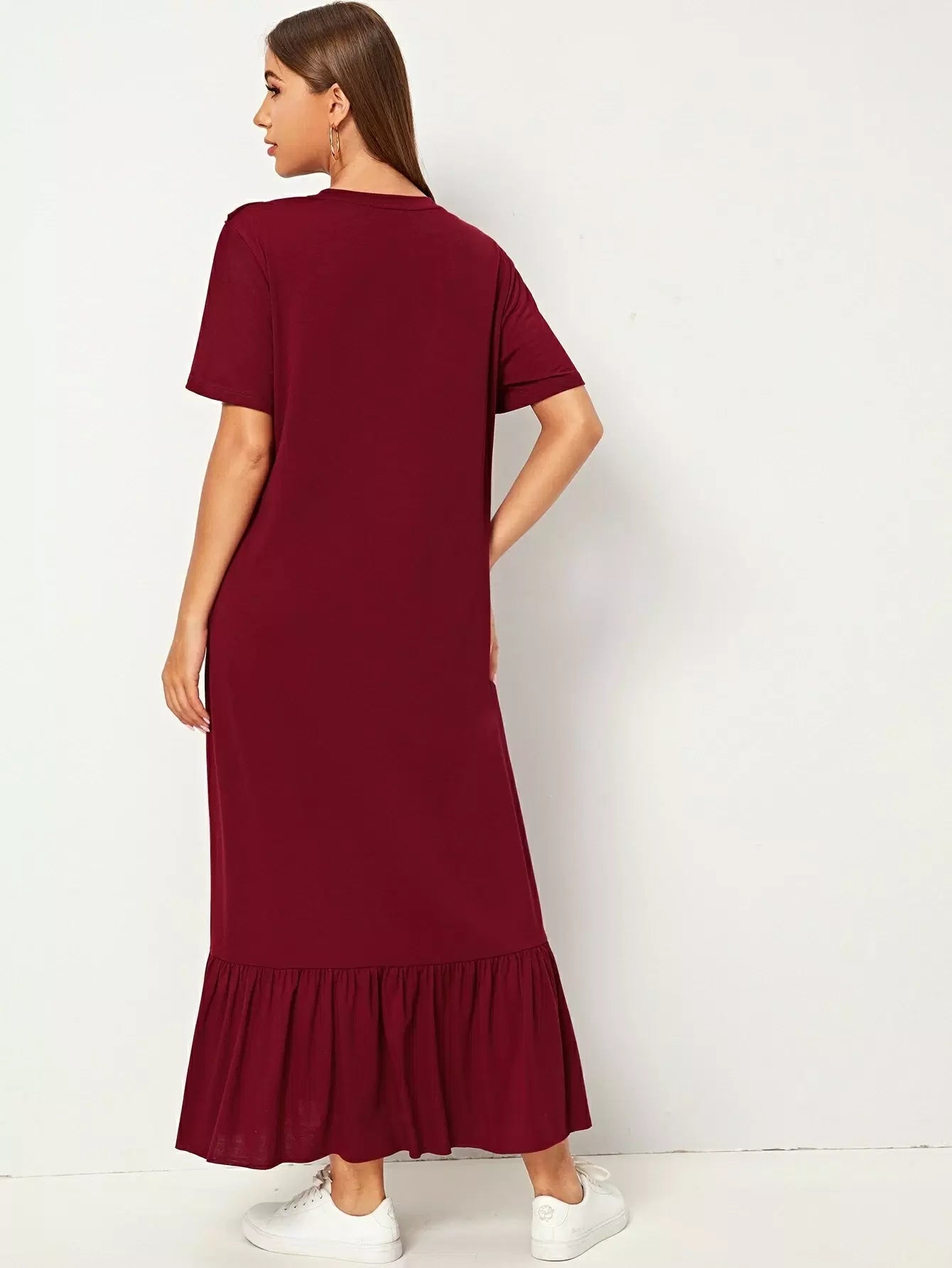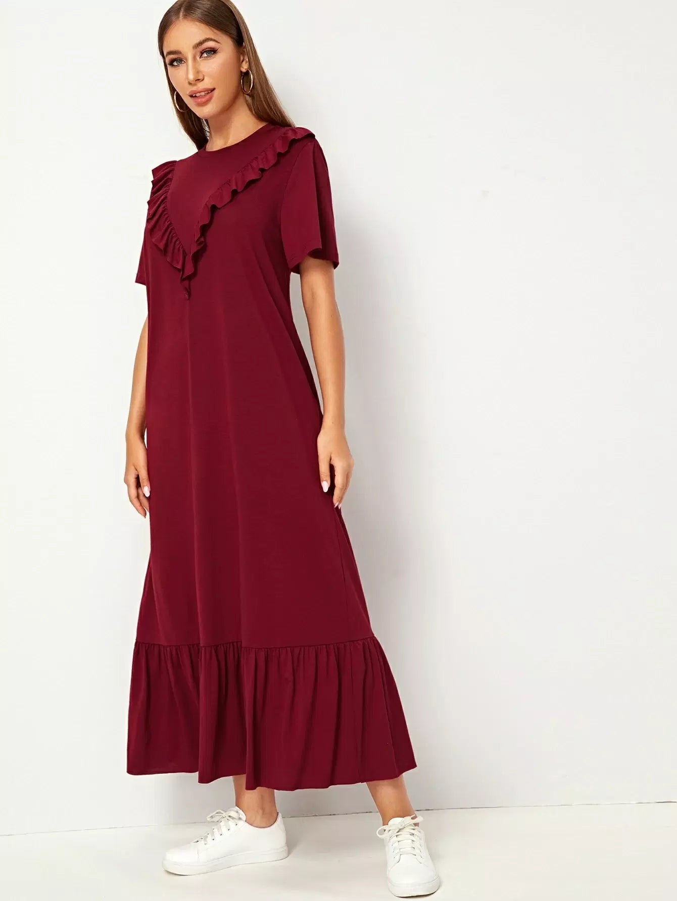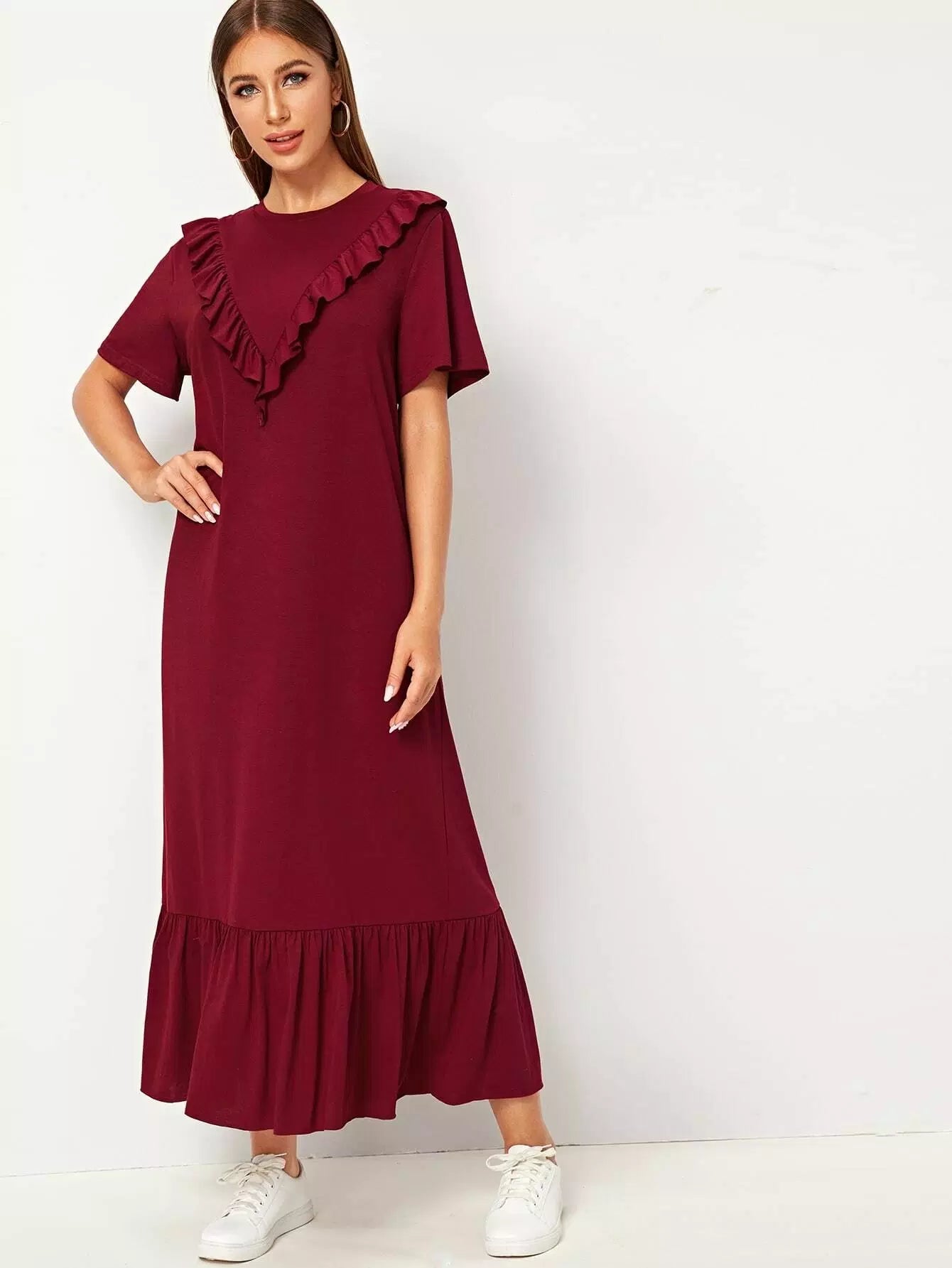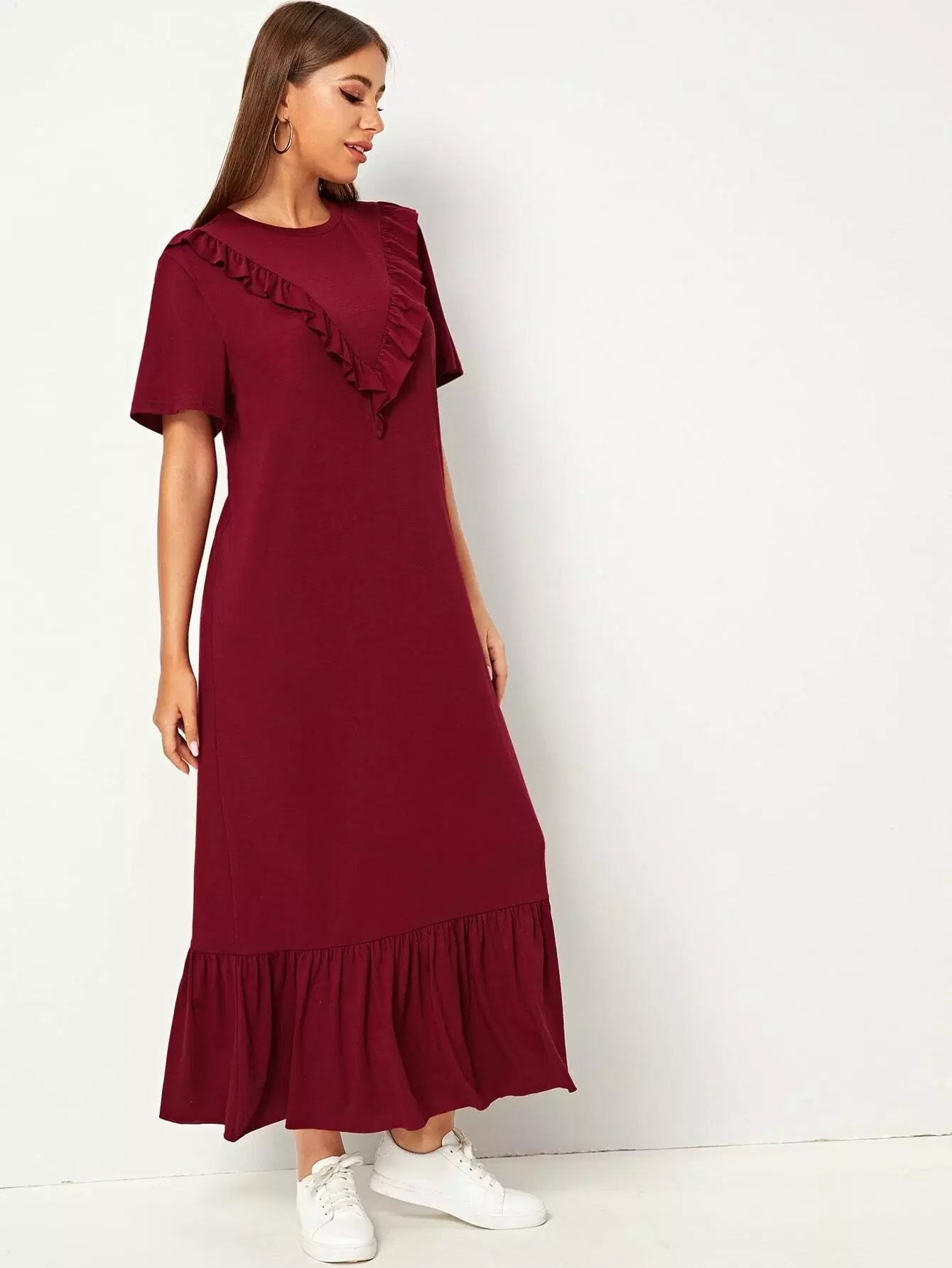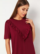 Ruffle Trim Drop Shoulder Solid Dress