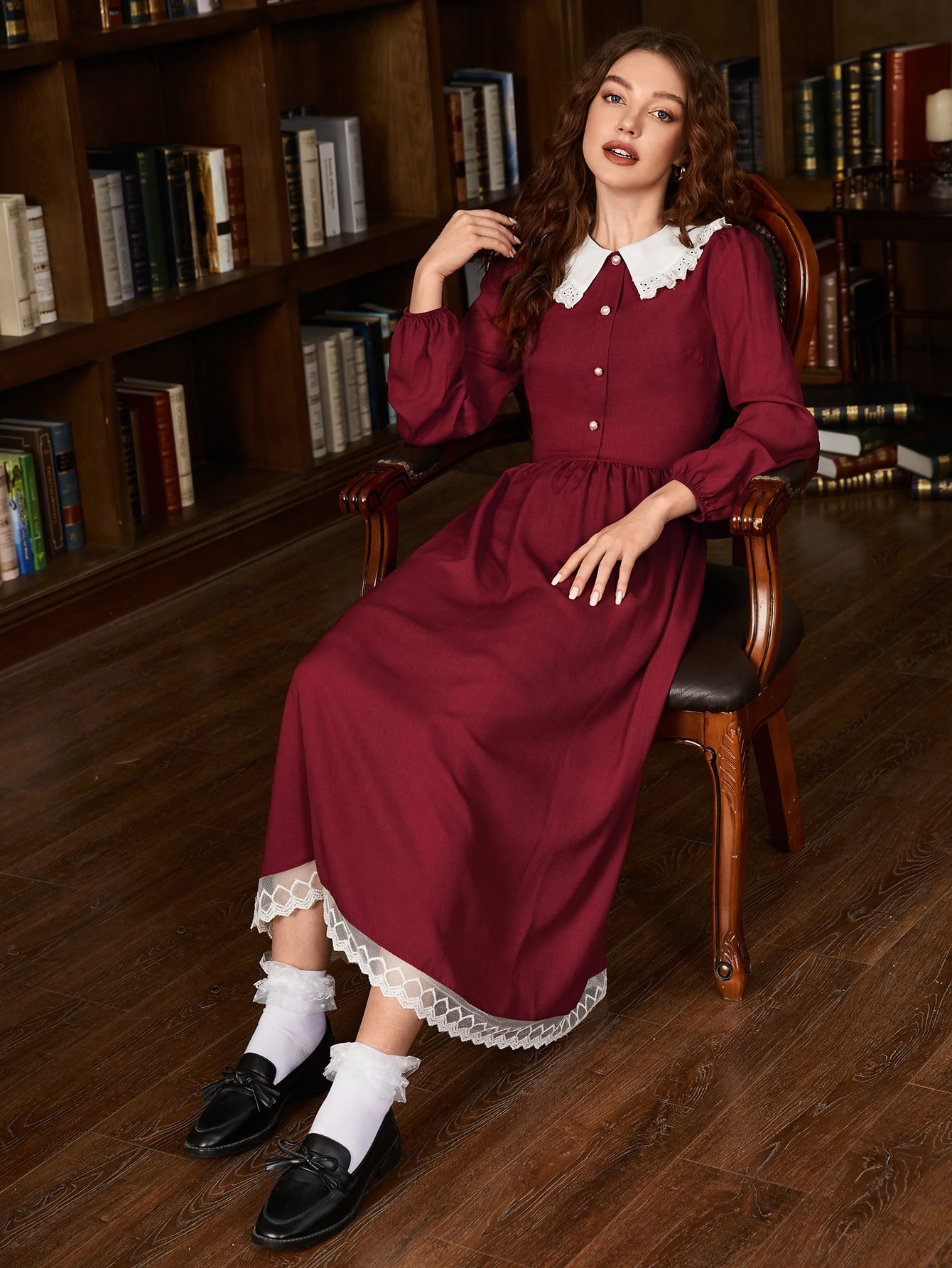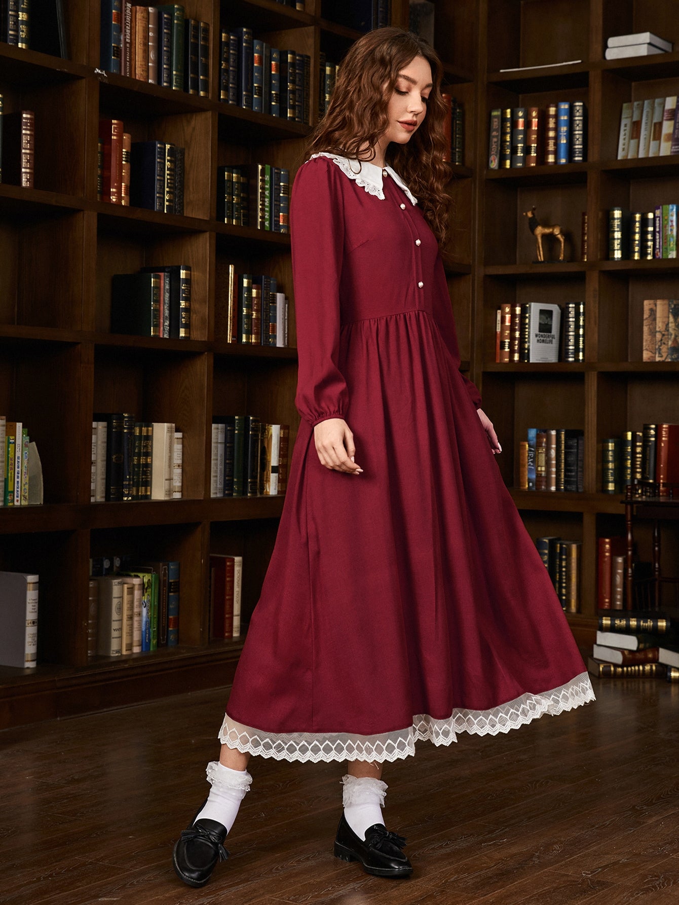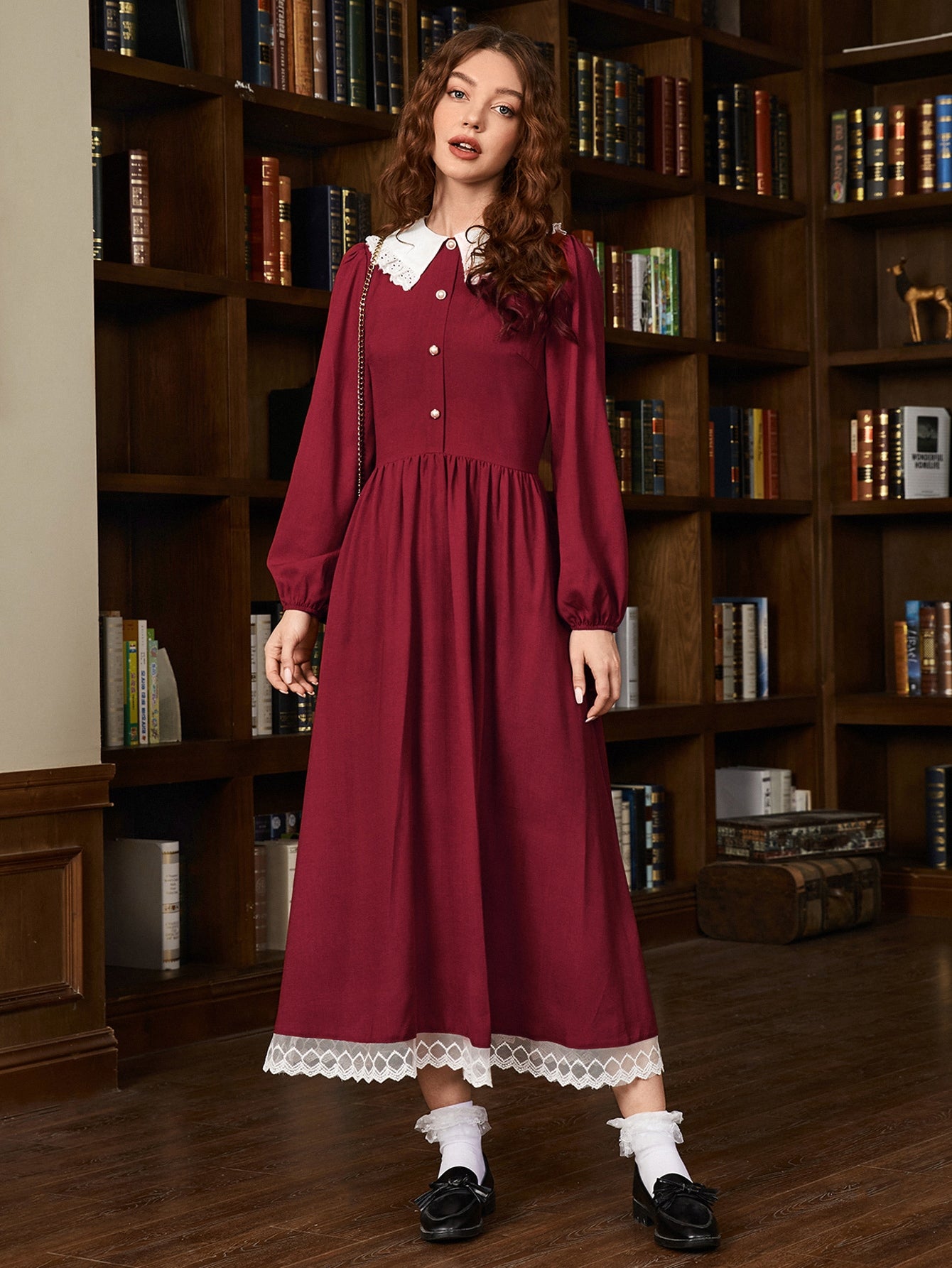 Schiffy Trim Collar Buttoned Front Embroidery Mesh Hem Dress
