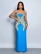 SOLERSUN Women's Elegant Draped Neck Suspender Dress With Palace Style Denim Print