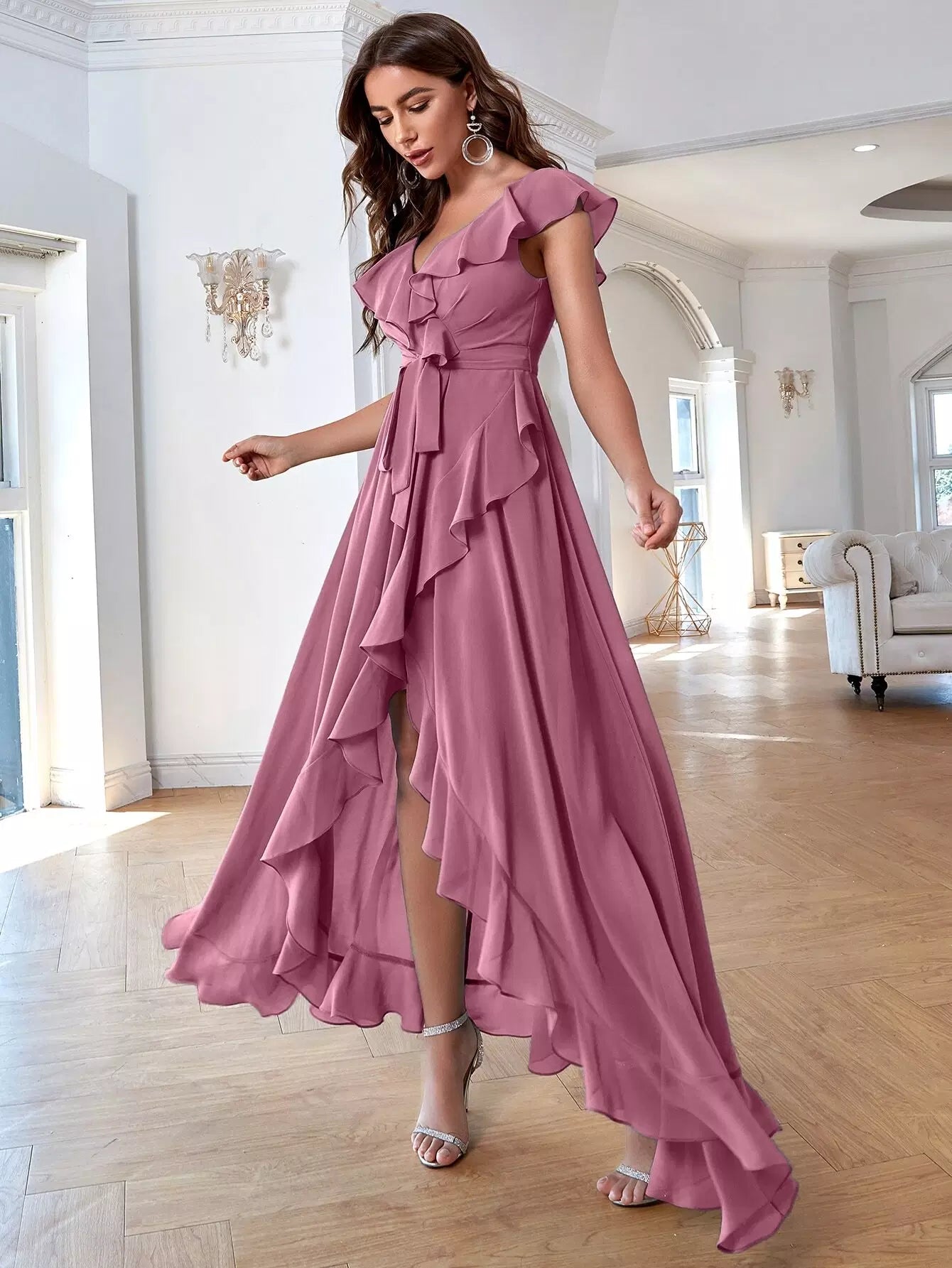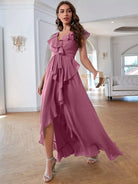 Solid Ruffle Trim Tie Front Asymmetrical Dress