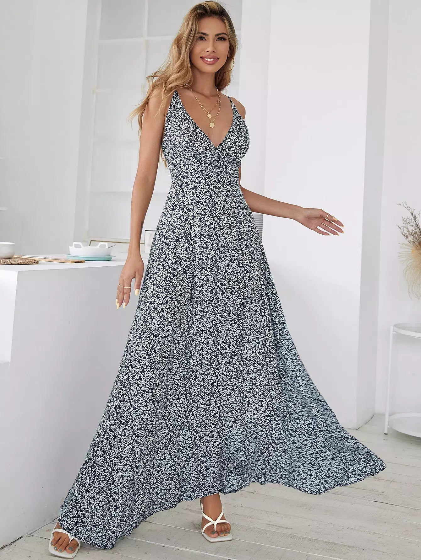 Surplice Neck Tie Back Ditsy Floral Cami Dress