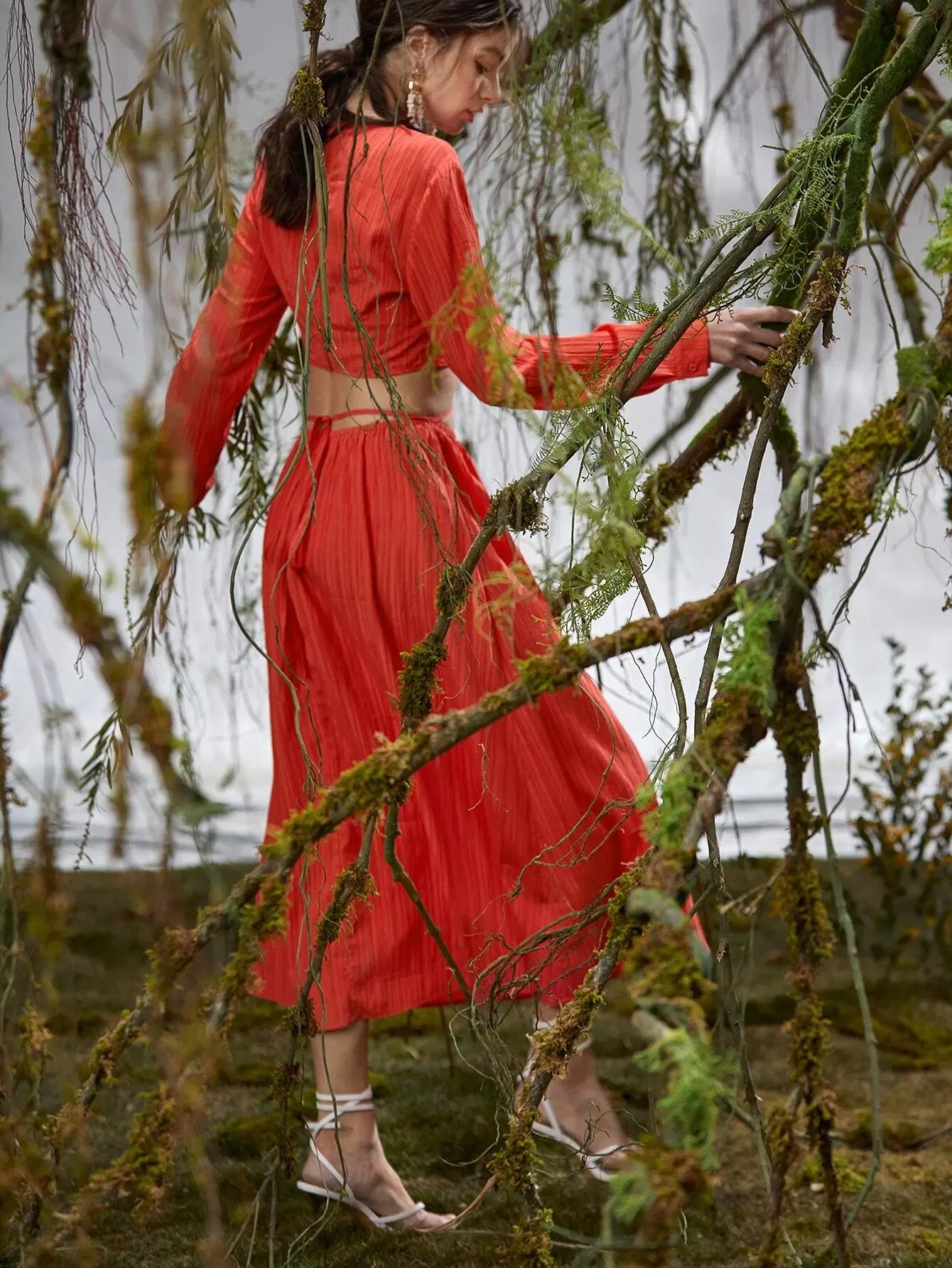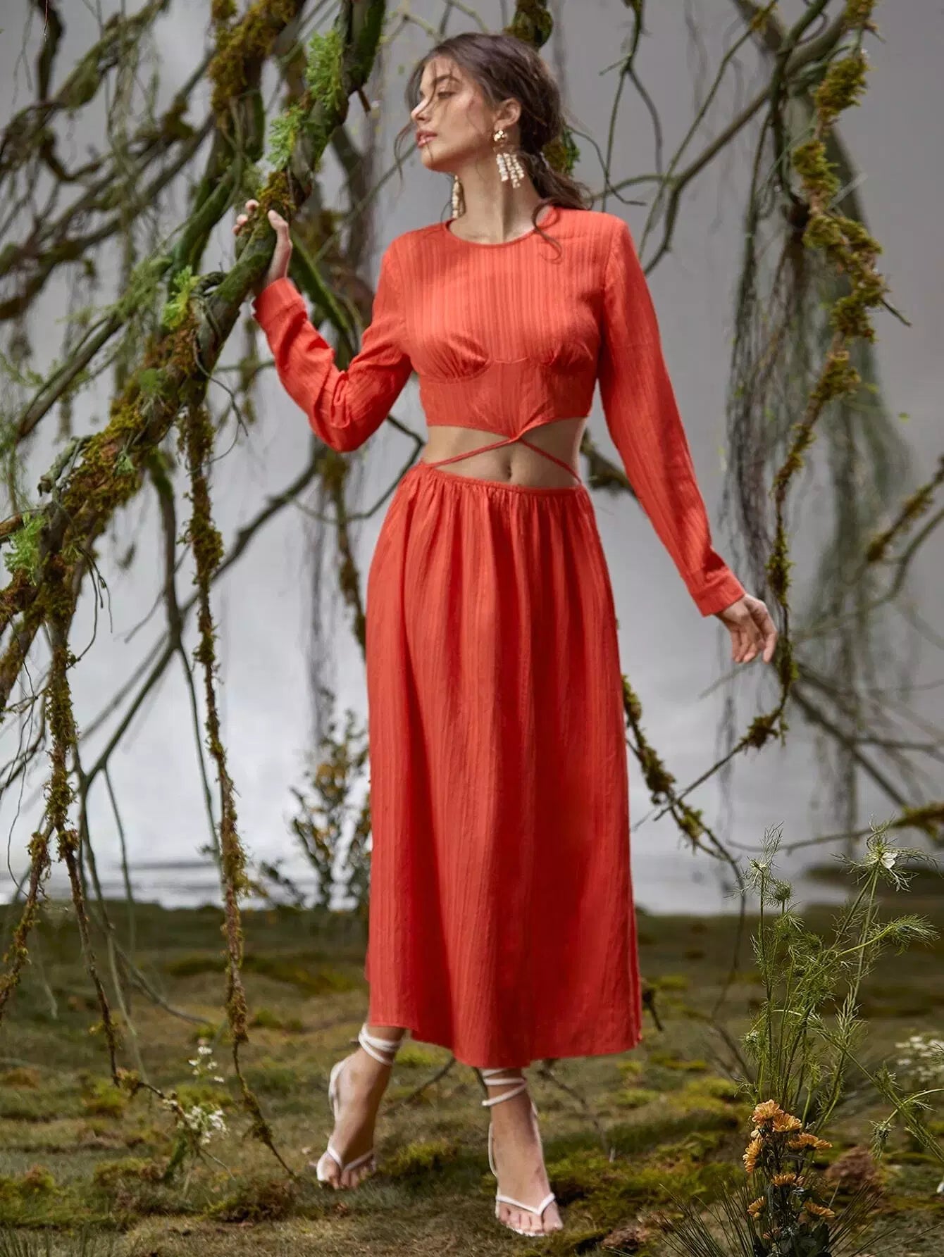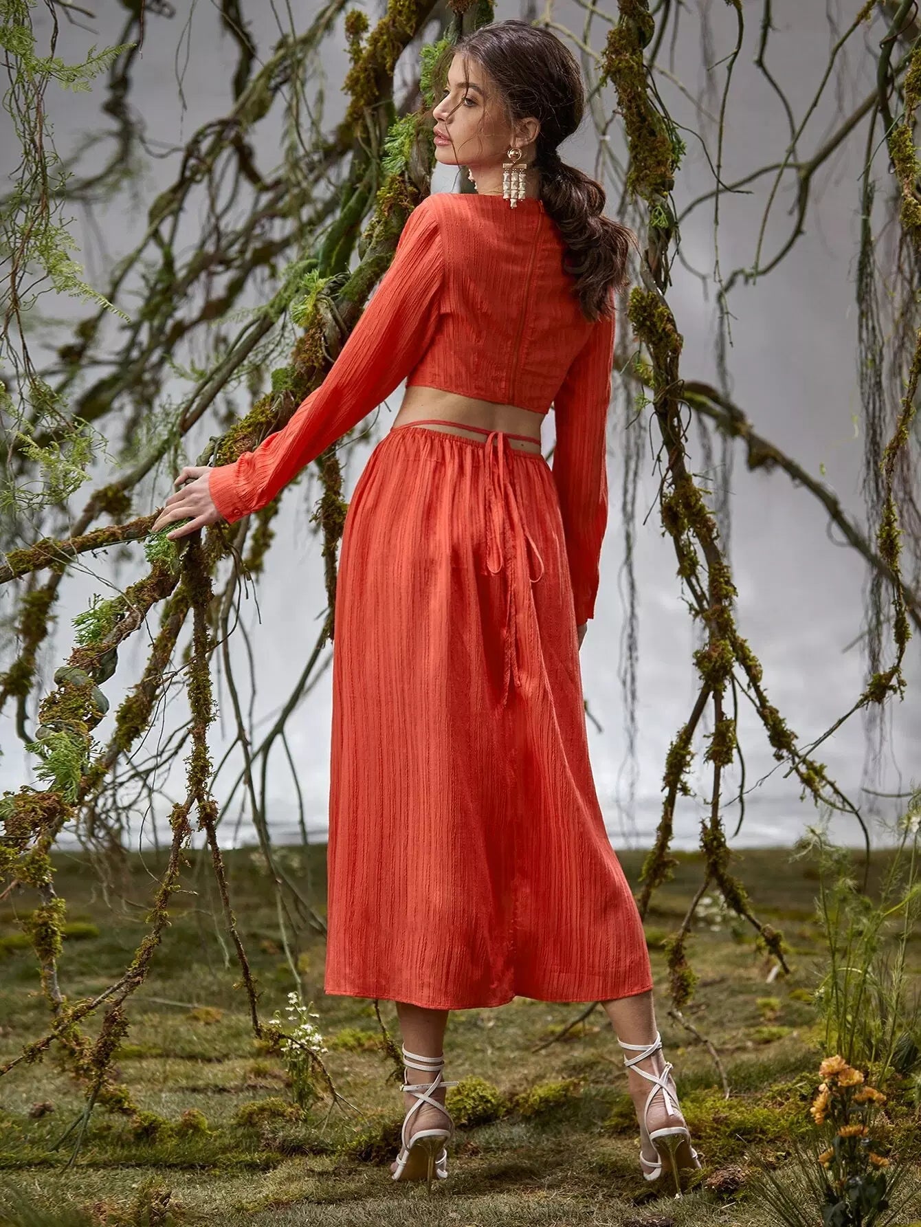 Zipper Back Crisscross Tie Back Cutout Waist Textured Dress