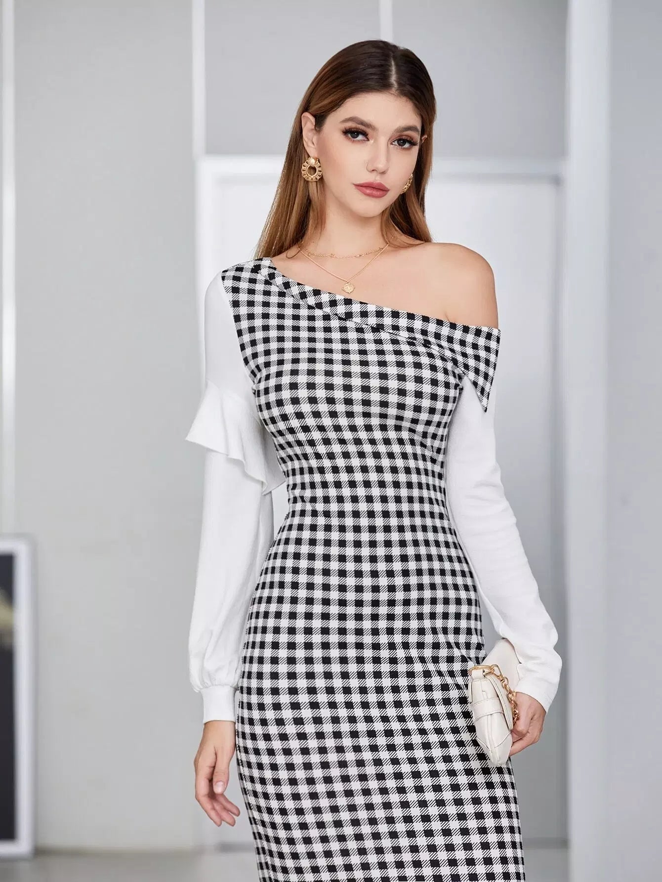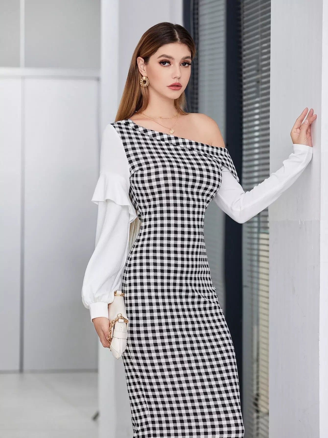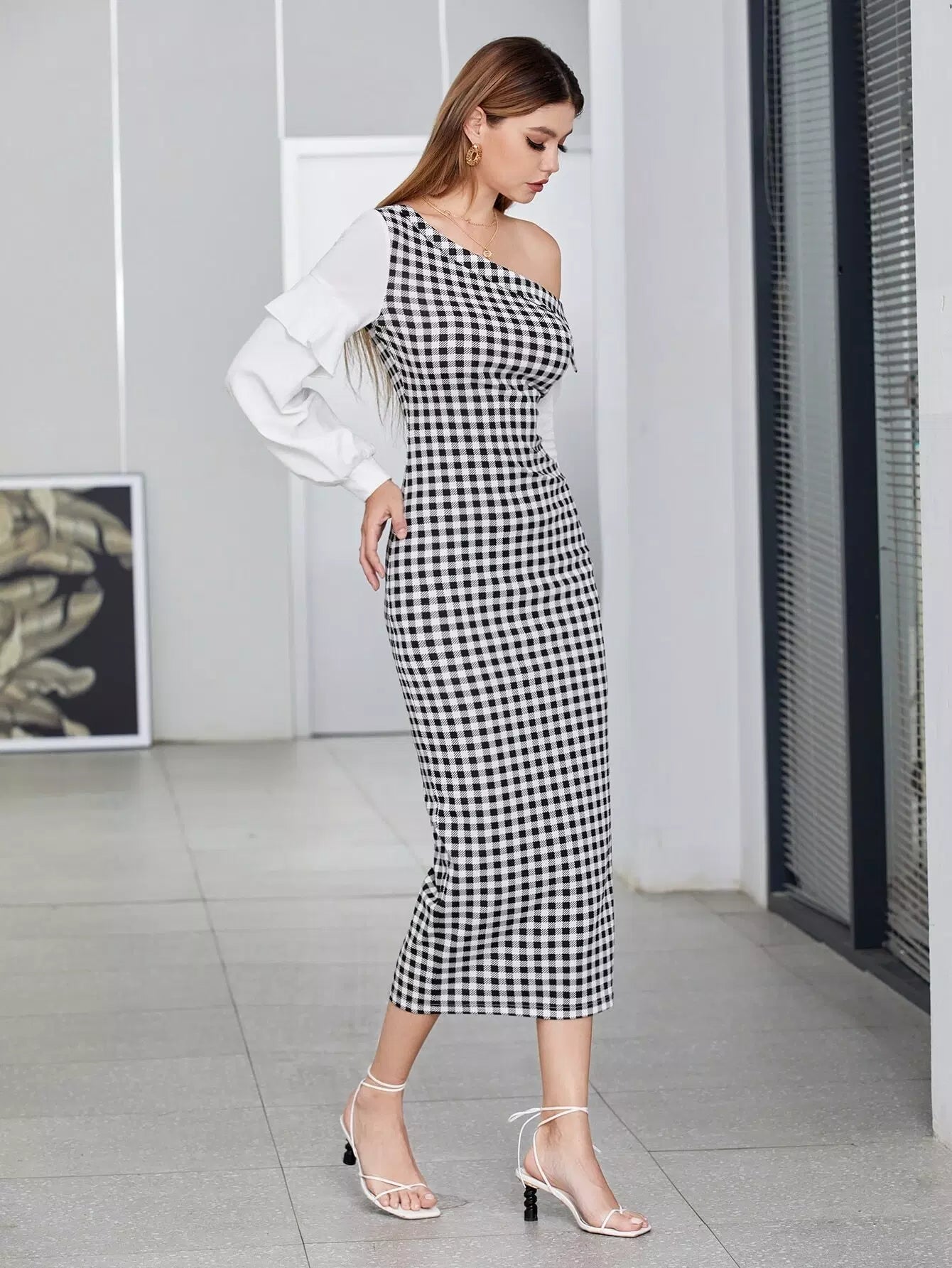 Asymmetrical Neck Gingham Ruffle Trim Dress