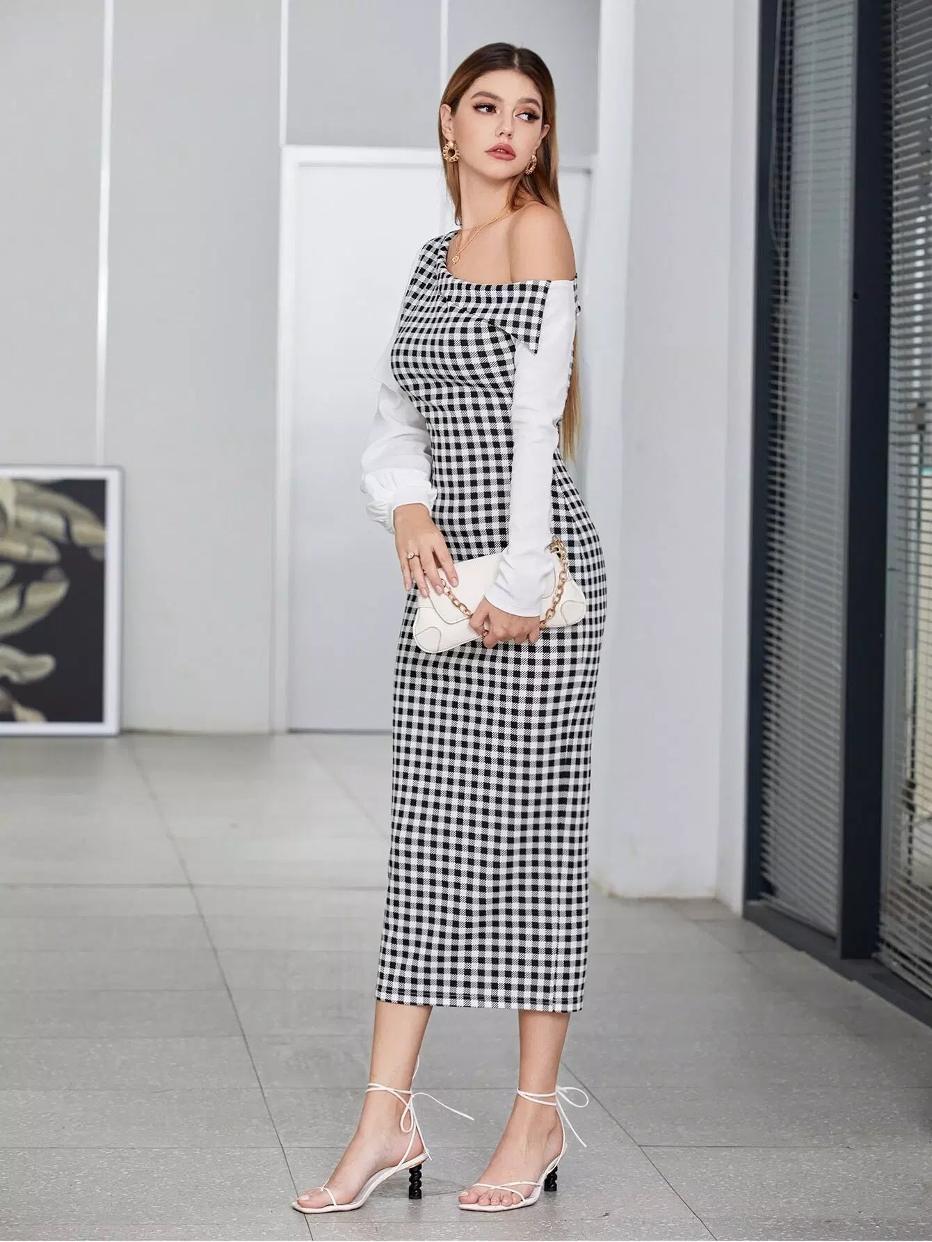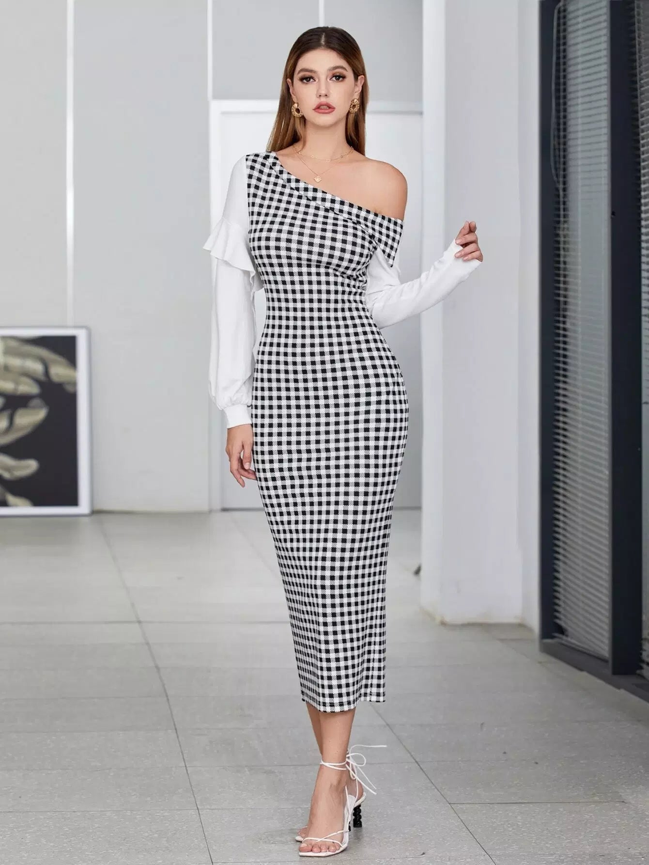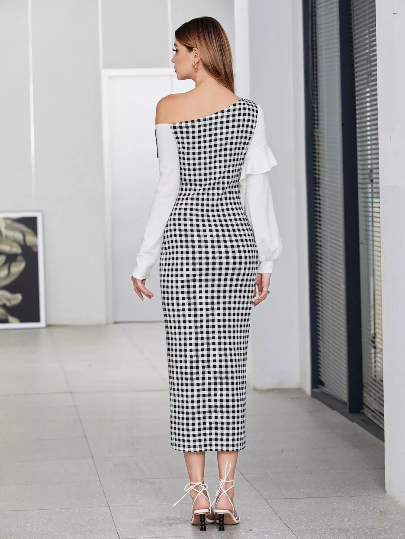 Asymmetrical Neck Gingham Ruffle Trim Dress