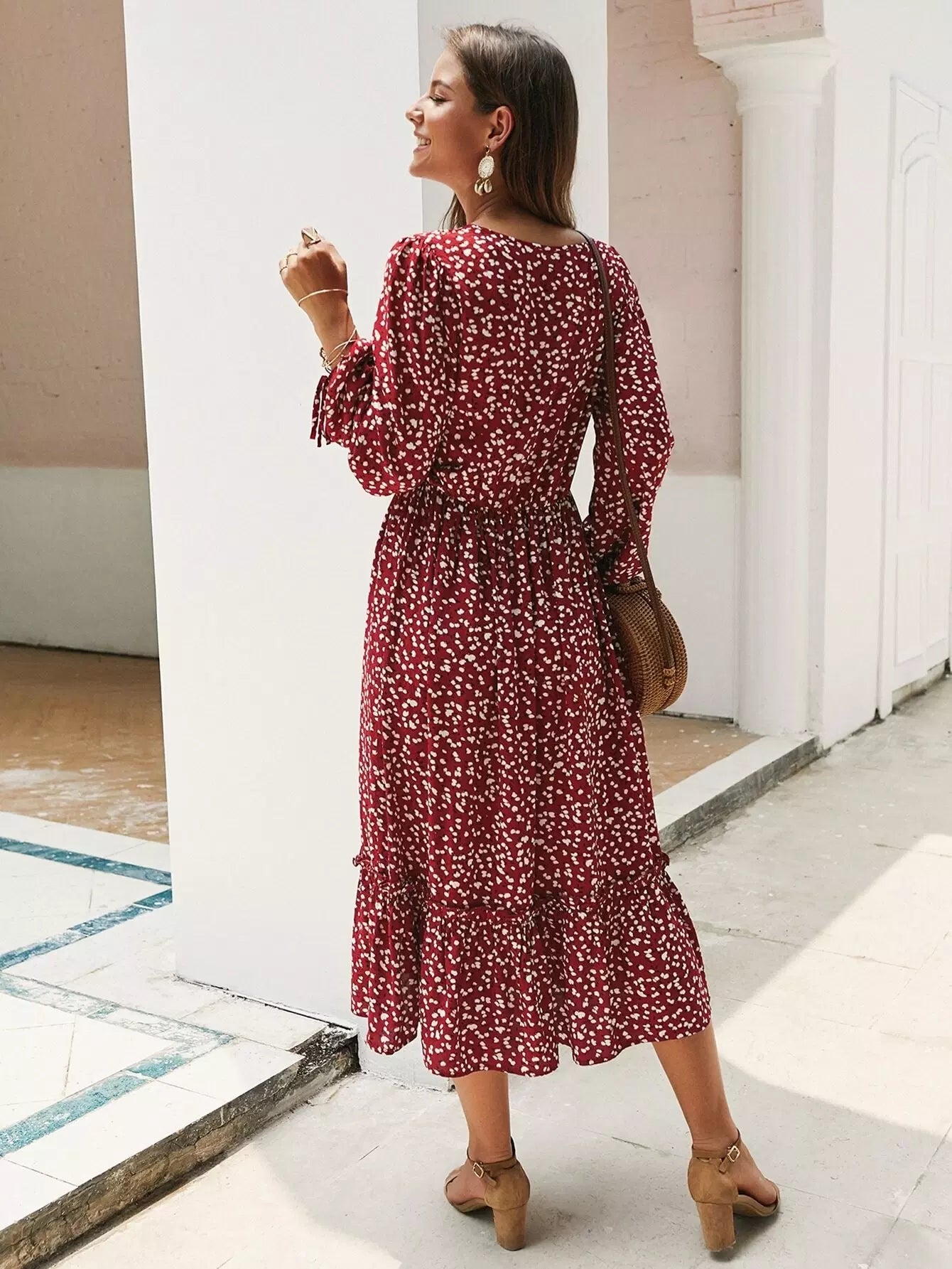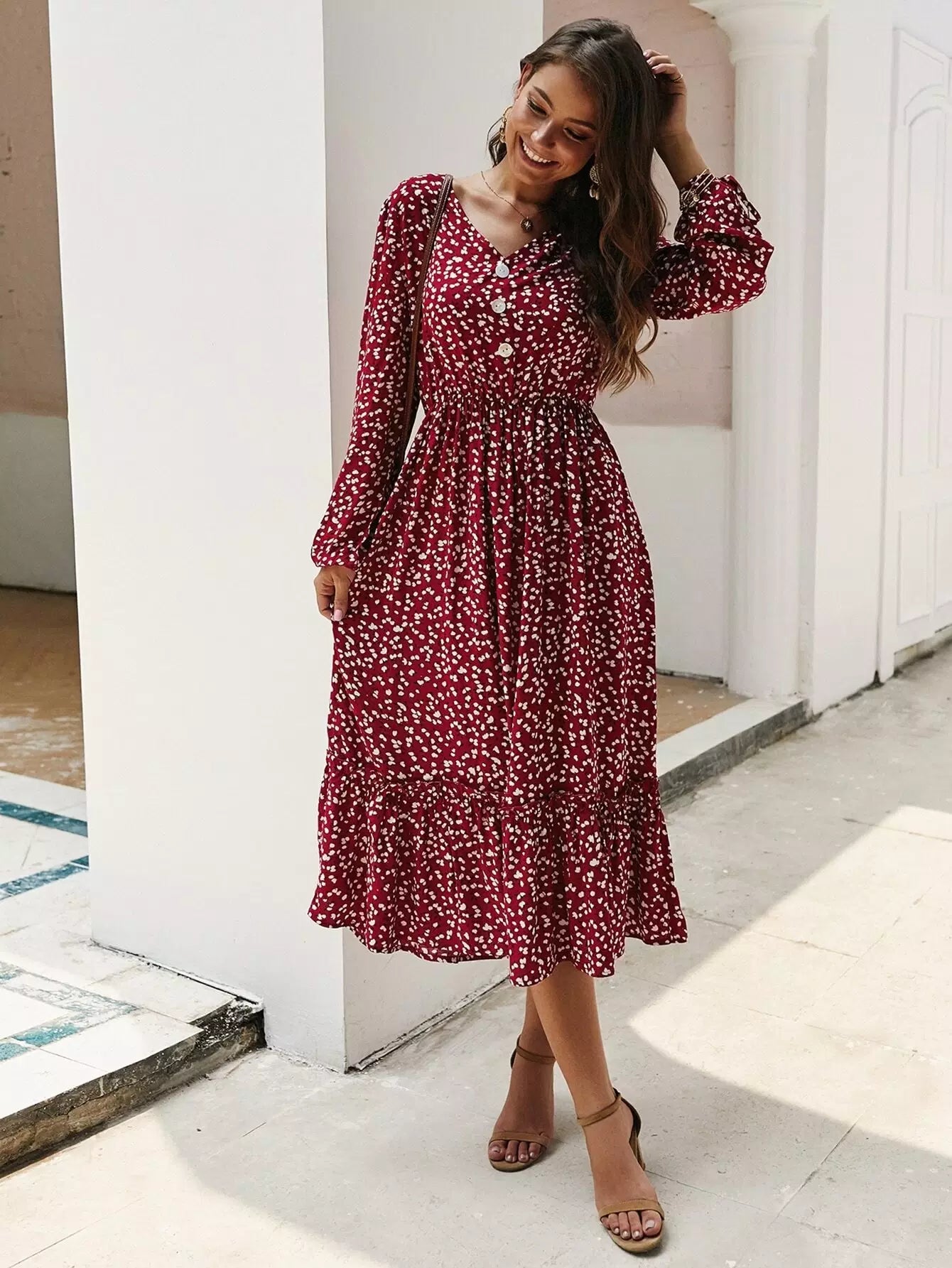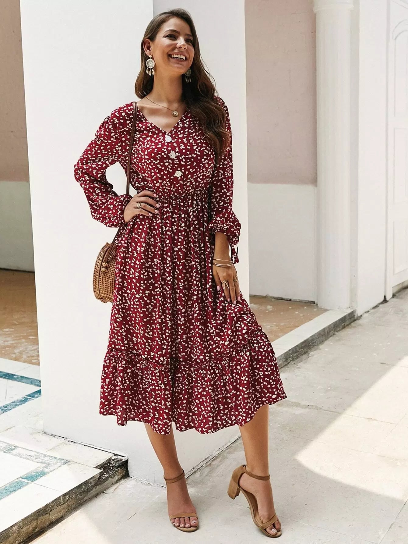 Button Front Ditsy Floral Print Ruffle Hem Dress
