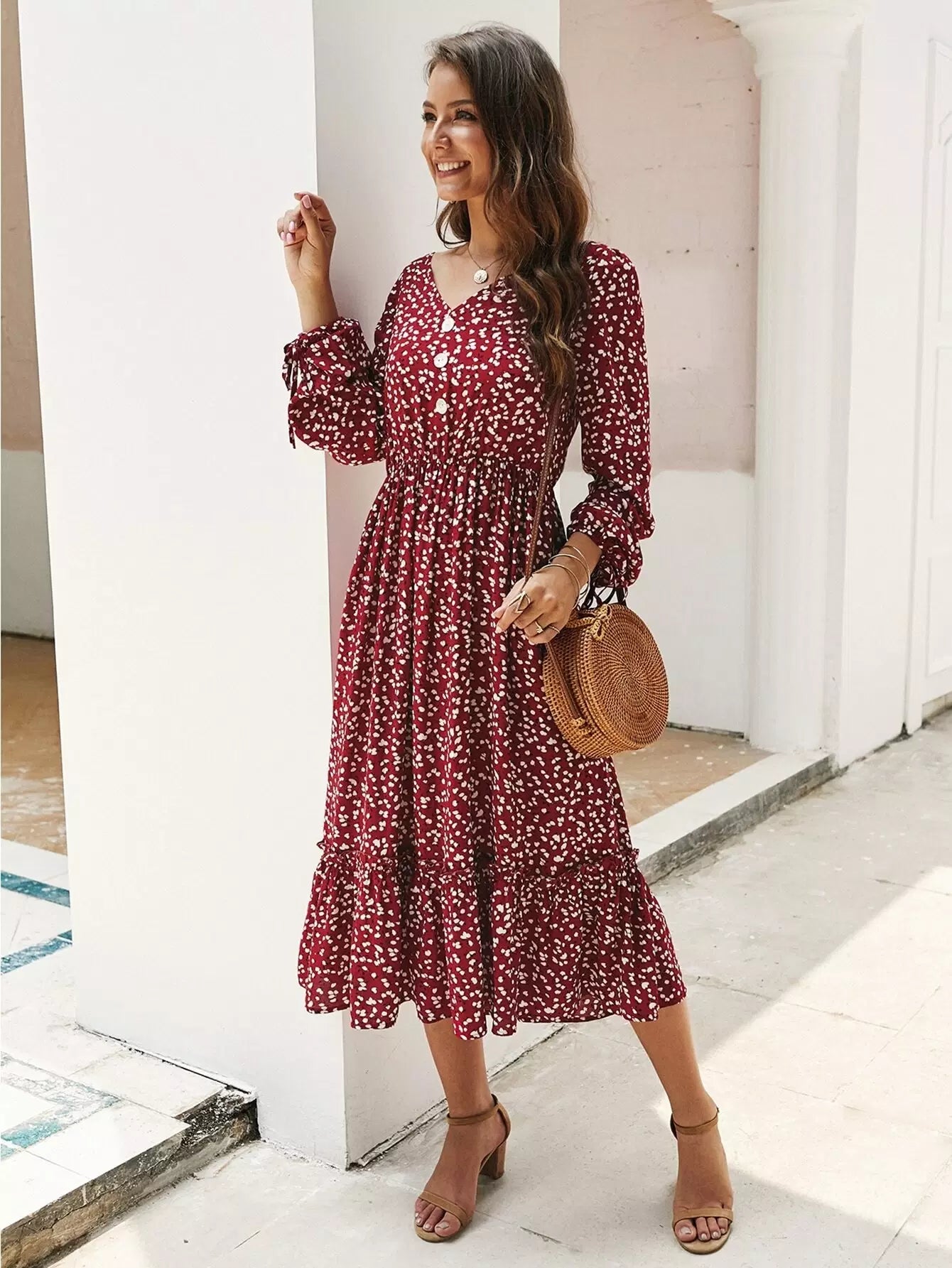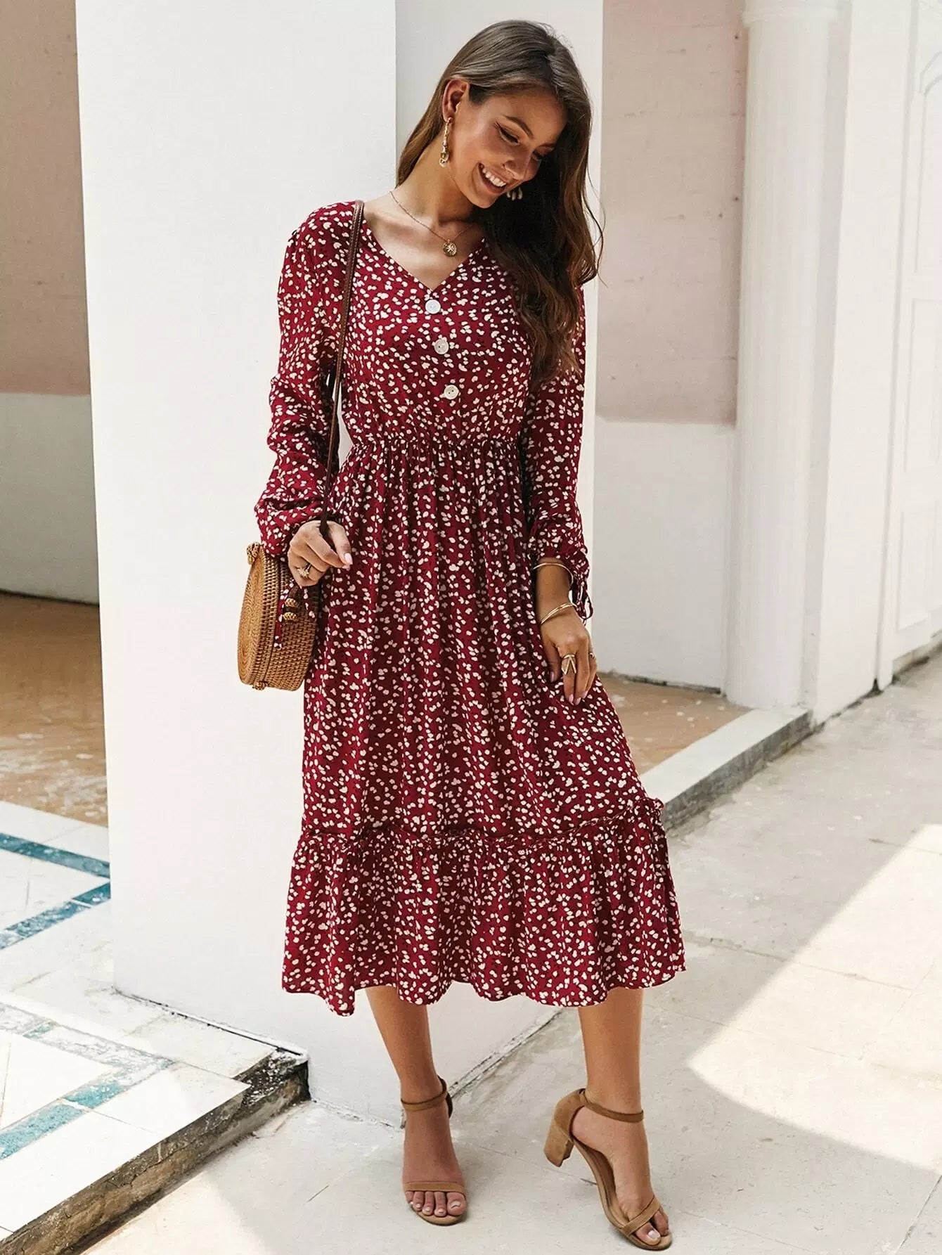 Women - Button Front Ditsy Floral Print Ruffle Hem Dress