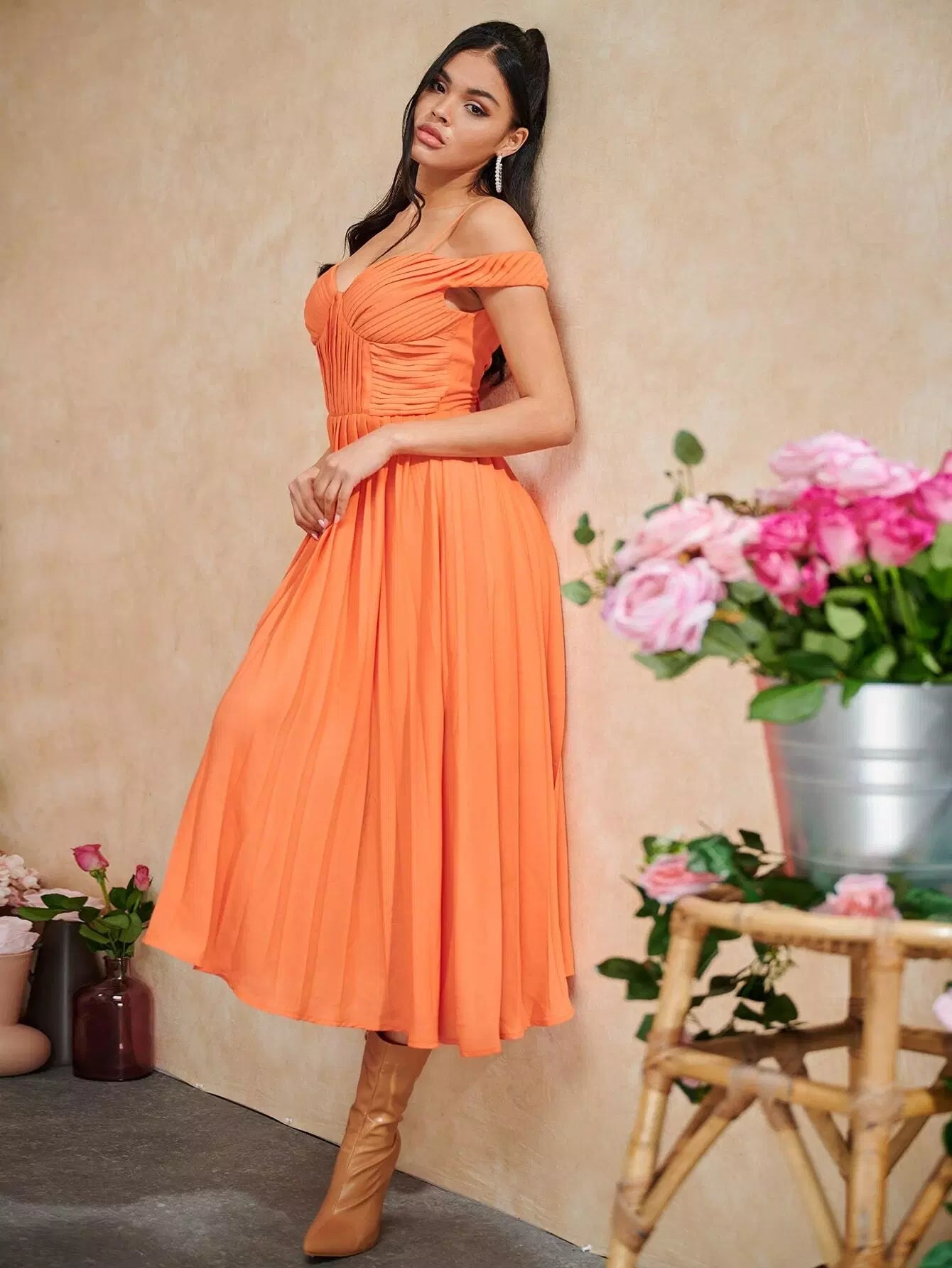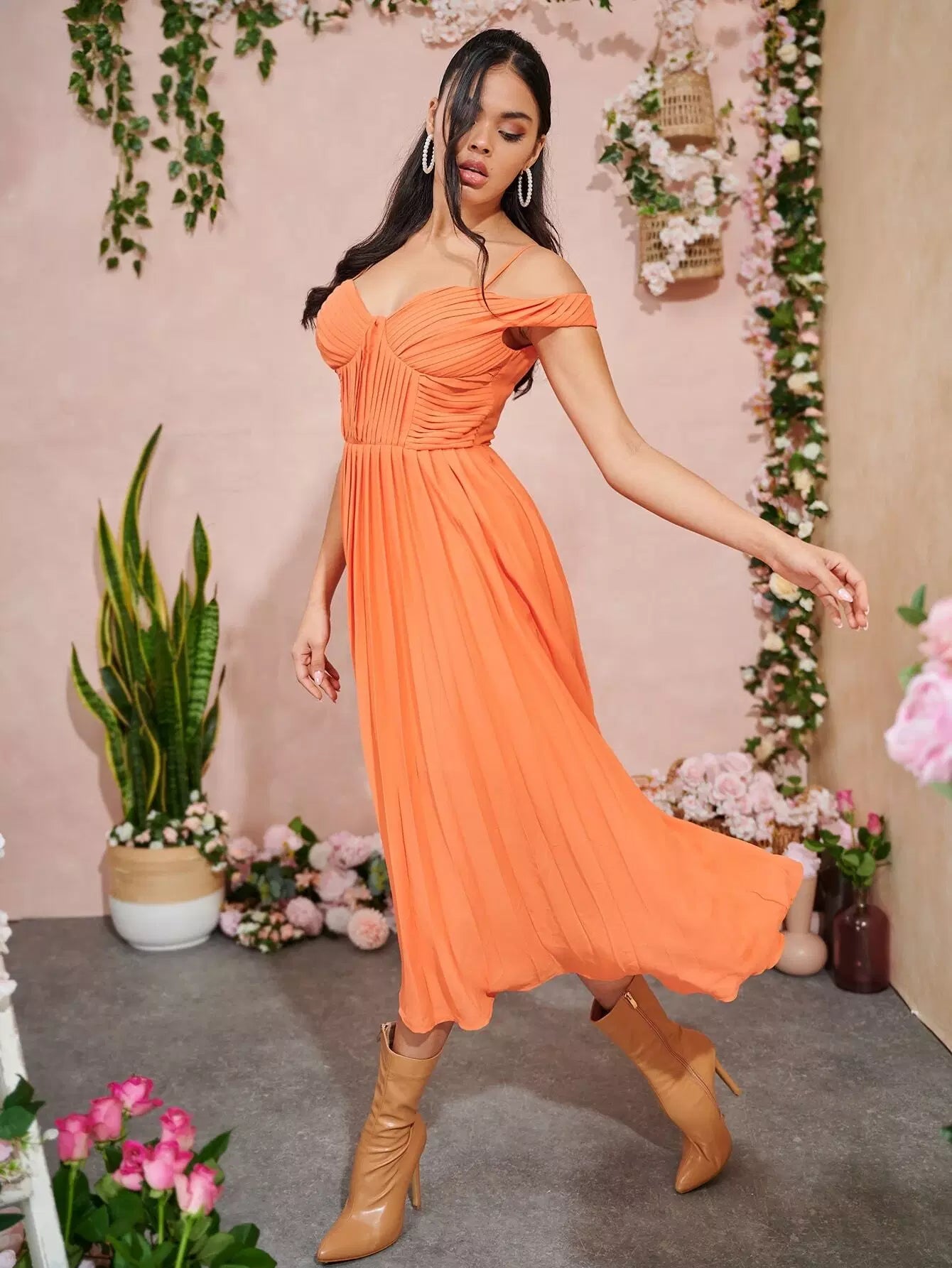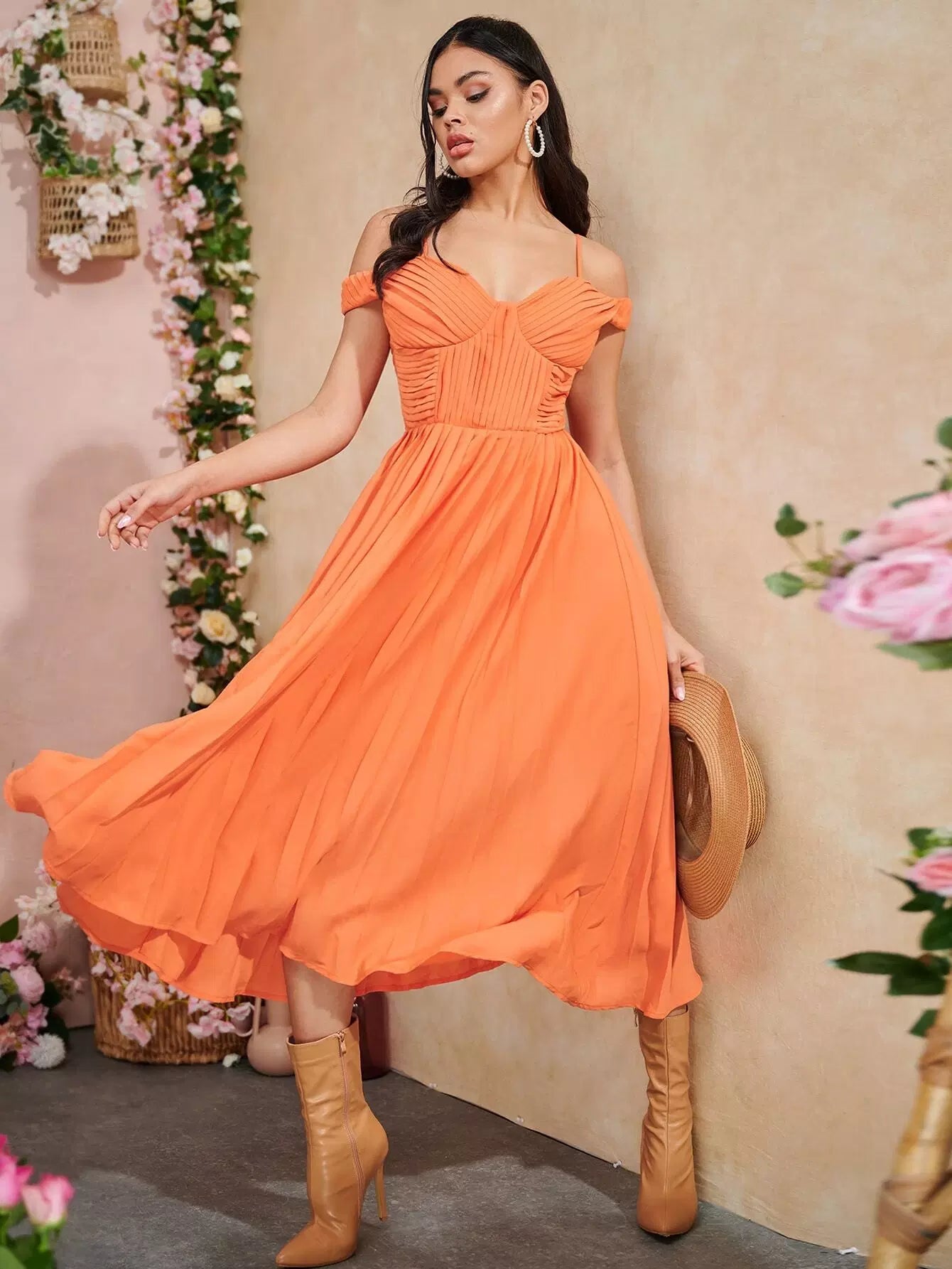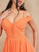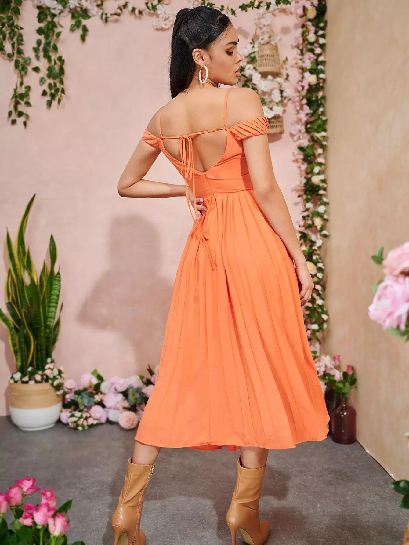 Cold Shoulder Tie Backless Pleated Detail Flare Hem Dress