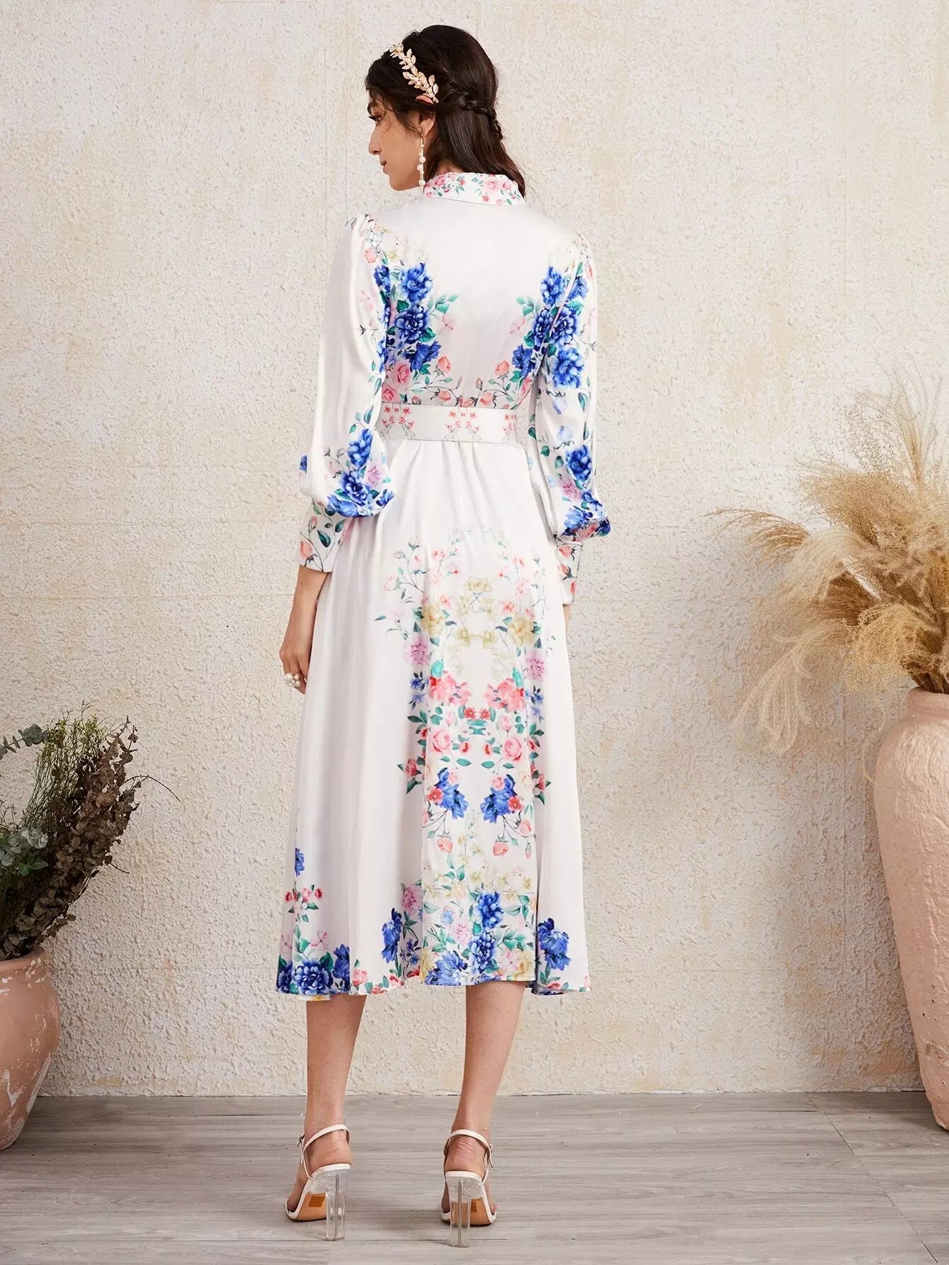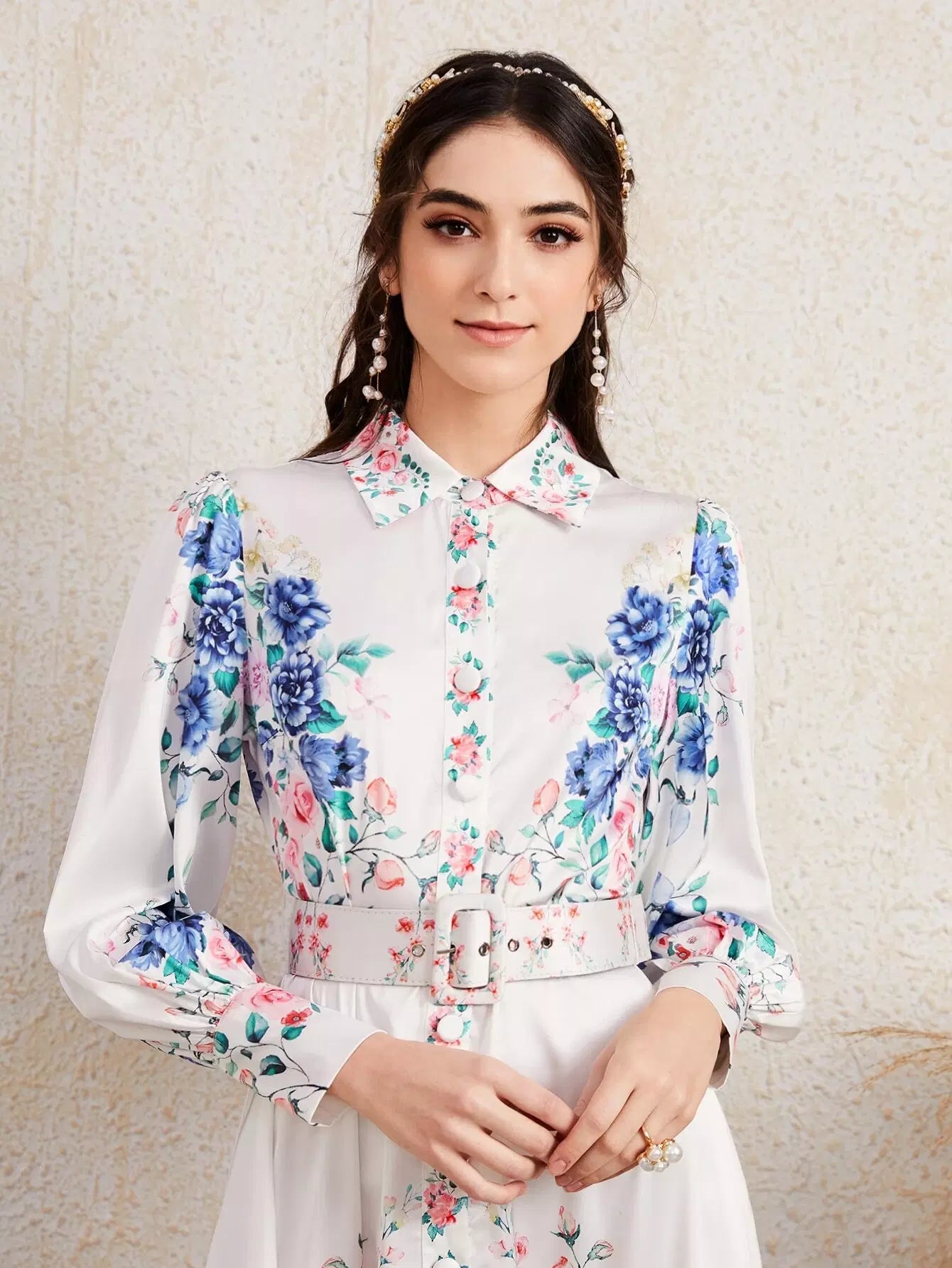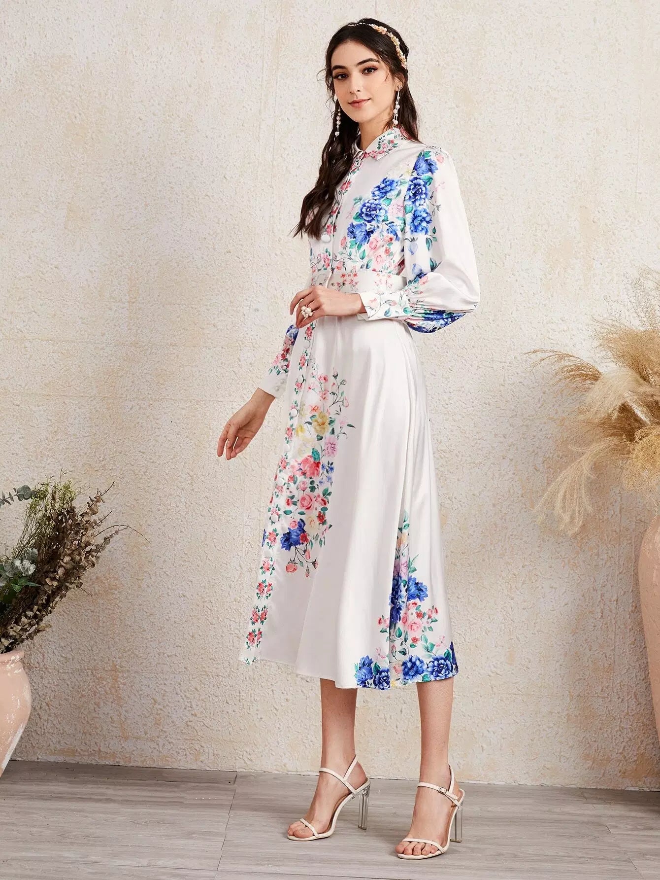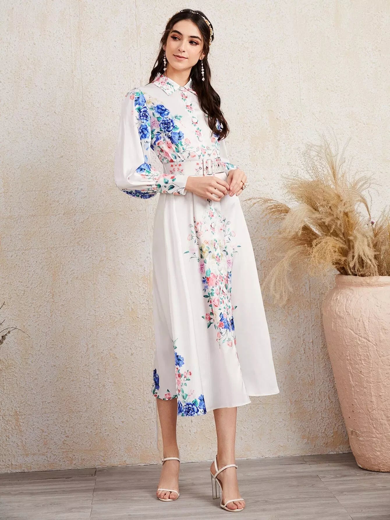 Women - Collared Buttoned Front Buckle Belted Floral Dress