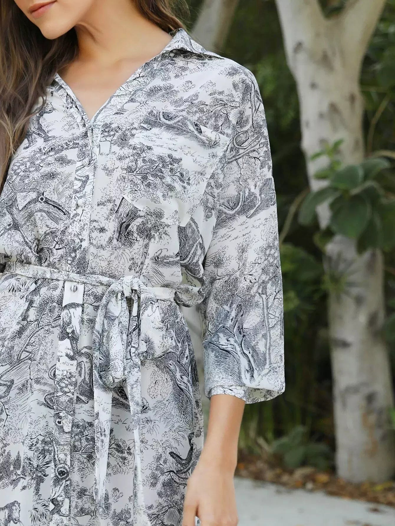 Collared Pocket Front Split Side Landscape Print Shirt Dress