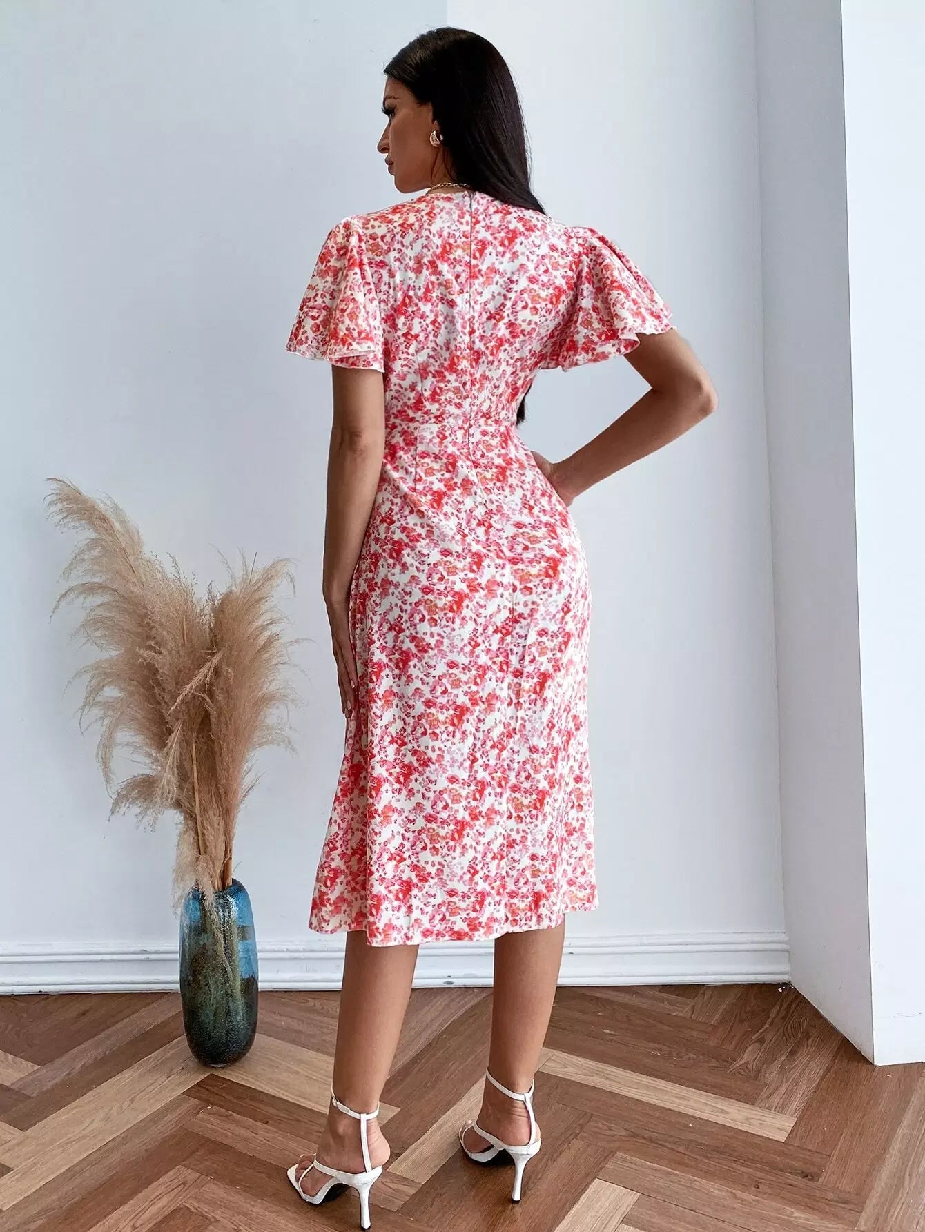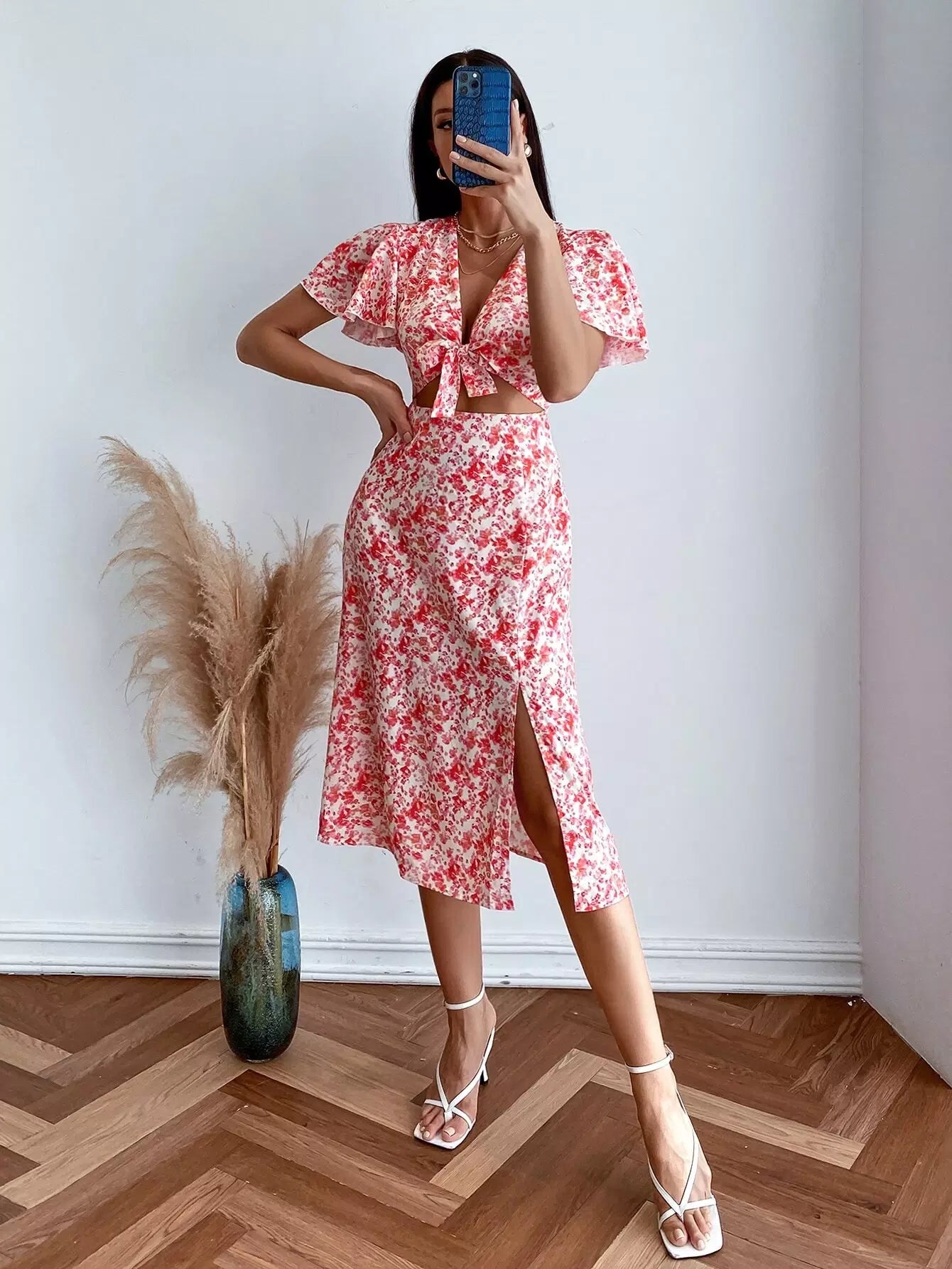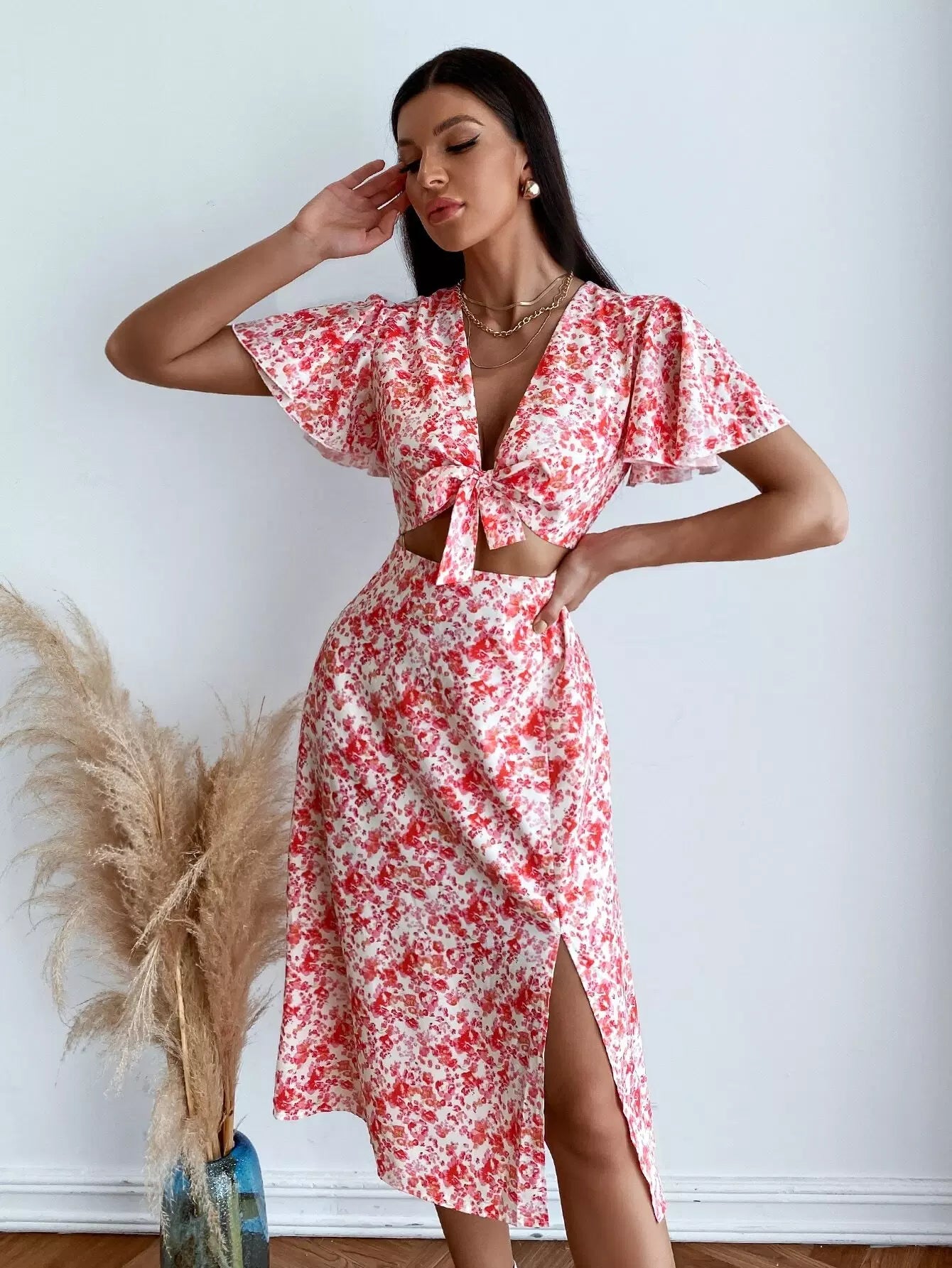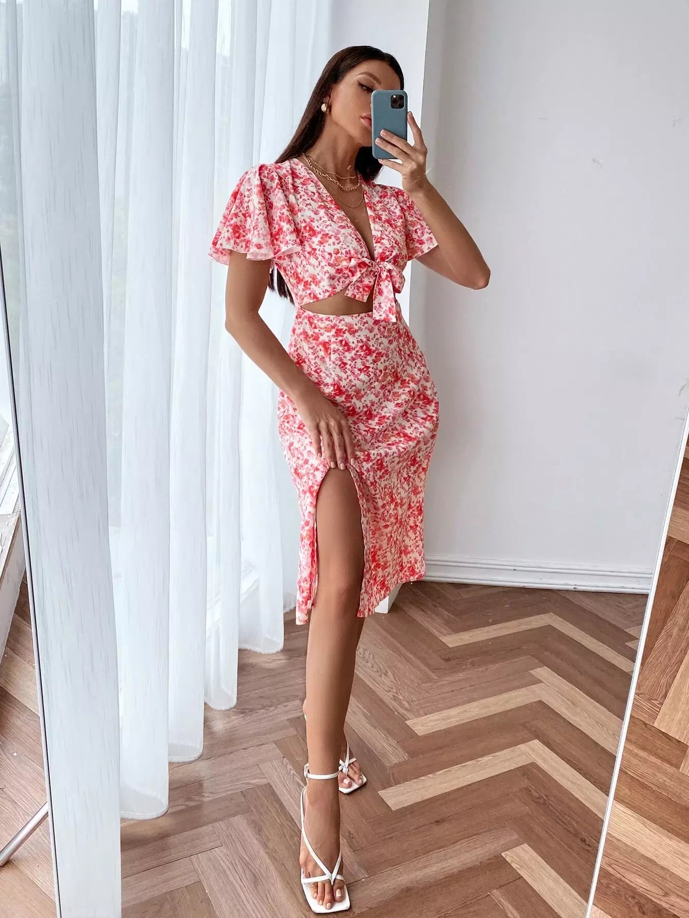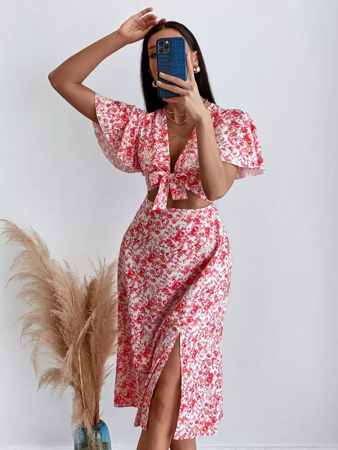Ditsy Floral Butterfly Sleeve Knot Bust Split Hem Dress